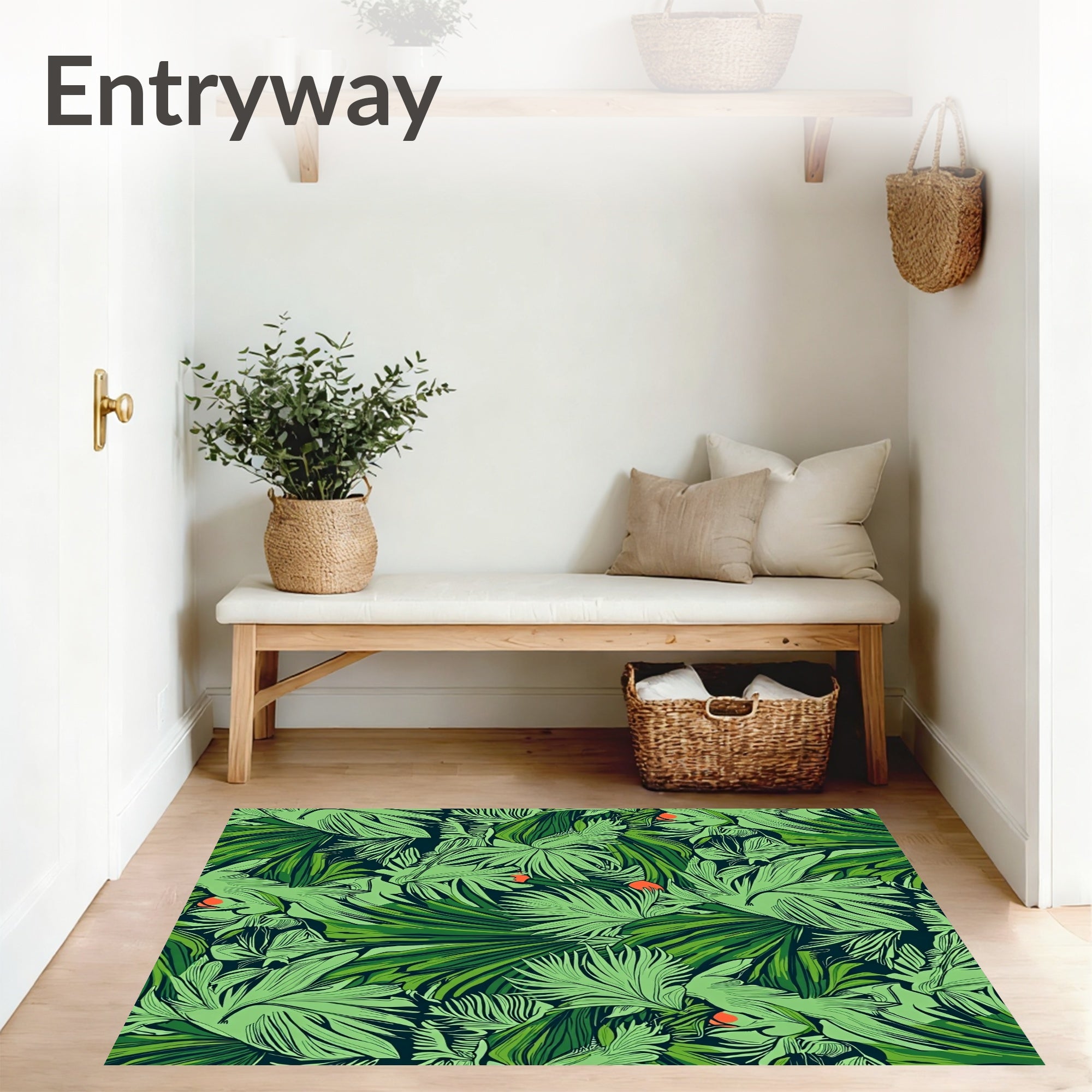 Bring the restorative energy of the outdoors inside with this Lush Green Tropical Foliage Area Rug. This modern botanical masterpiece features a dense canopy of oversized palm and monstera leaves in a vibrant spectrum of forest, mint, and teal, punctuated by subtle pops of coral warmth. Perfect for high-traffic living rooms or sun-drenched offices, its construction is as functional as it is beautiful. This Durable rug is fully Machine Washable, ensuring the lush greens stay vivid even in the busiest homes. To prioritize your family's well-being, it is certified OEKO-TEX Standard 100, guaranteeing it is free from harmful substances. The low pile height ensures a seamless fit under doors, making it a versatile foundation for any contemporary space.
