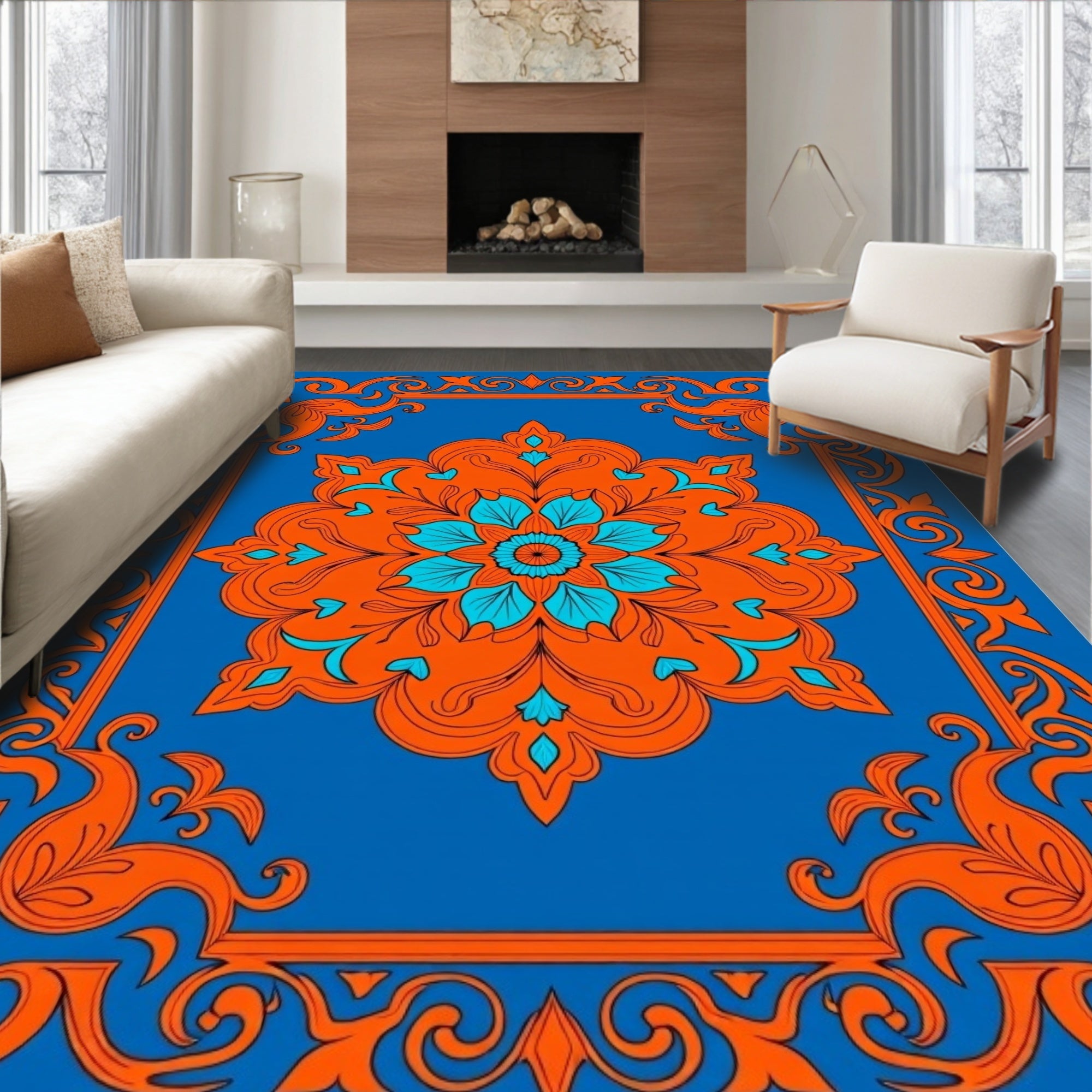 Flatwoven High Traffic Area Rug, Ornate Motif with Baroque Floral Scrolls, Non Slip, Stain Resistant, Washable Area Rugs for Living Room, Bedroom (Blue) Overview: