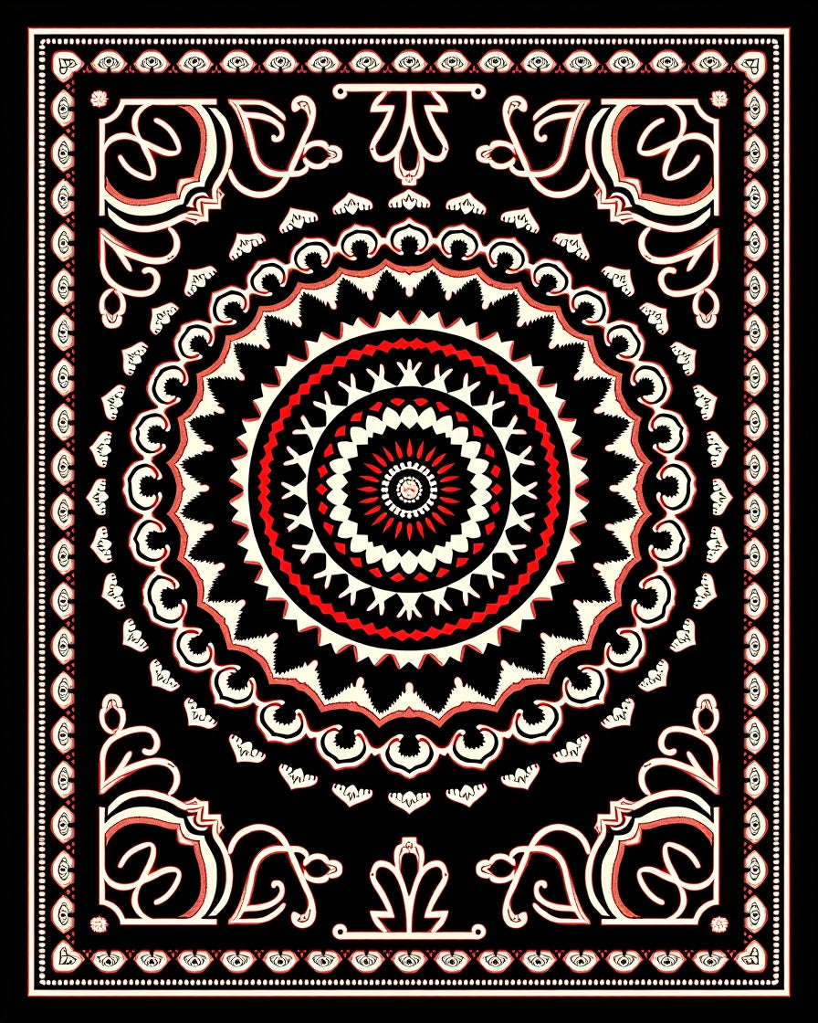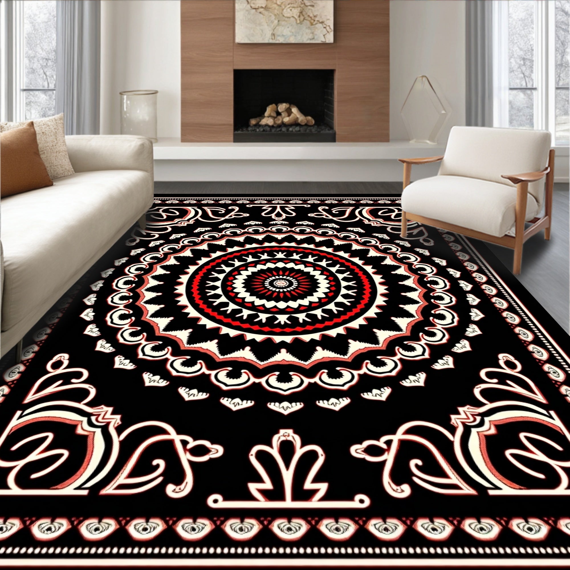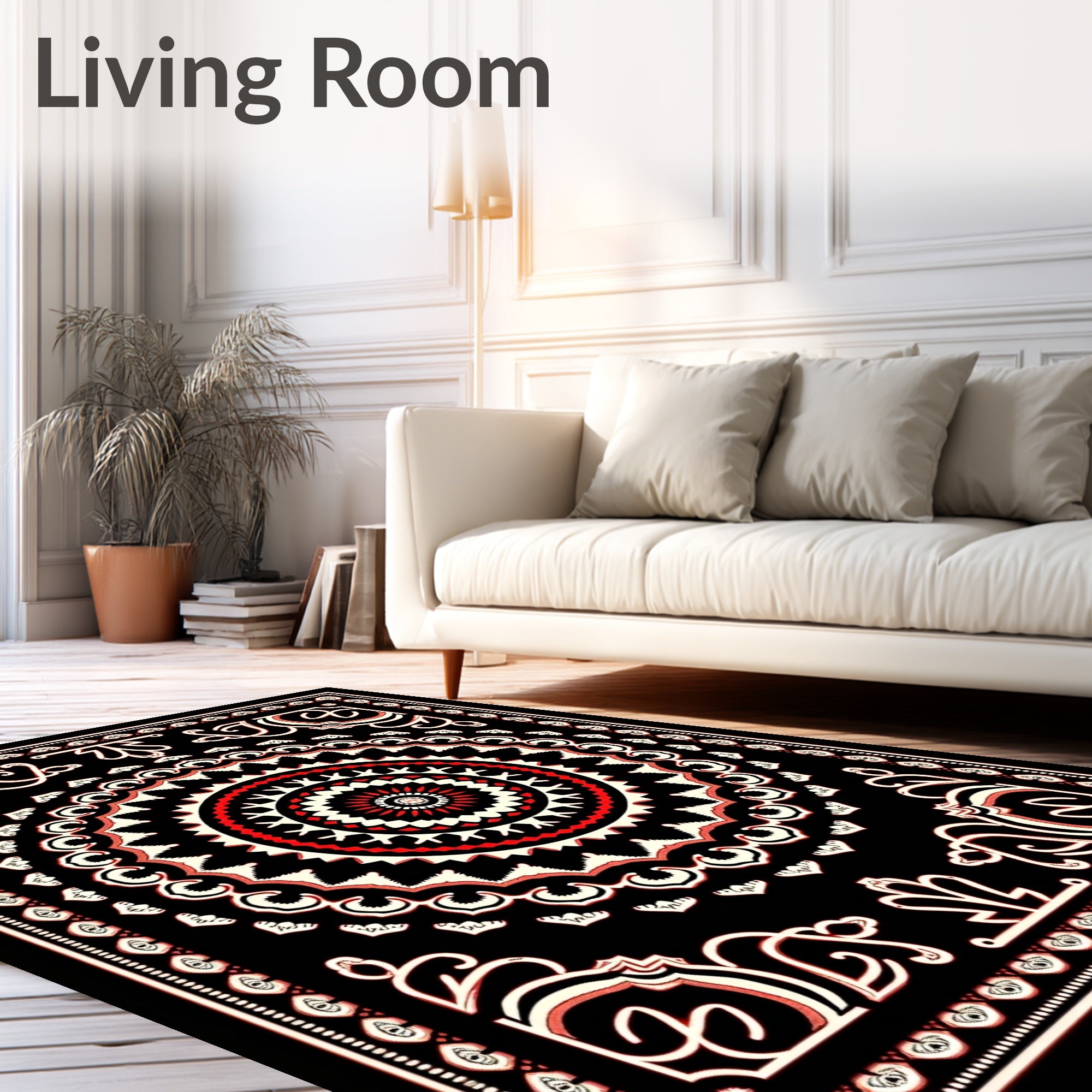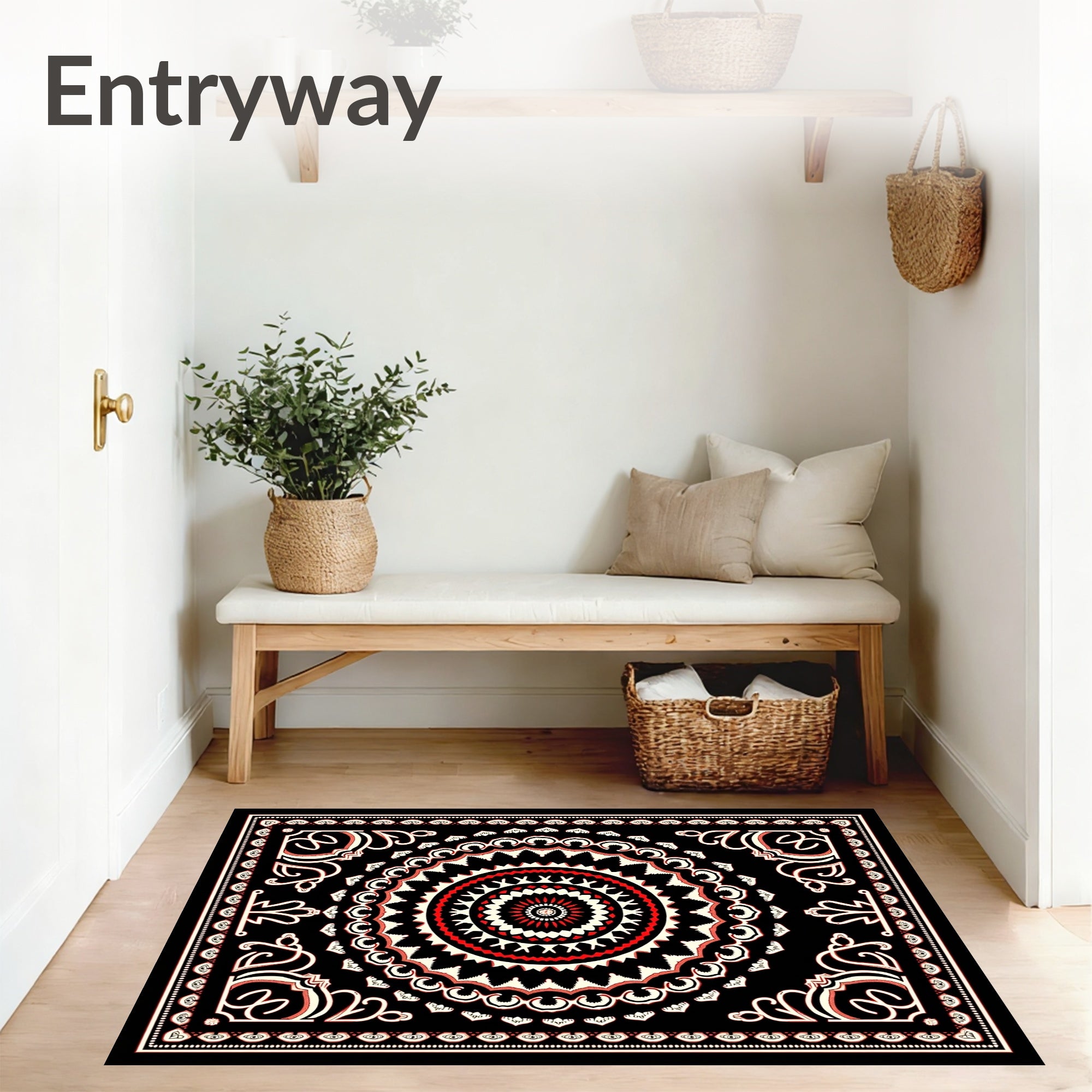 Flatwoven High Traffic Area Rug, Ornate with Interlocking Petal and Jewel Accents, Non Slip, Stain Resistant, Washable Area Rugs for Living Room, Bedroom (Black) Overview:
