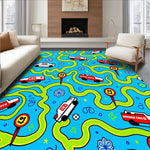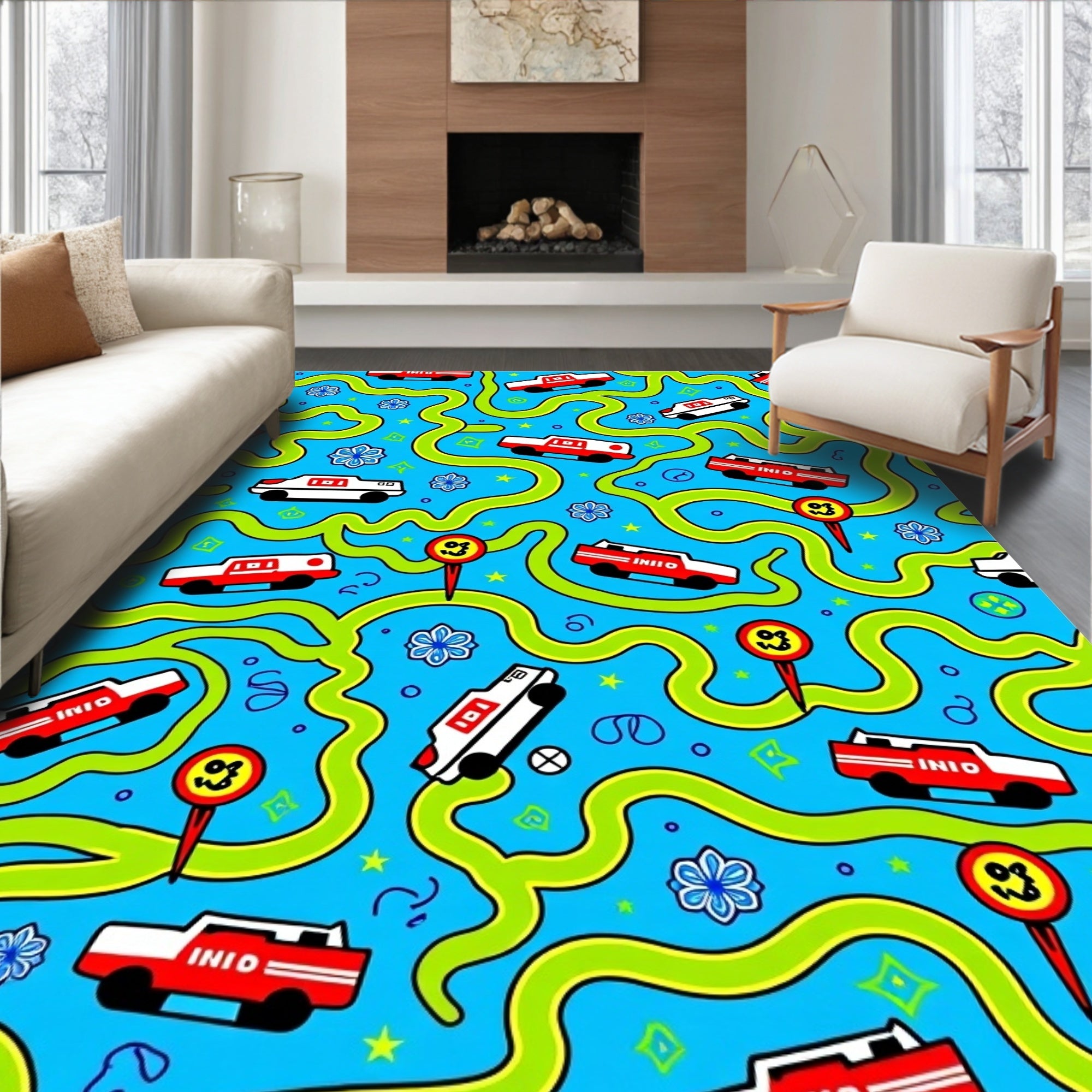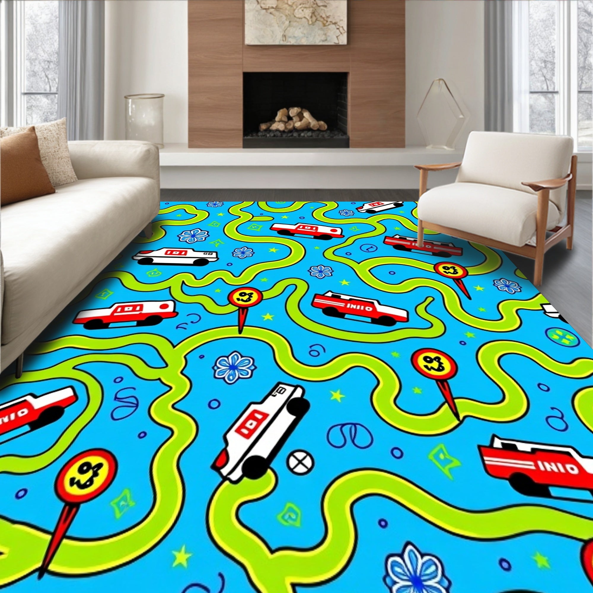 Flatwoven High Traffic Area Rug, Playful Roadway Adventure Featuring Animated Rescue Vehicles and Trails, Non Slip, Stain Resistant, Washable Area Rugs for Living Room, Bedroom (Blue) Overview: