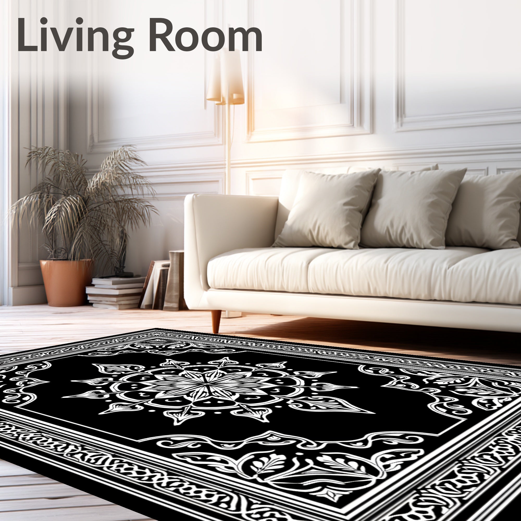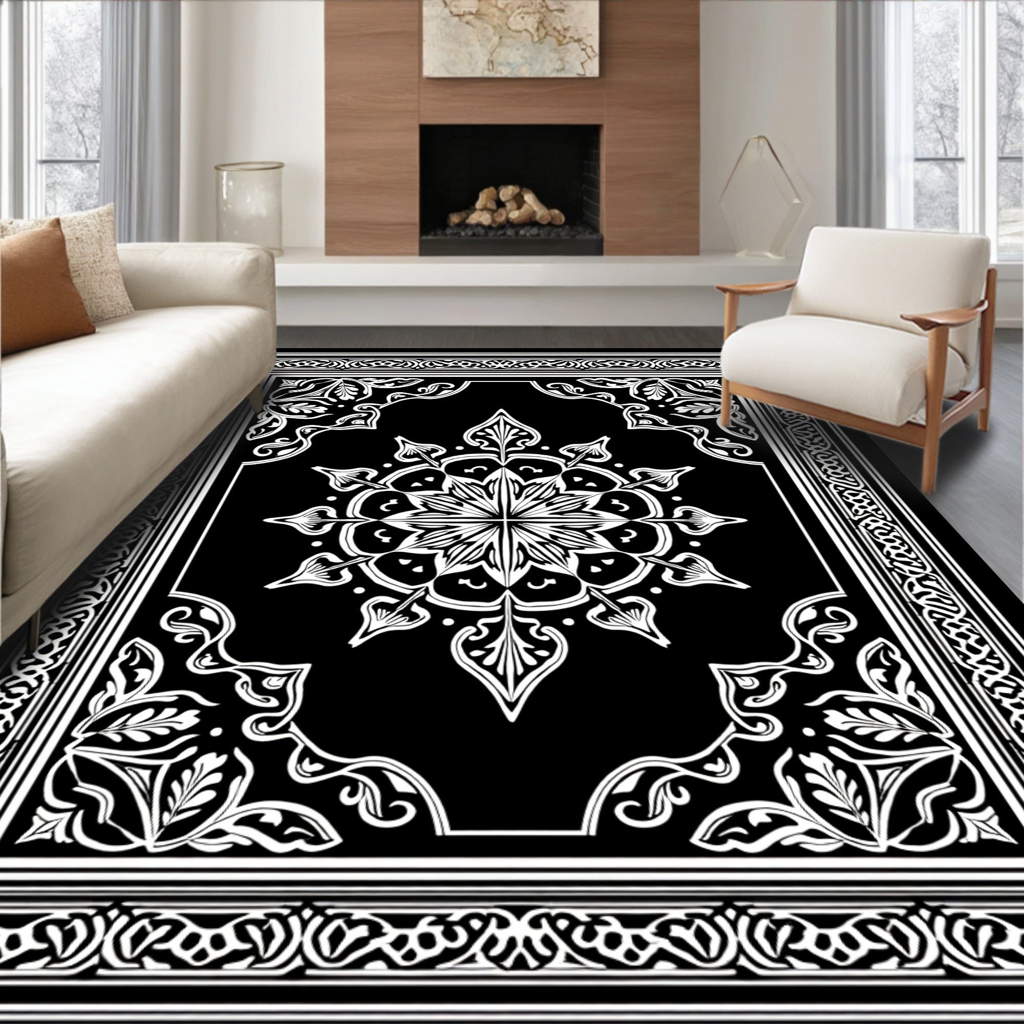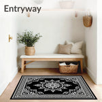 Flatwoven High Traffic Area Rug, Starburst Medallion with Ornate Floral Detailing, Non Slip, Stain Resistant, Washable Area Rugs for Living Room, Bedroom (Black) Overview: