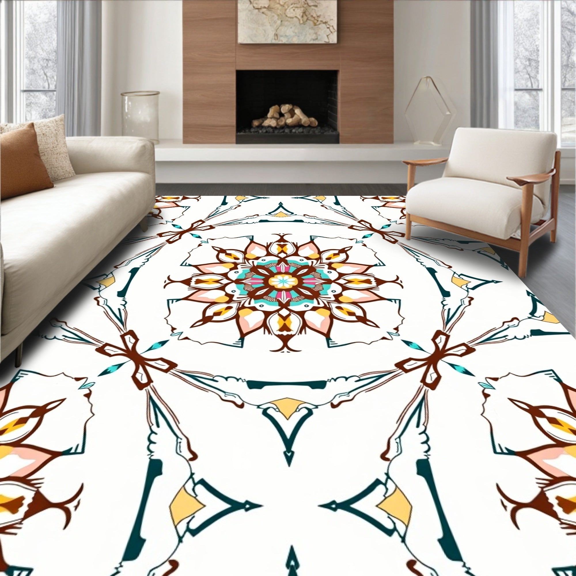 Flatwoven High Traffic Area Rug, Subtle Interlocking Medallion with Boho Motifs, Non Slip, Stain Resistant, Washable Area Rugs for Living Room, Bedroom (Brown) Overview: