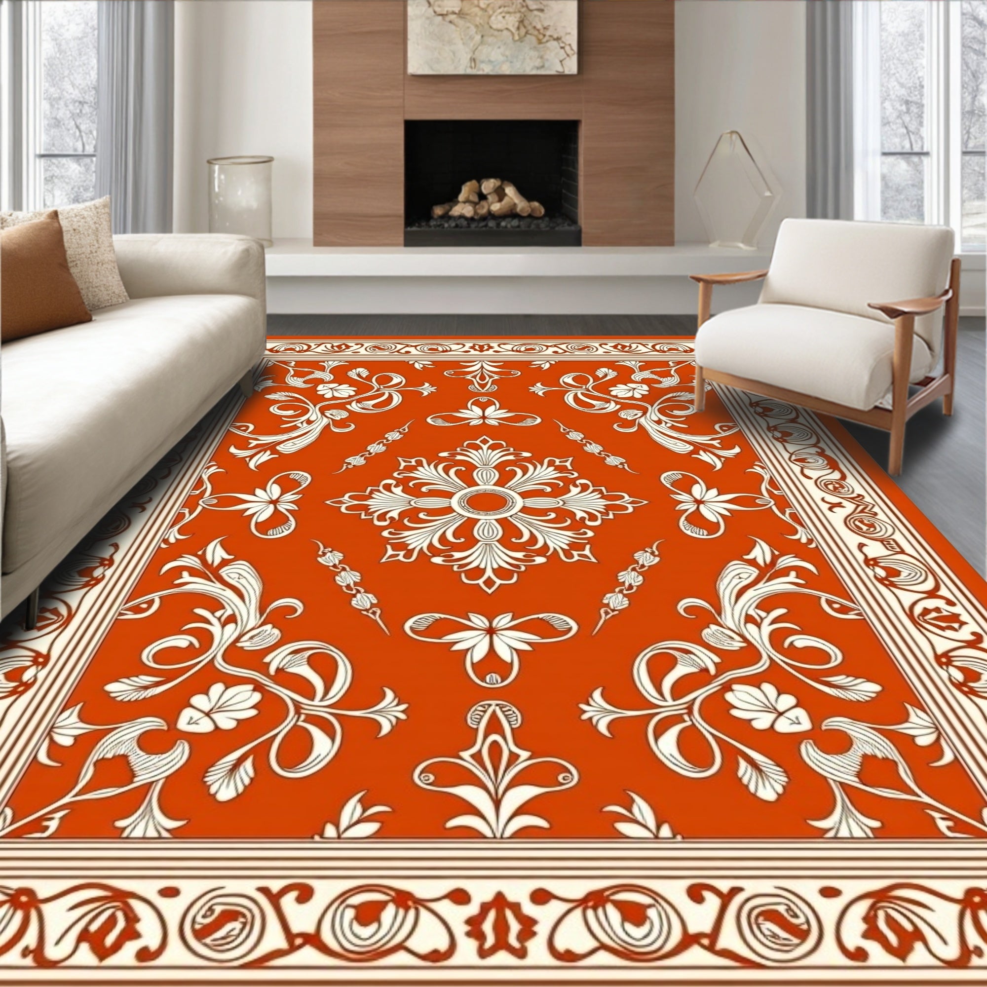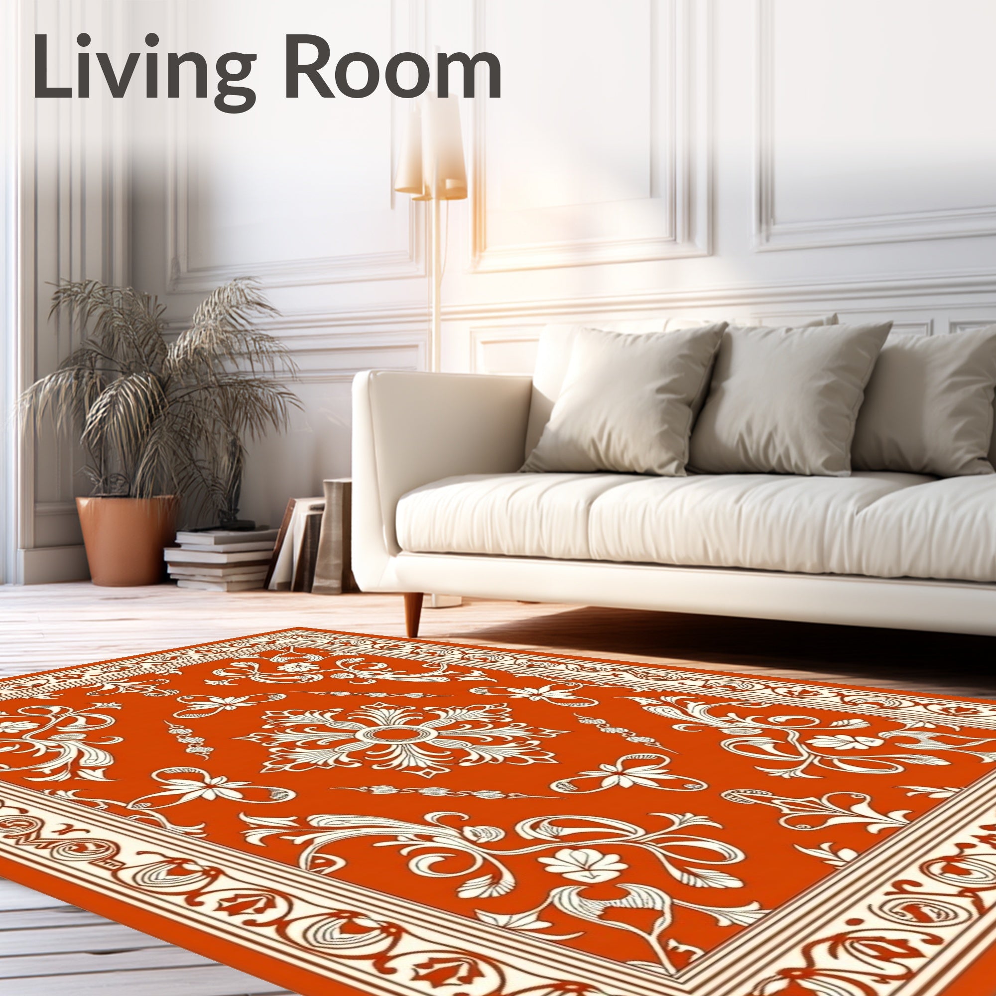 Flatwoven High Traffic Area Rug, Traditional Damask with Ornamental Border and Classic Details, Non Slip, Stain Resistant, Washable Area Rugs for Living Room, Bedroom (Orange) Overview: