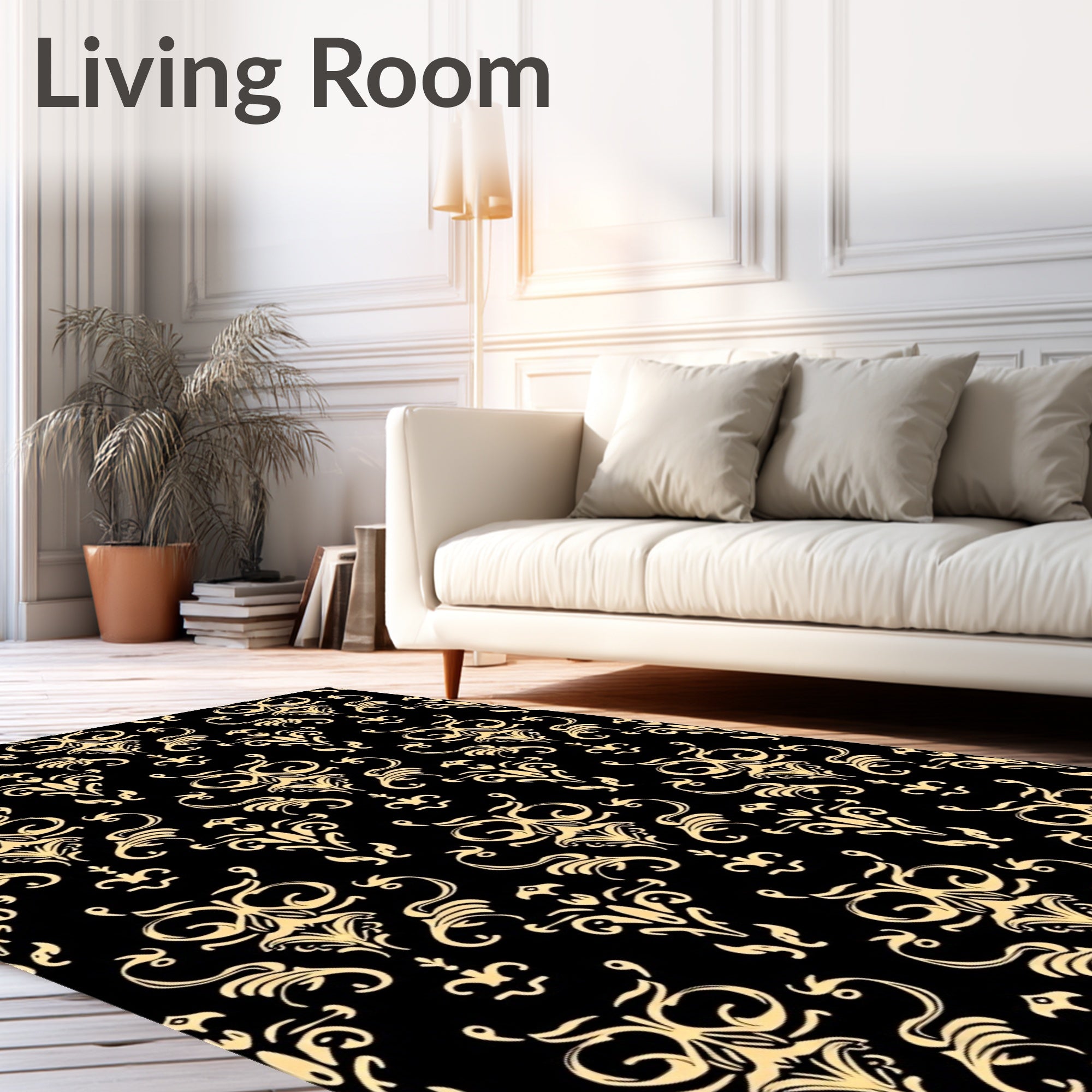 Flatwoven High Traffic Area Rug, Abstract Damask Scroll Bedside Floor Covering, Non Slip, Stain Resistant, Washable Area Rugs for Living Room, Bedroom (Black) Overview: