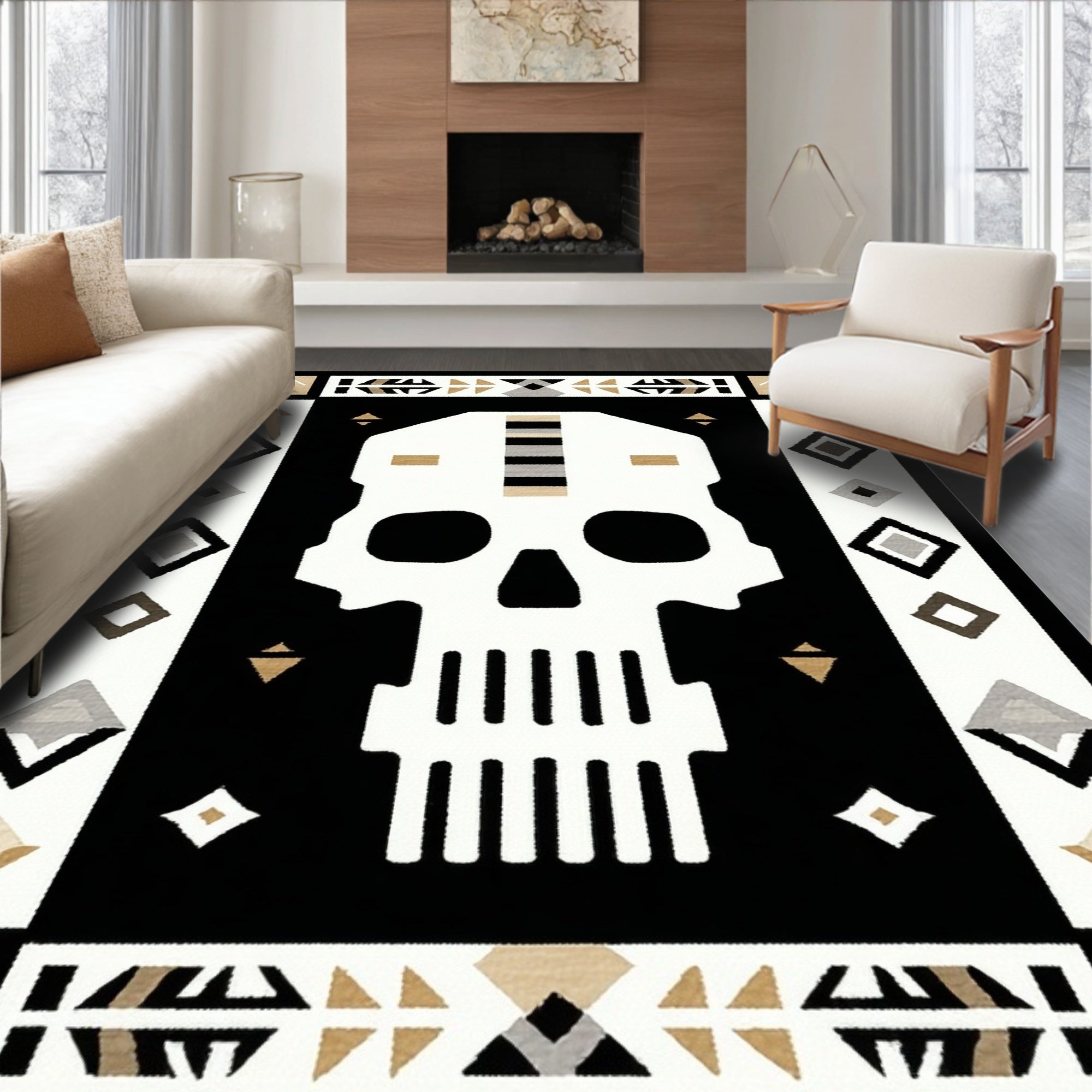 Ultra Soft Area Rug, Non Slip, Stain Resistant, Washable Area Rugs for Living Room, Bedroom, Abstract Geometric Skull Motif with Symmetrical Tribal Lines(Black) Overview: