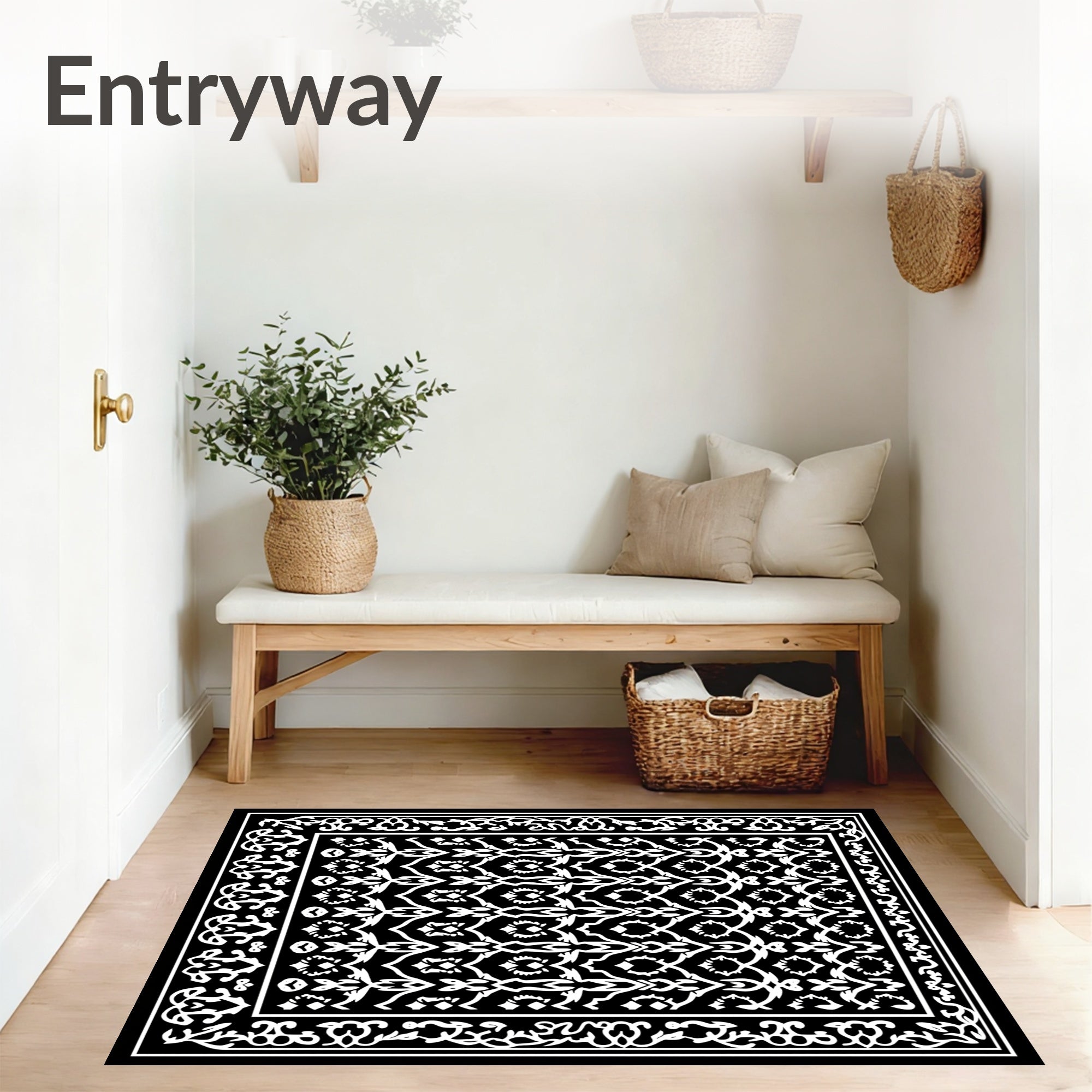 Ultra Soft Area Rug, Non Slip, Stain Resistant, Washable Area Rugs for Living Room, Bedroom, Abstract Spooky Ghost Faces in Interlocking Gothic Frames(Black) Overview: