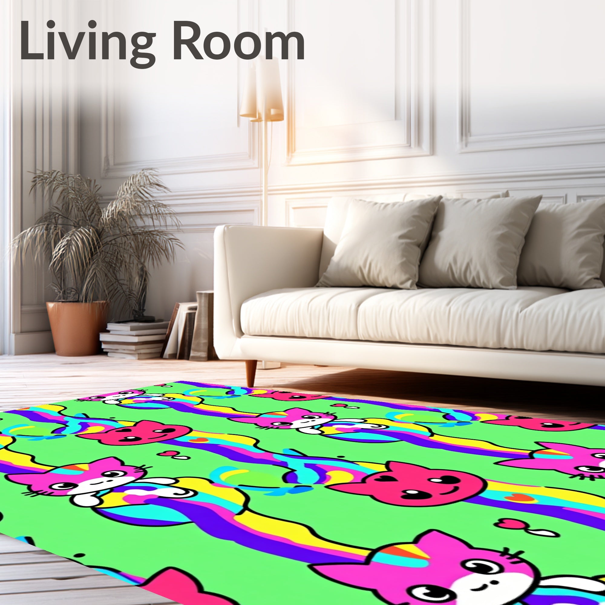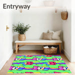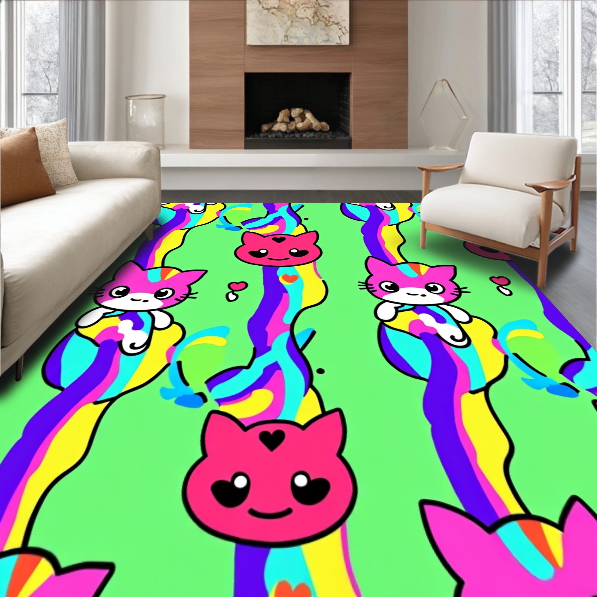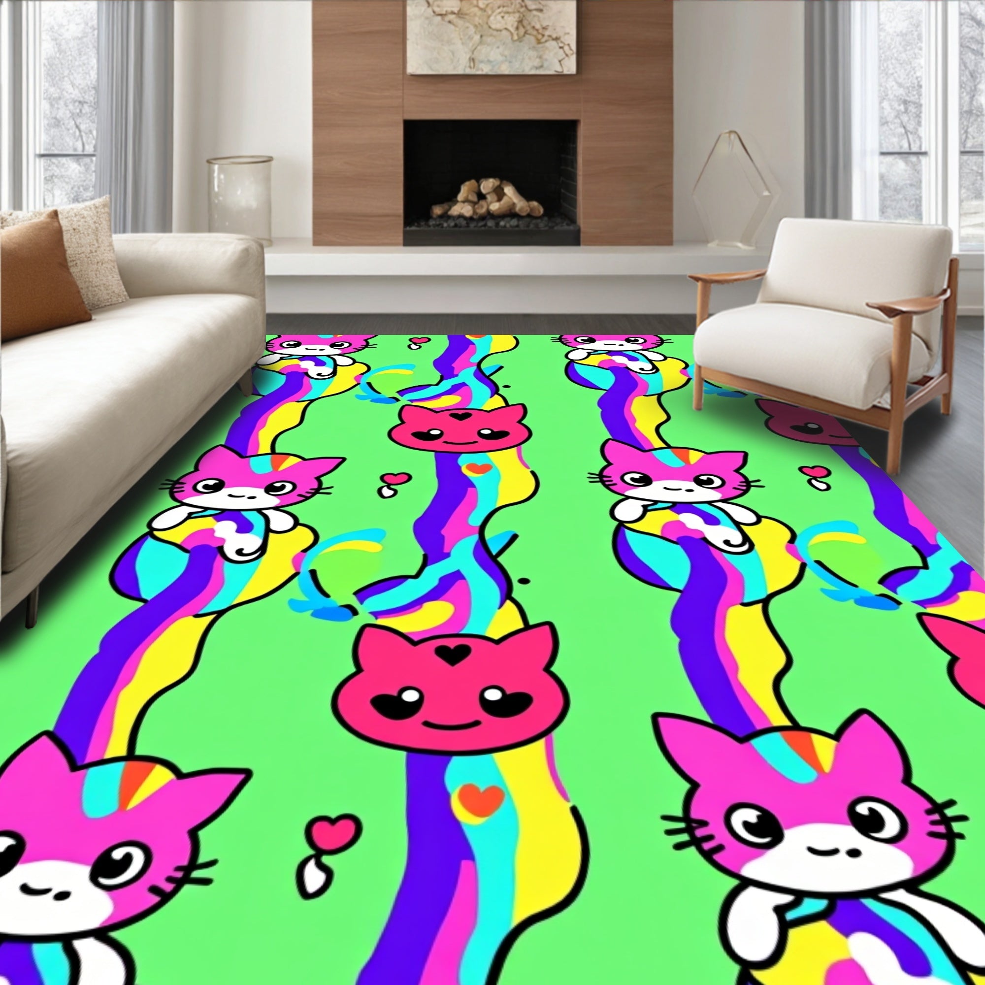 Ultra Soft Area Rug, Non Slip, Stain Resistant, Washable Area Rugs for Living Room, Bedroom, Adorable Kitten Face Motifs with Stripes and Hearts(Green) Overview: