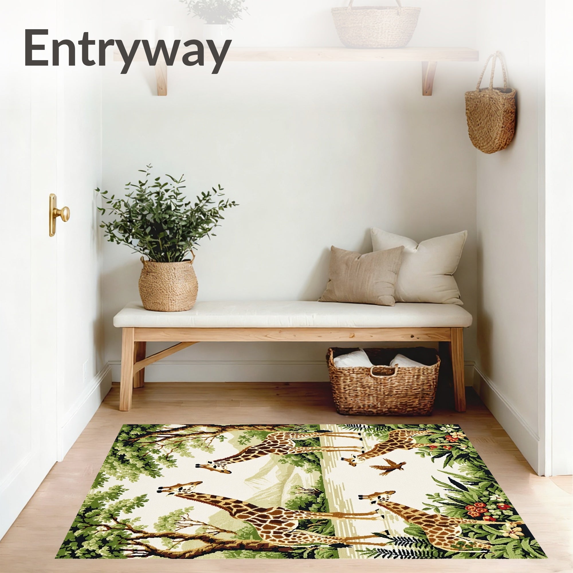 Ultra Soft Area Rug, Non Slip, Stain Resistant, Washable Area Rugs for Living Room, Bedroom, Animal Area Adorned with Majestic Giraffes and Nature Motifs(Beige) Overview: