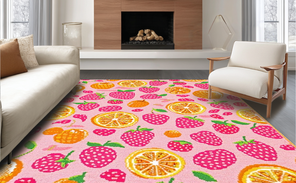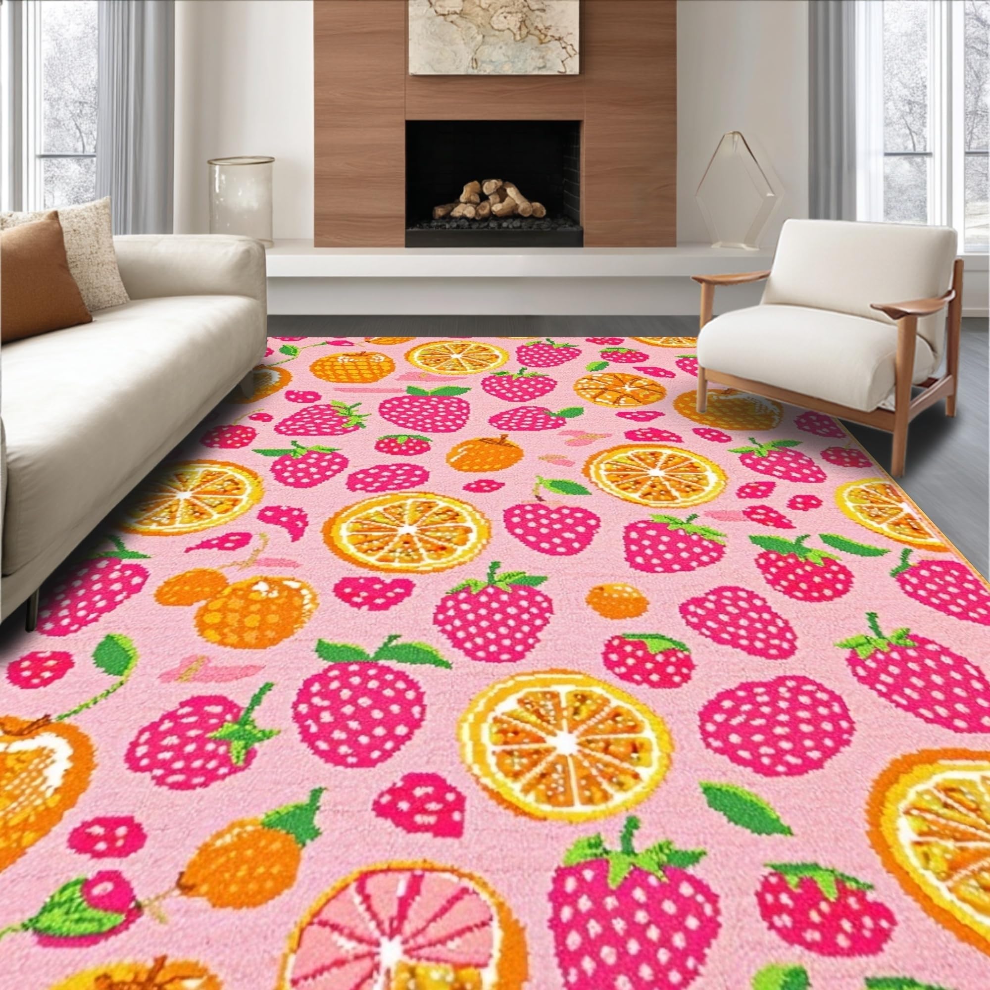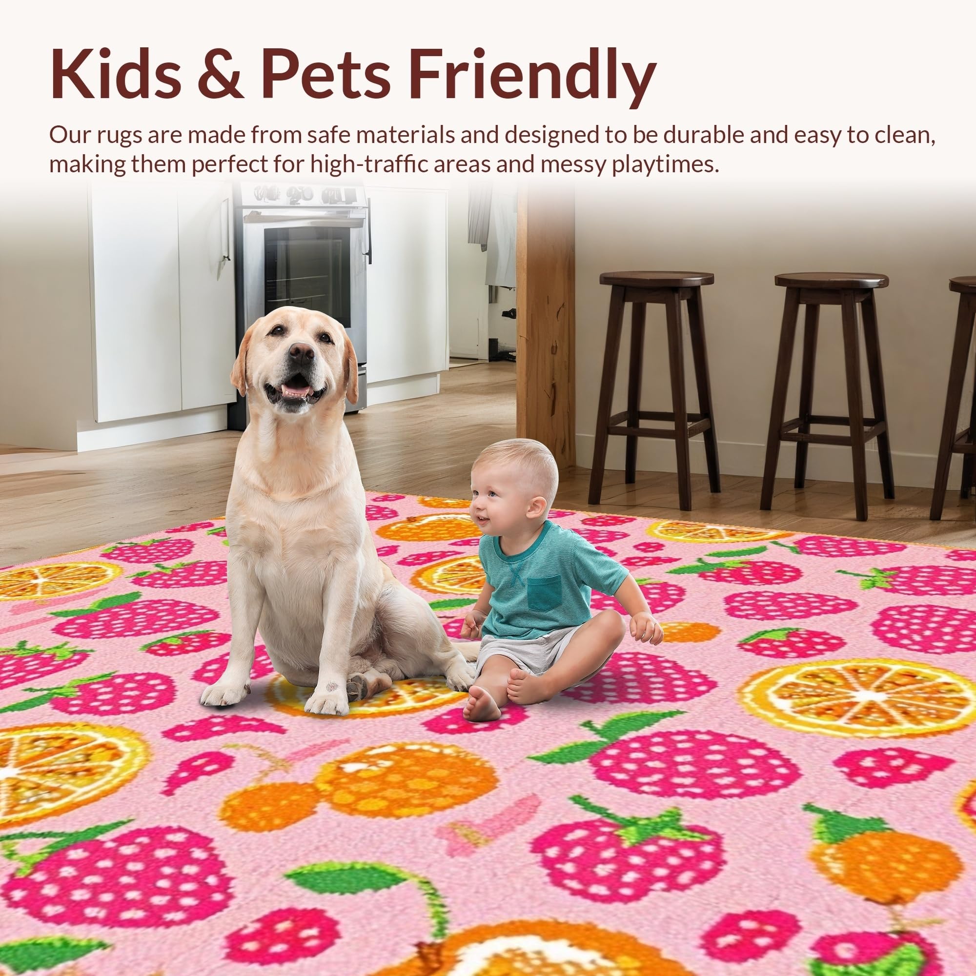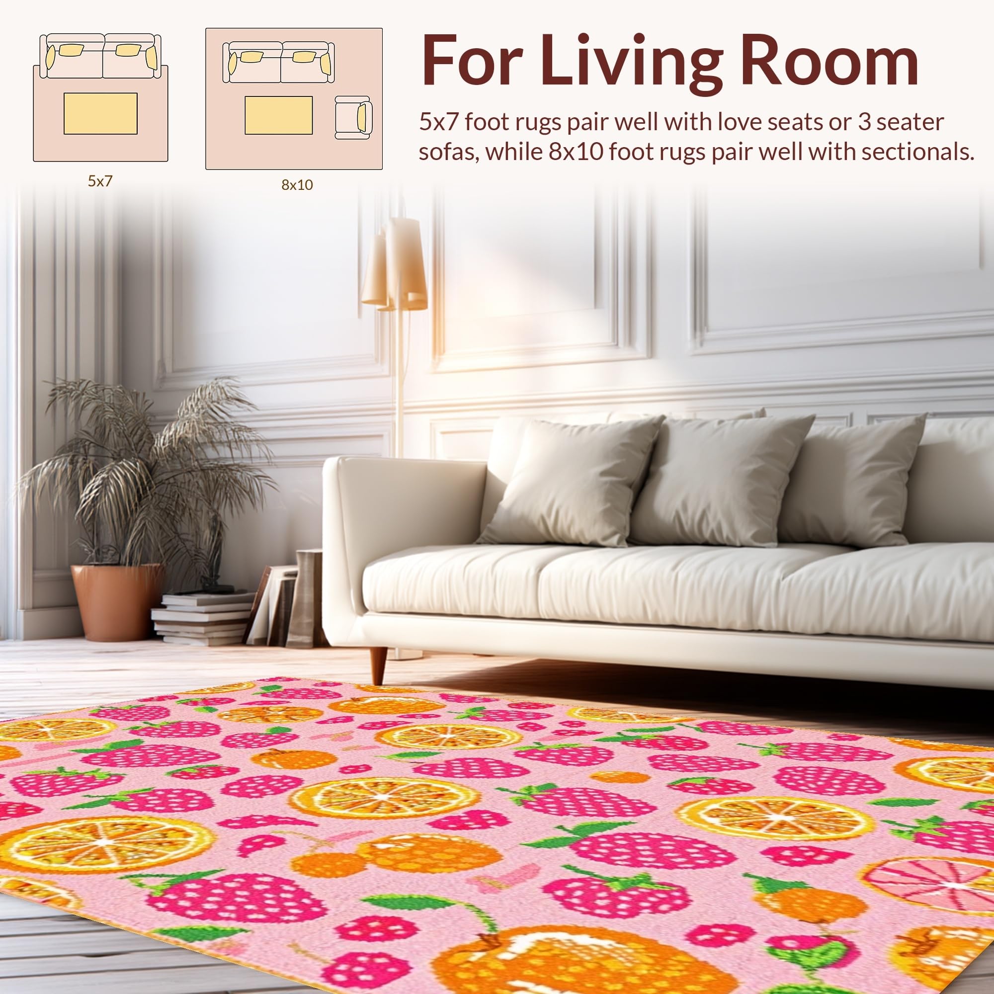 Ultra Soft Area Rug, Non Slip, Stain Resistant, Washable Area Rugs for Living Room, Bedroom, Animated Multicolor Fruit Artwork(Pink) Overview: