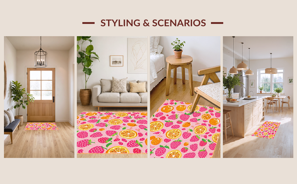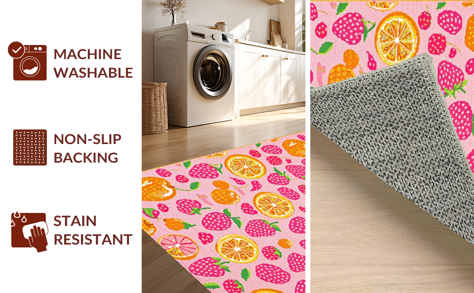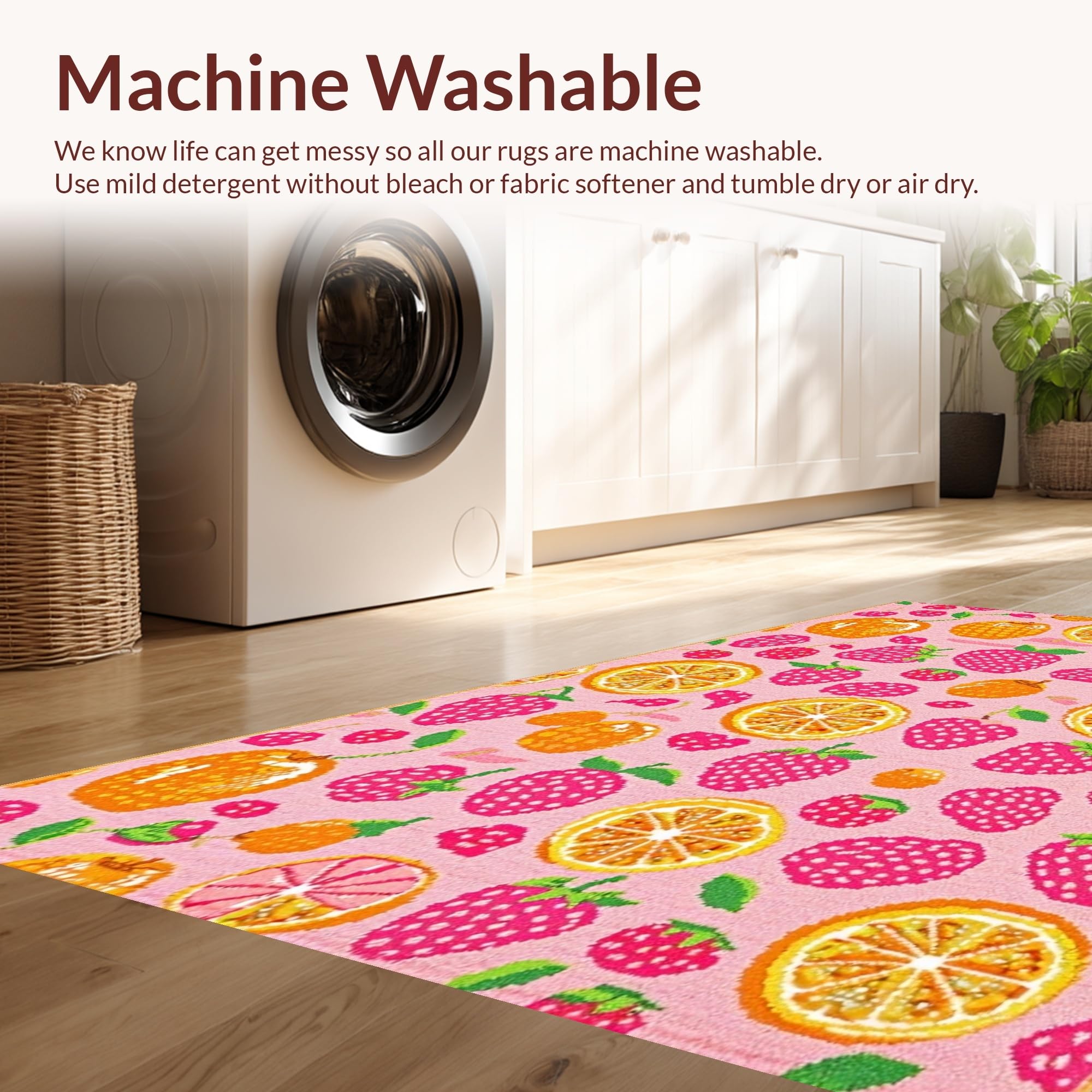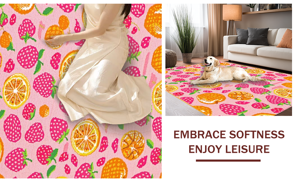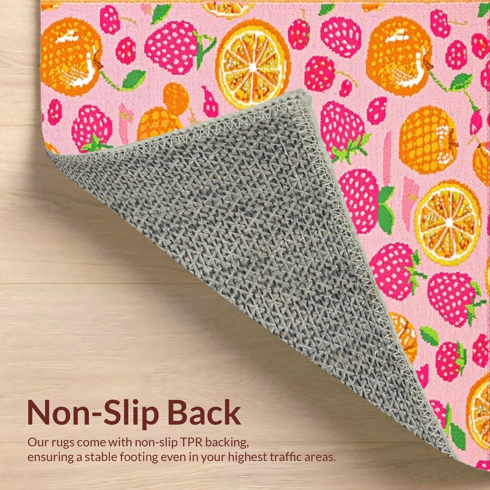 Ultra Soft Area Rug, Non Slip, Stain Resistant, Washable Area Rugs for Living Room, Bedroom, Animated Multicolor Fruit Artwork(Pink) Overview: