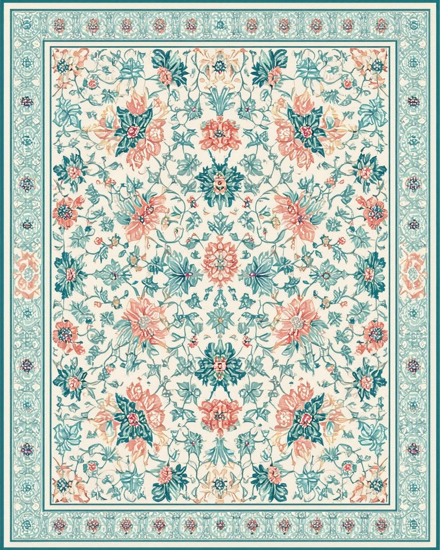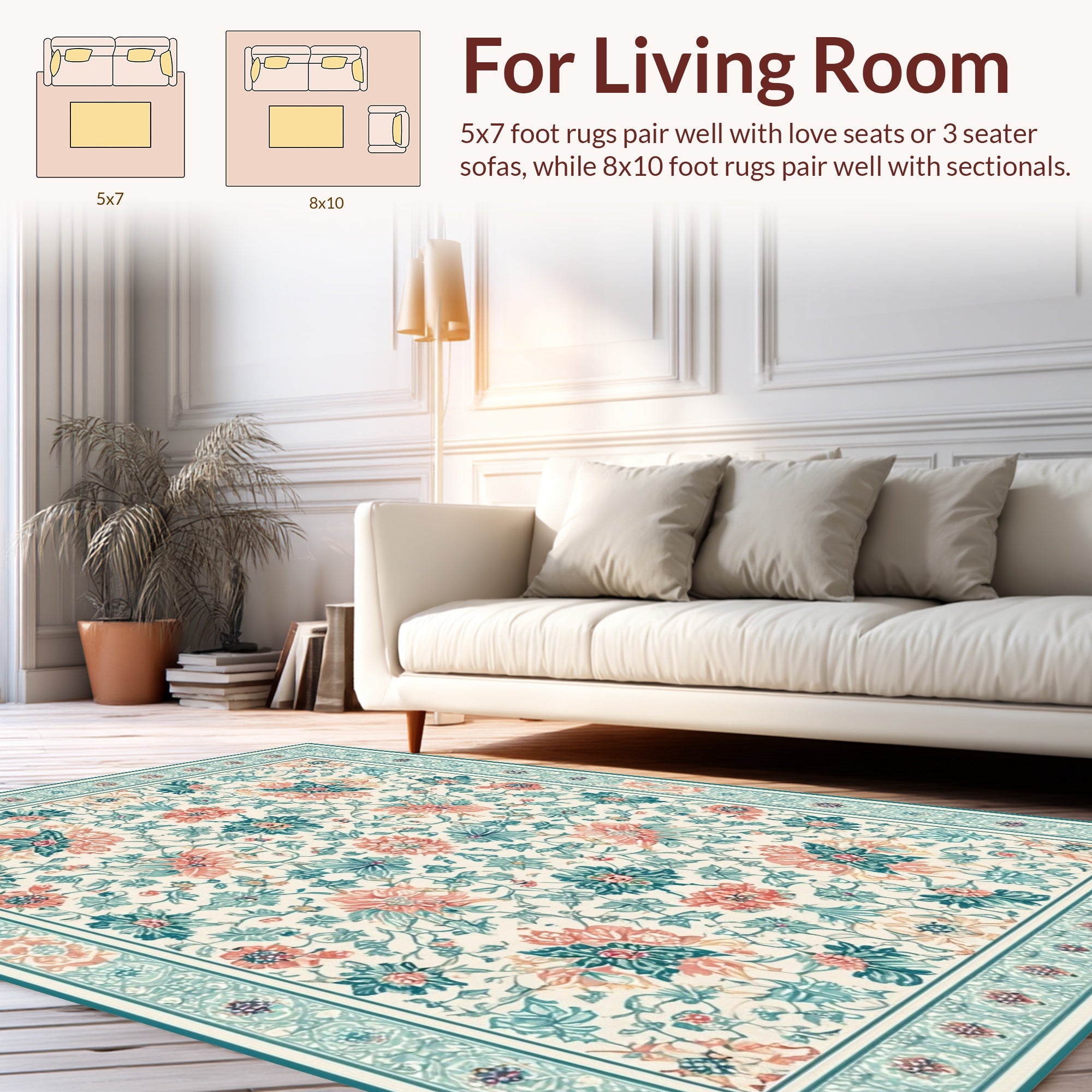 Ultra Soft Area Rug, Non Slip, Stain Resistant, Washable Area Rugs for Living Room, Bedroom, Aqua Bloom Rug Floral Tile Pattern with Peach Highlights(Beige) Overview: