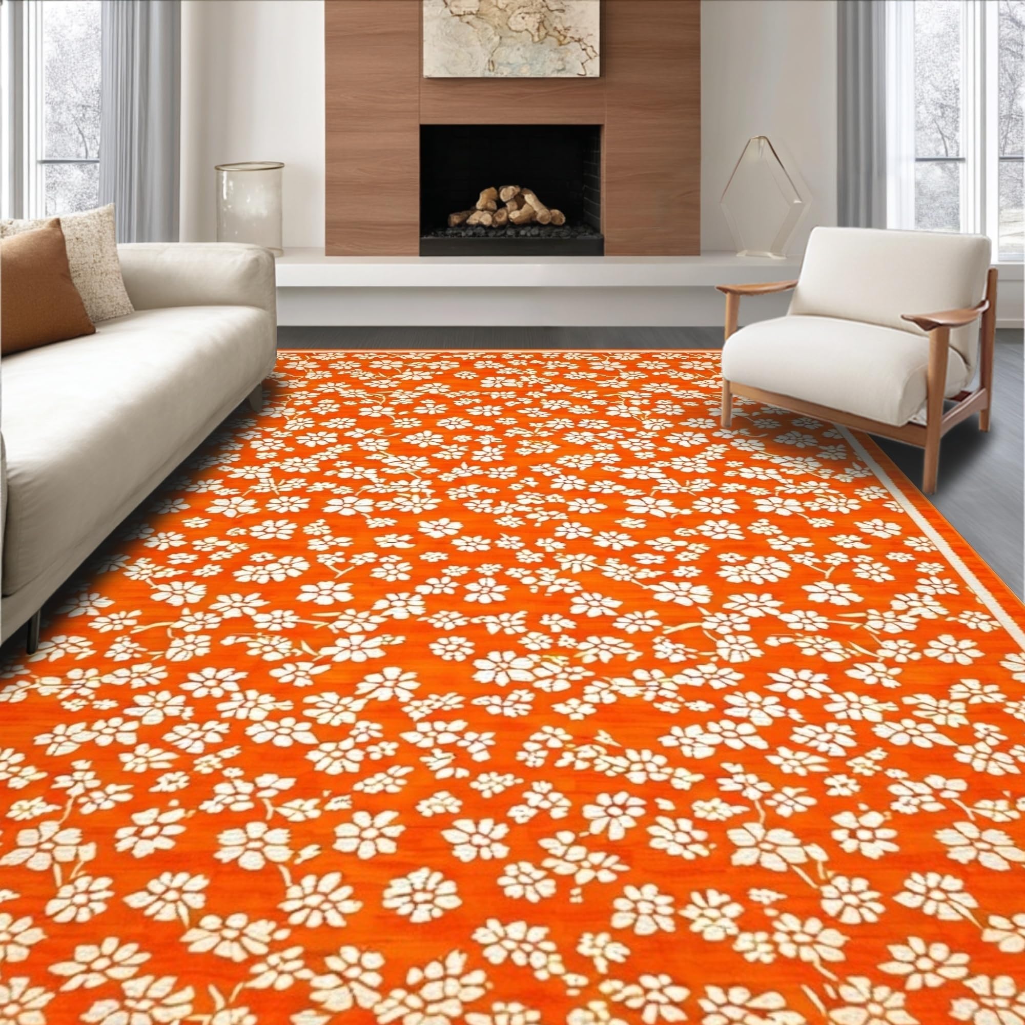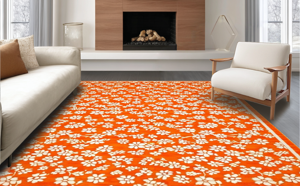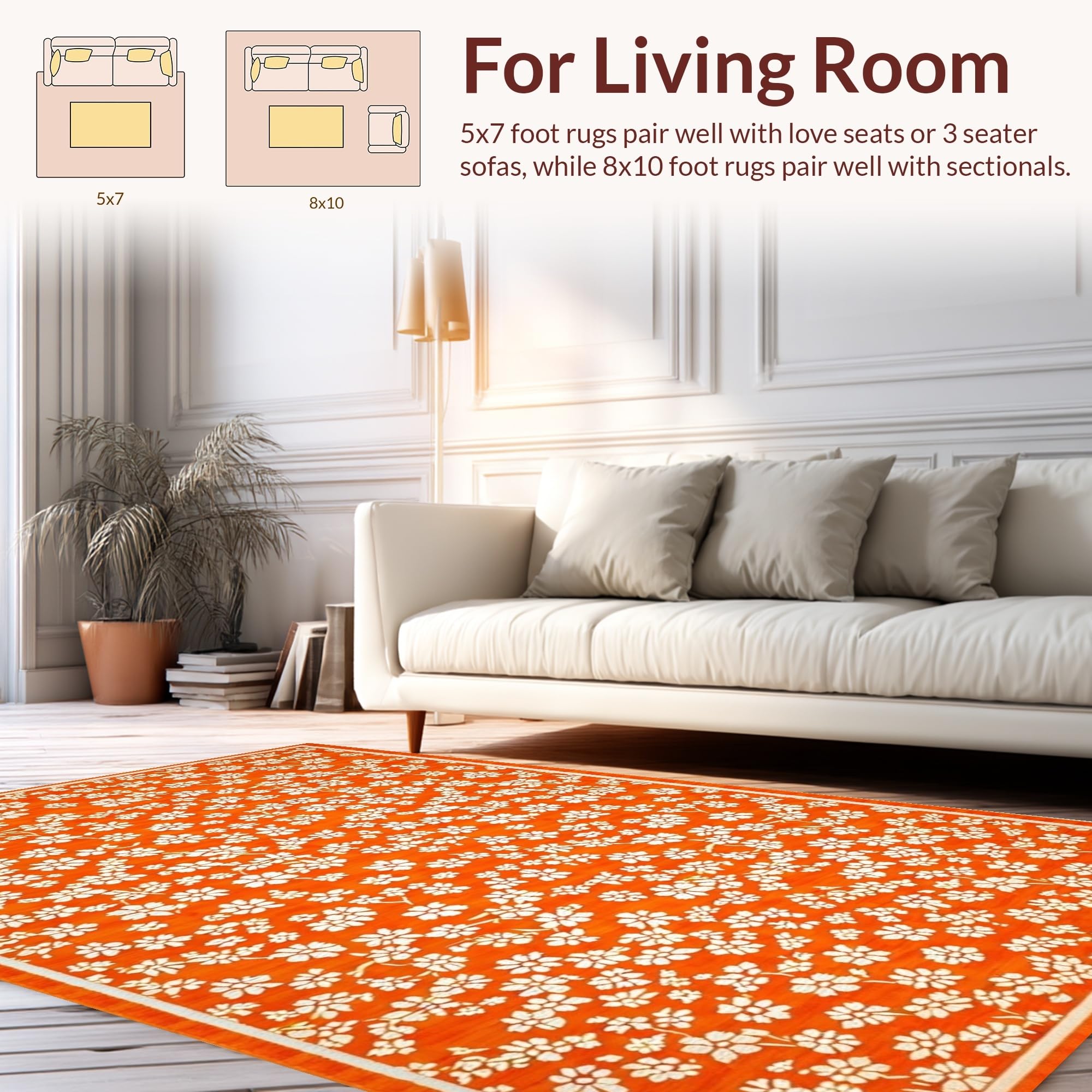 Ultra Soft Area Rug, Non Slip, Stain Resistant, Washable Area Rugs for Living Room, Bedroom, Artful Cheerful Botanical Print(Orange) Overview: