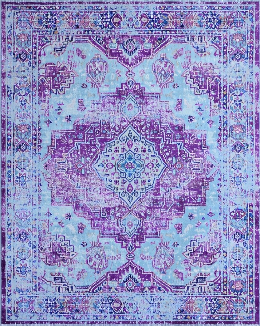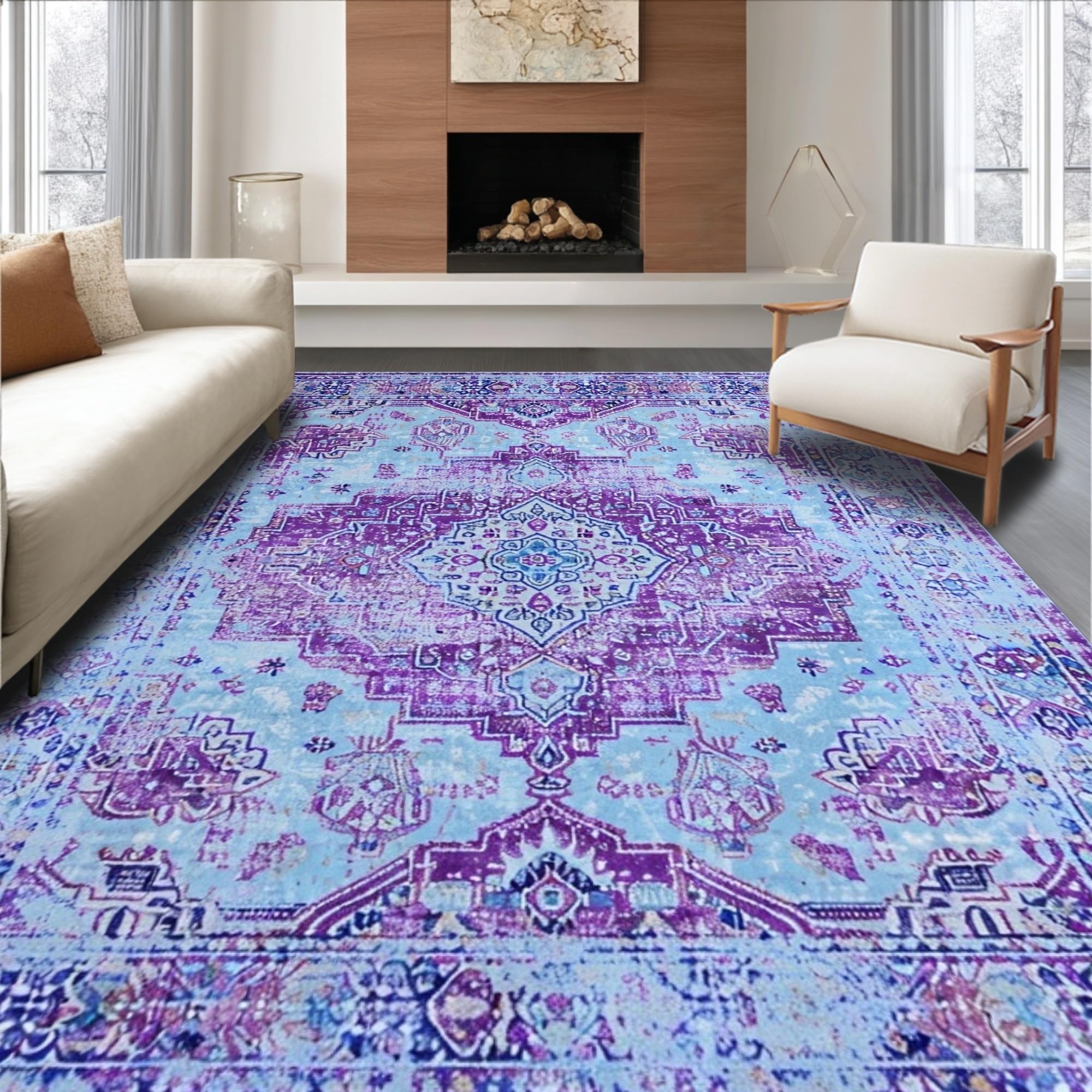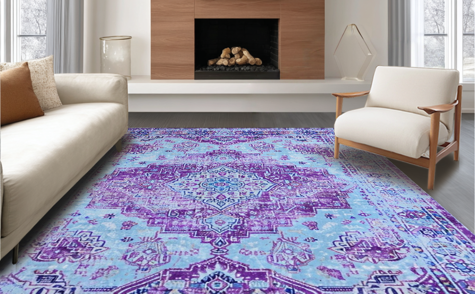 Ultra Soft Area Rug, Non Slip, Stain Resistant, Washable Area Rugs for Living Room, Bedroom, Artful Distressed Symmetrical Elements(Blue) Overview: