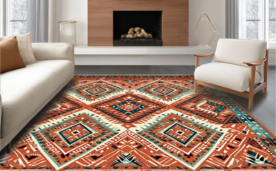 Ultra Soft Area Rug, Non Slip, Stain Resistant, Washable Area Rugs for Living Room, Bedroom, Artful Geometric Rustic Fusion(Red) Overview: