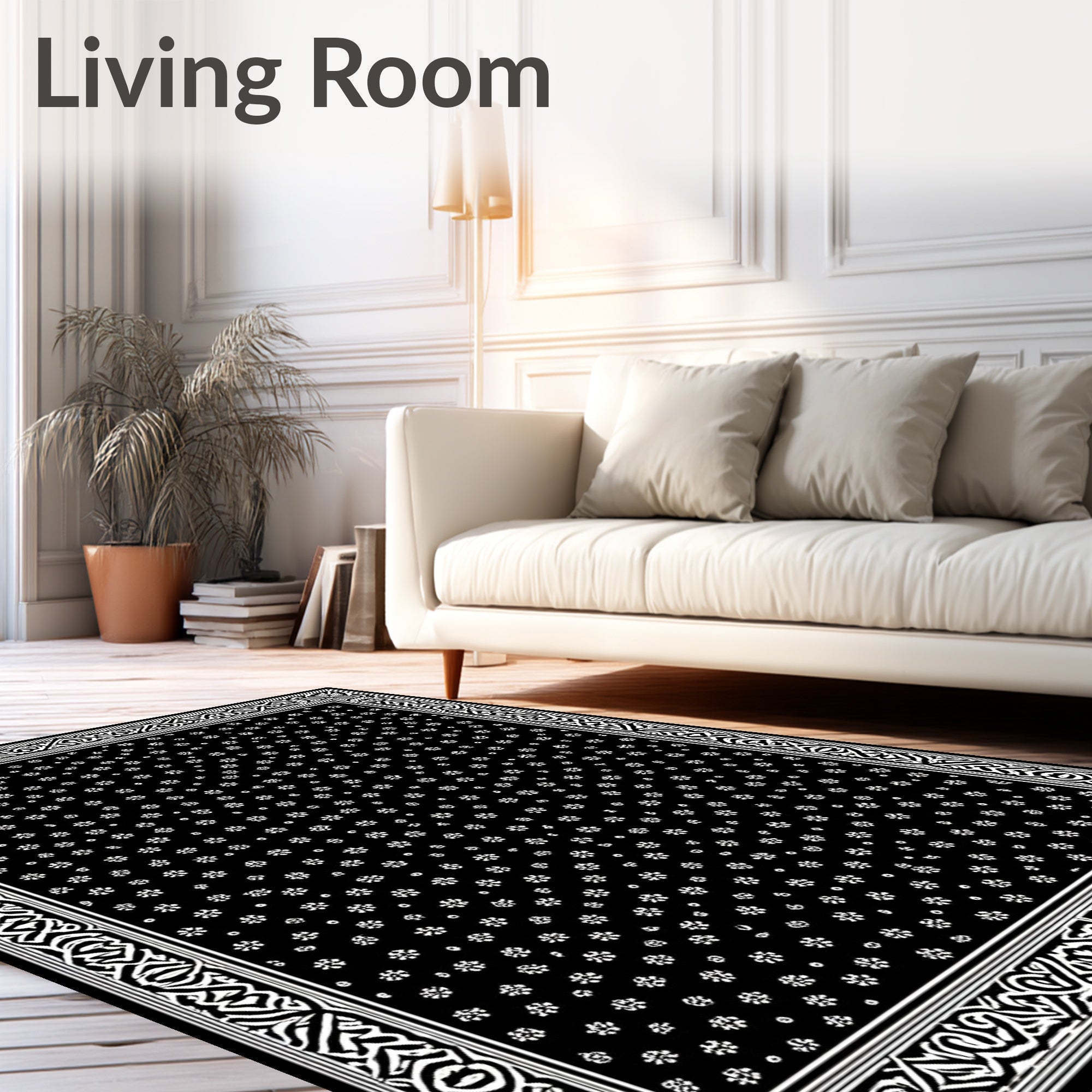 Ultra Soft Area Rug, Non Slip, Stain Resistant, Washable Area Rugs for Living Room, Bedroom, Artisan Interlocking Mosaic with Flourishing Botanical Arabesque(Black) Overview: