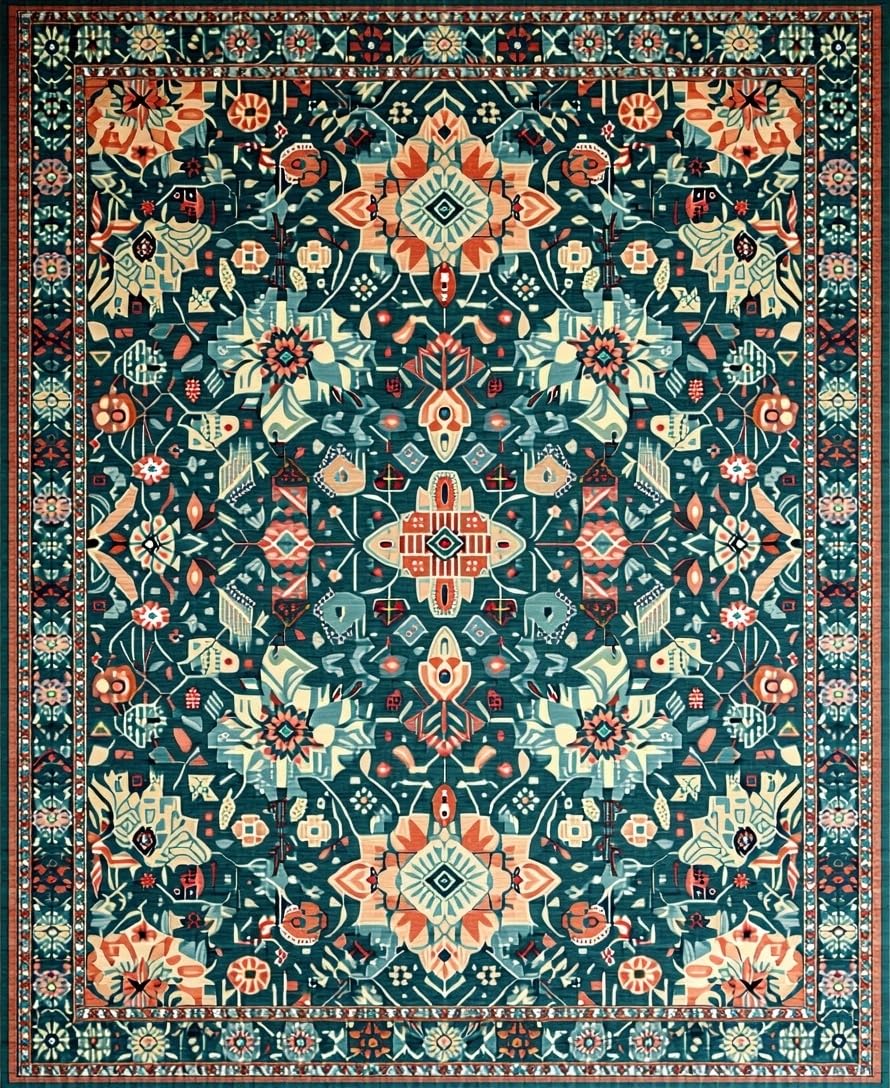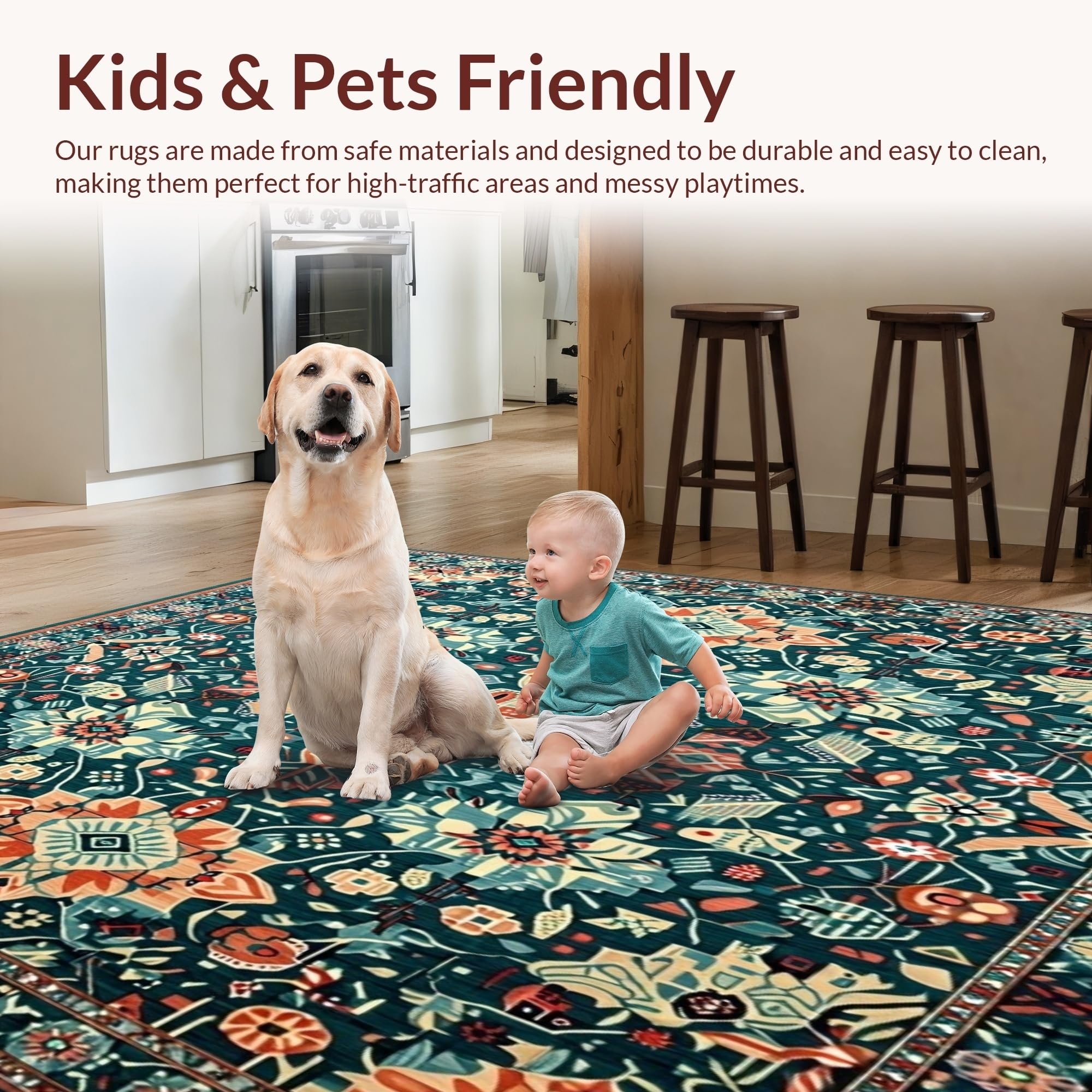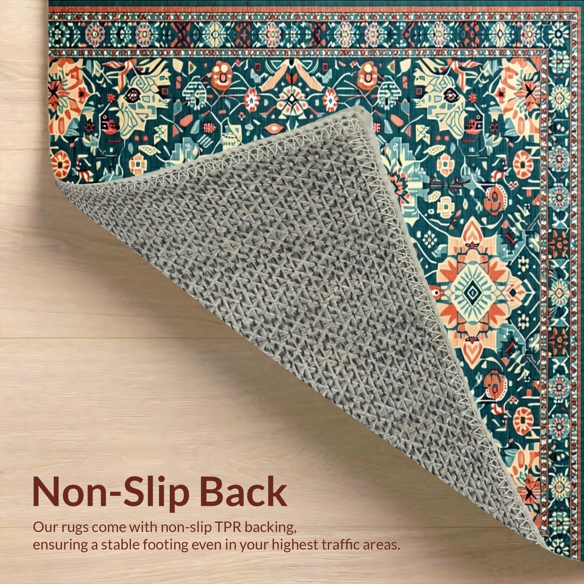 Ultra Soft Area Rug, Non Slip, Stain Resistant, Washable Area Rugs for Living Room, Bedroom, Artistic Boho Area with Vibrant Teal and Terracotta Floral(Blue) Overview: