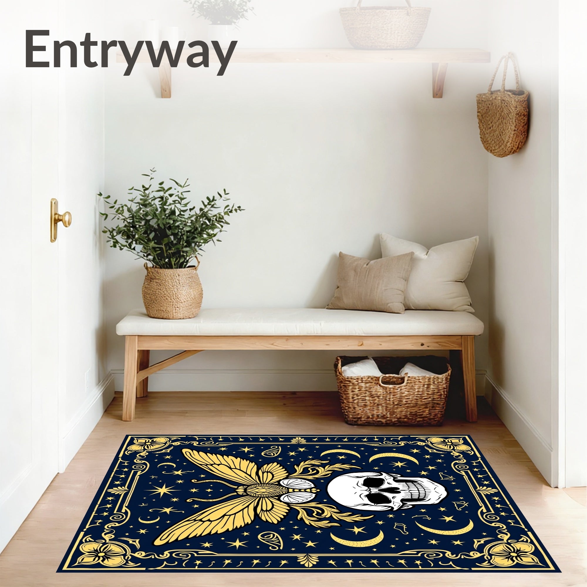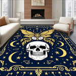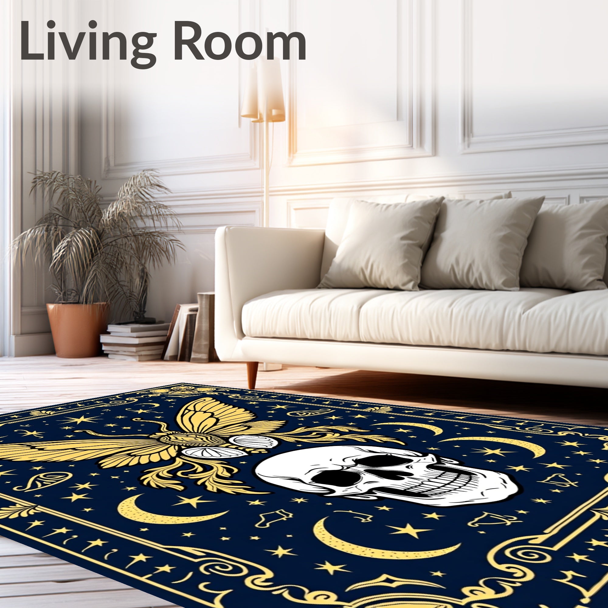 Ultra Soft Area Rug, Non Slip, Stain Resistant, Washable Area Rugs for Living Room, Bedroom, Astrological Skull Collage with Moth Wings and Celestial Embellishments(Gold) Overview: