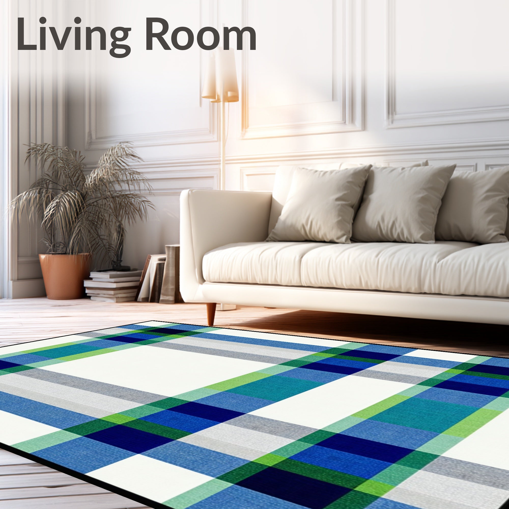 Ultra Soft Area Rug, Non Slip, Stain Resistant, Washable Area Rugs for Living Room, Bedroom, Asymmetric Blue Green and Beige Plaid Featuring Bold Linear(Blue) Overview: