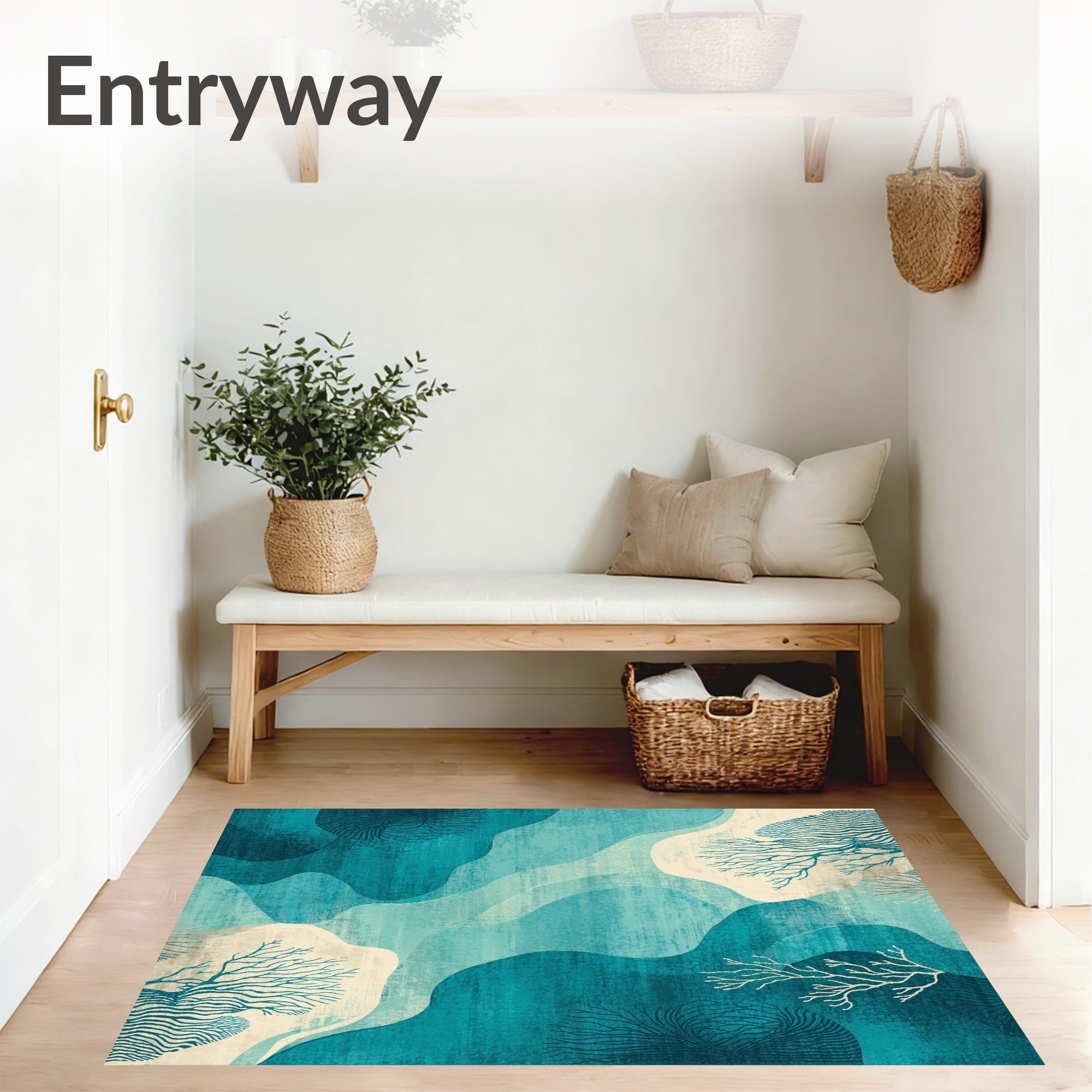 Ultra Soft Area Rug, Non Slip, Stain Resistant, Washable Area Rugs for Living Room, Bedroom, Azure Teal Beige Coastal Reef Ocean Indoor Reversible Area(Blue) Overview: