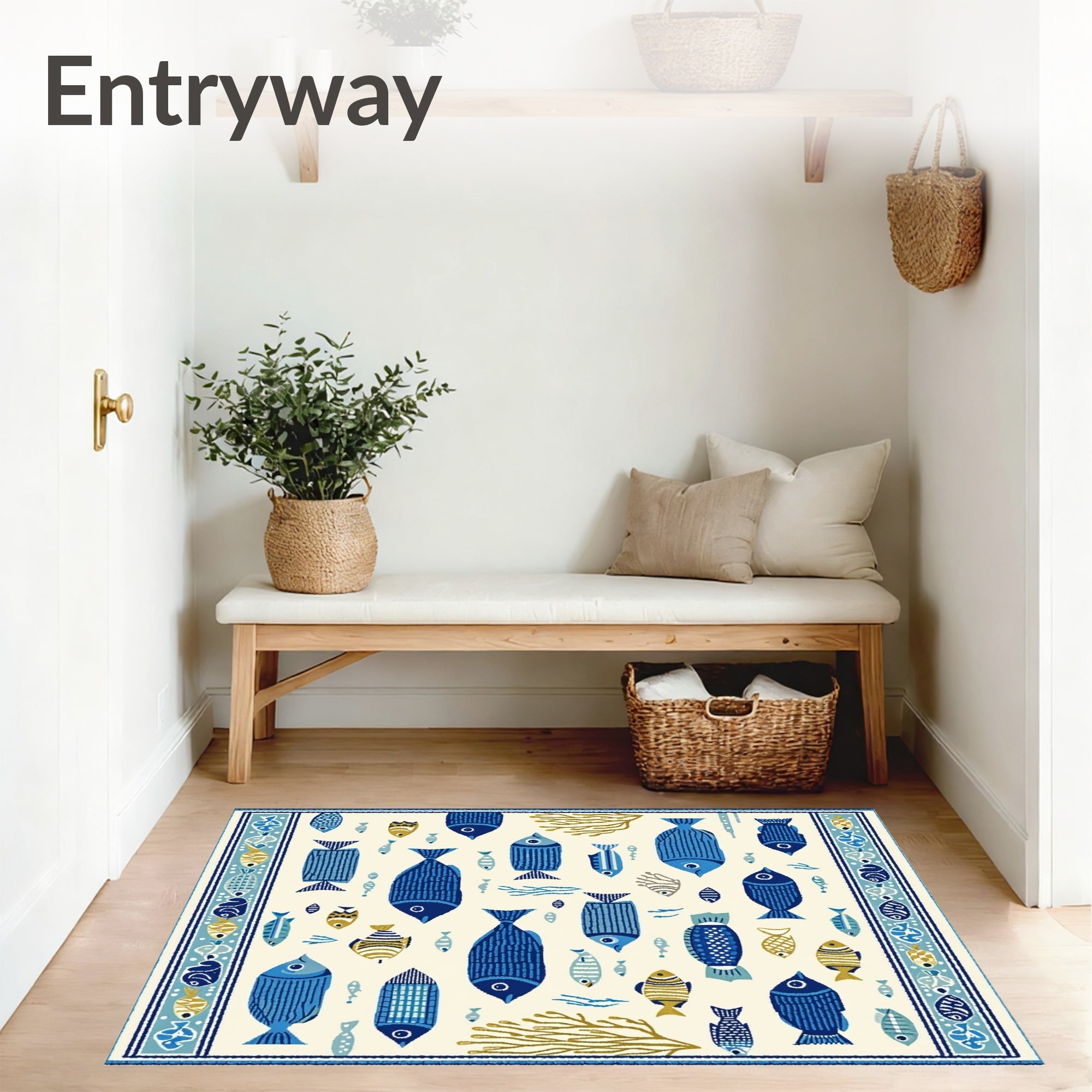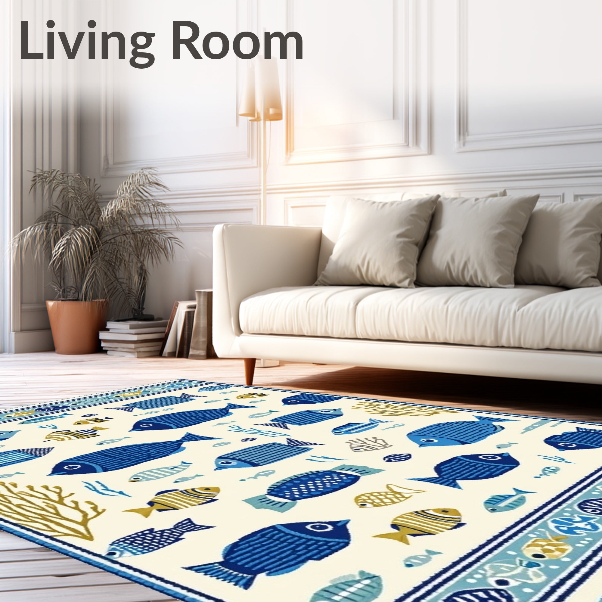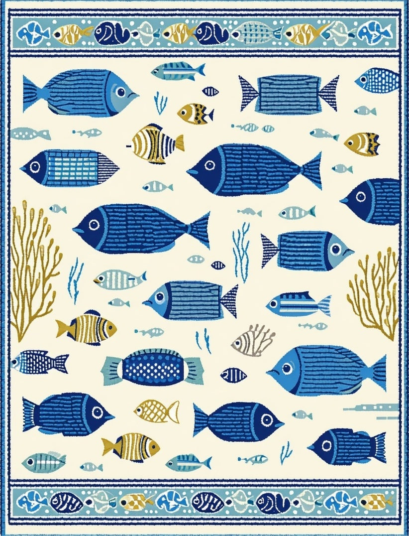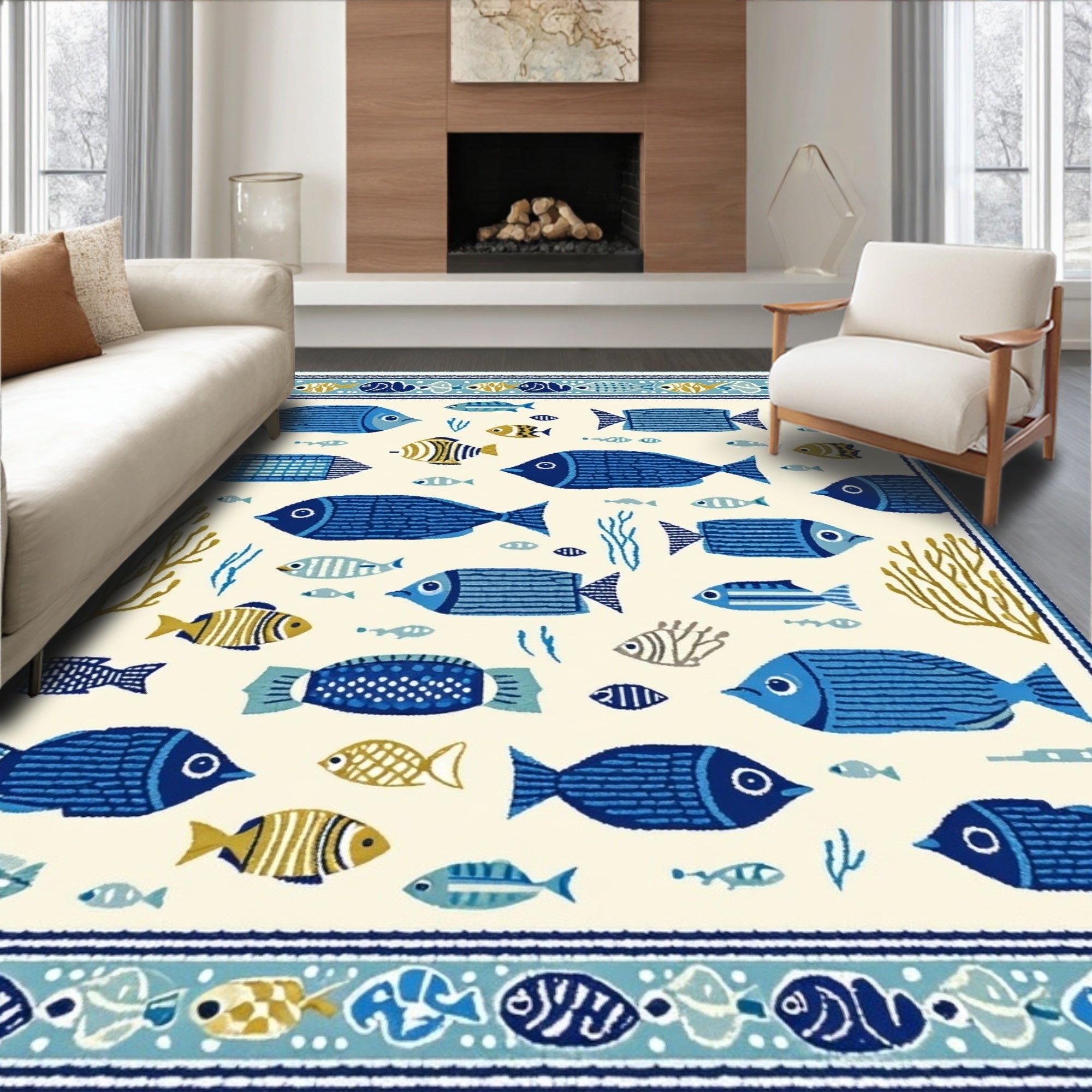 Ultra Soft Area Rug, Non Slip, Stain Resistant, Washable Area Rugs for Living Room, Bedroom, Beachcomber Bright Colors Fish Beige Area Marine Life(White) Overview: