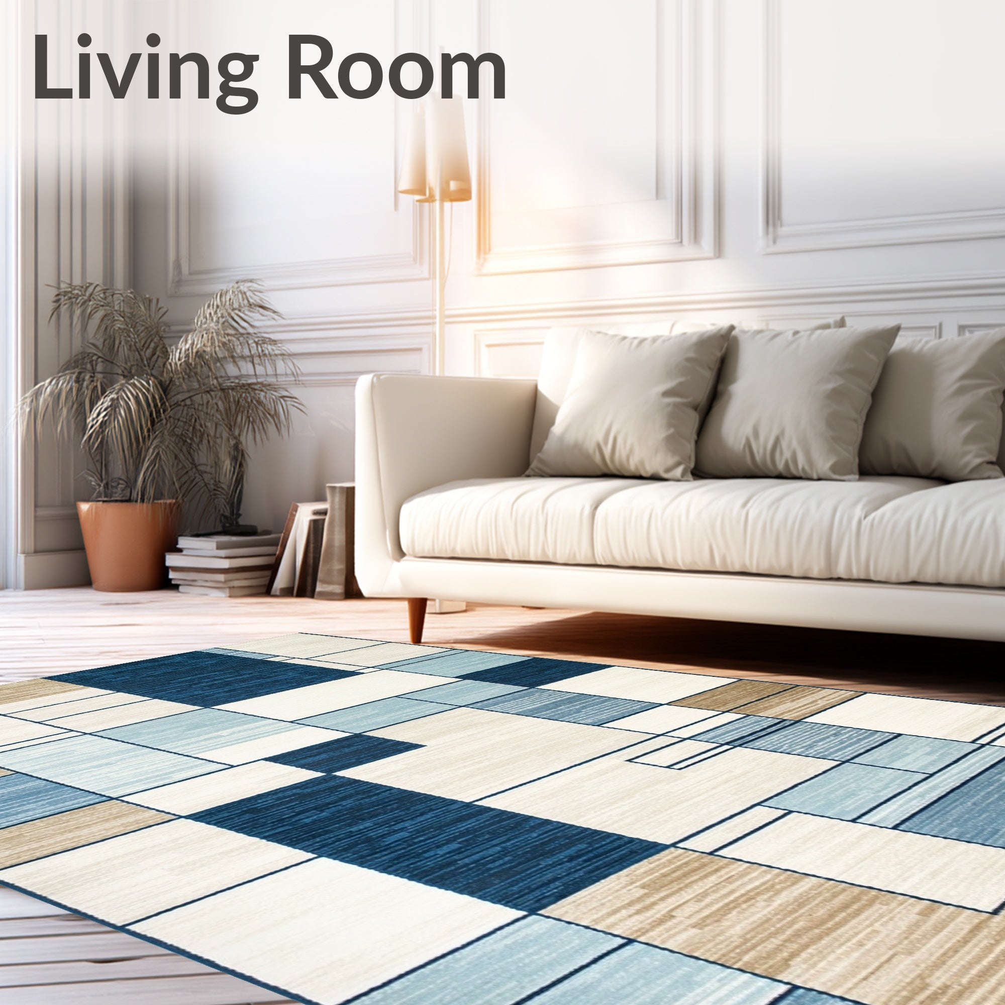 Ultra Soft Area Rug, Non Slip, Stain Resistant, Washable Area Rugs for Living Room, Bedroom, Beige Blue Geo Patchwork Area Modern Floor Art for Home(Beige) Overview: