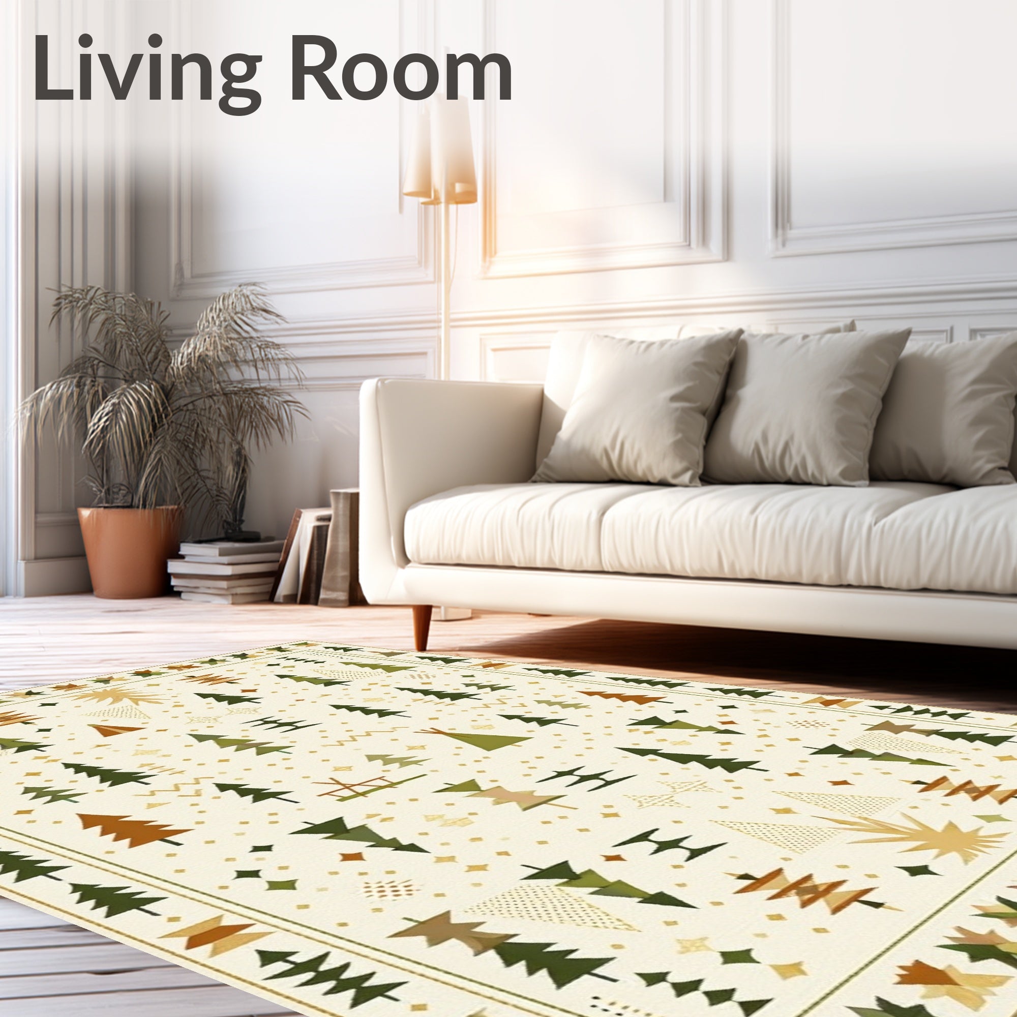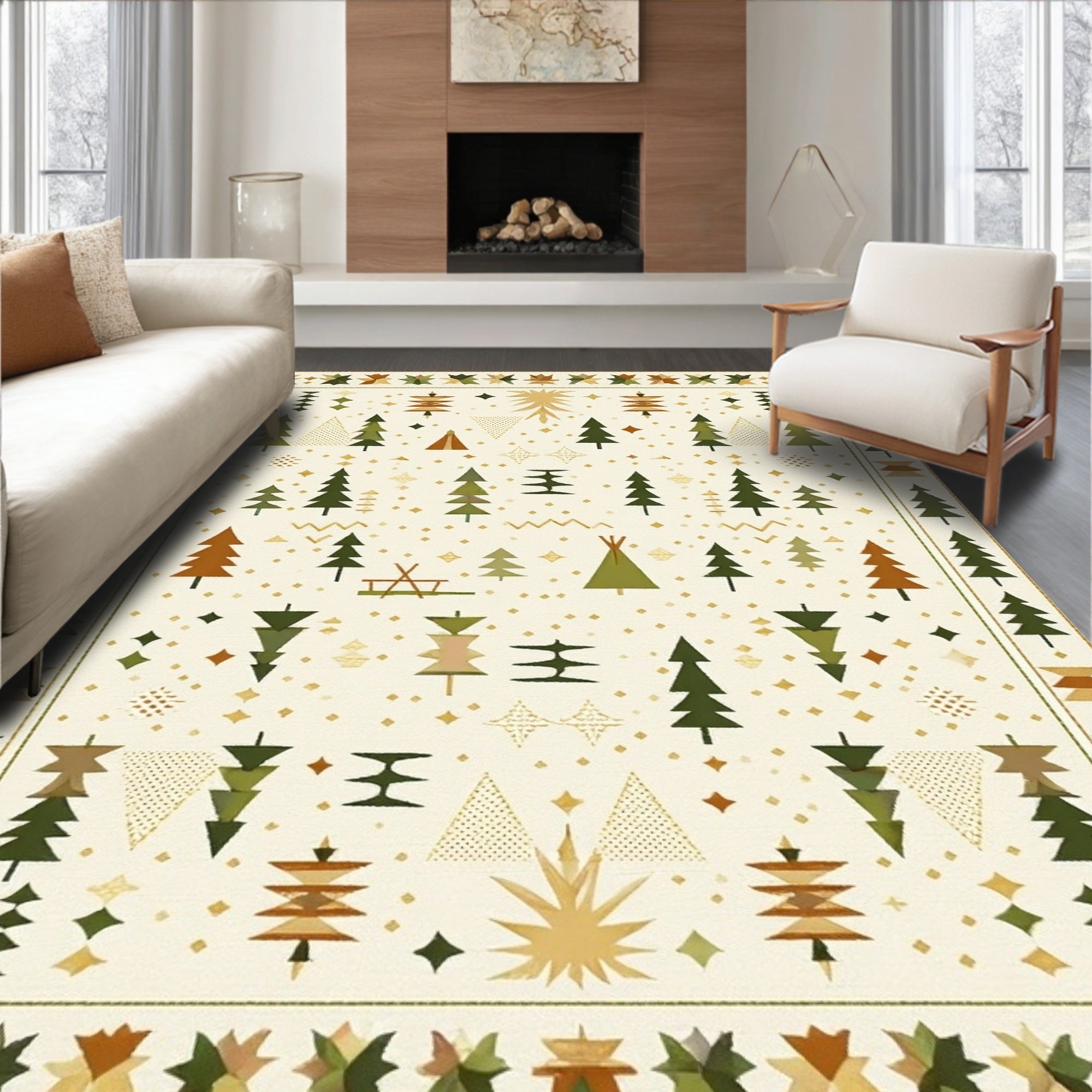 Ultra Soft Area Rug, Non Slip, Stain Resistant, Washable Area Rugs for Living Room, Bedroom, Beige Camper Expedition with Geometric Tent and Pine Tree Motifs(Beige) Overview: