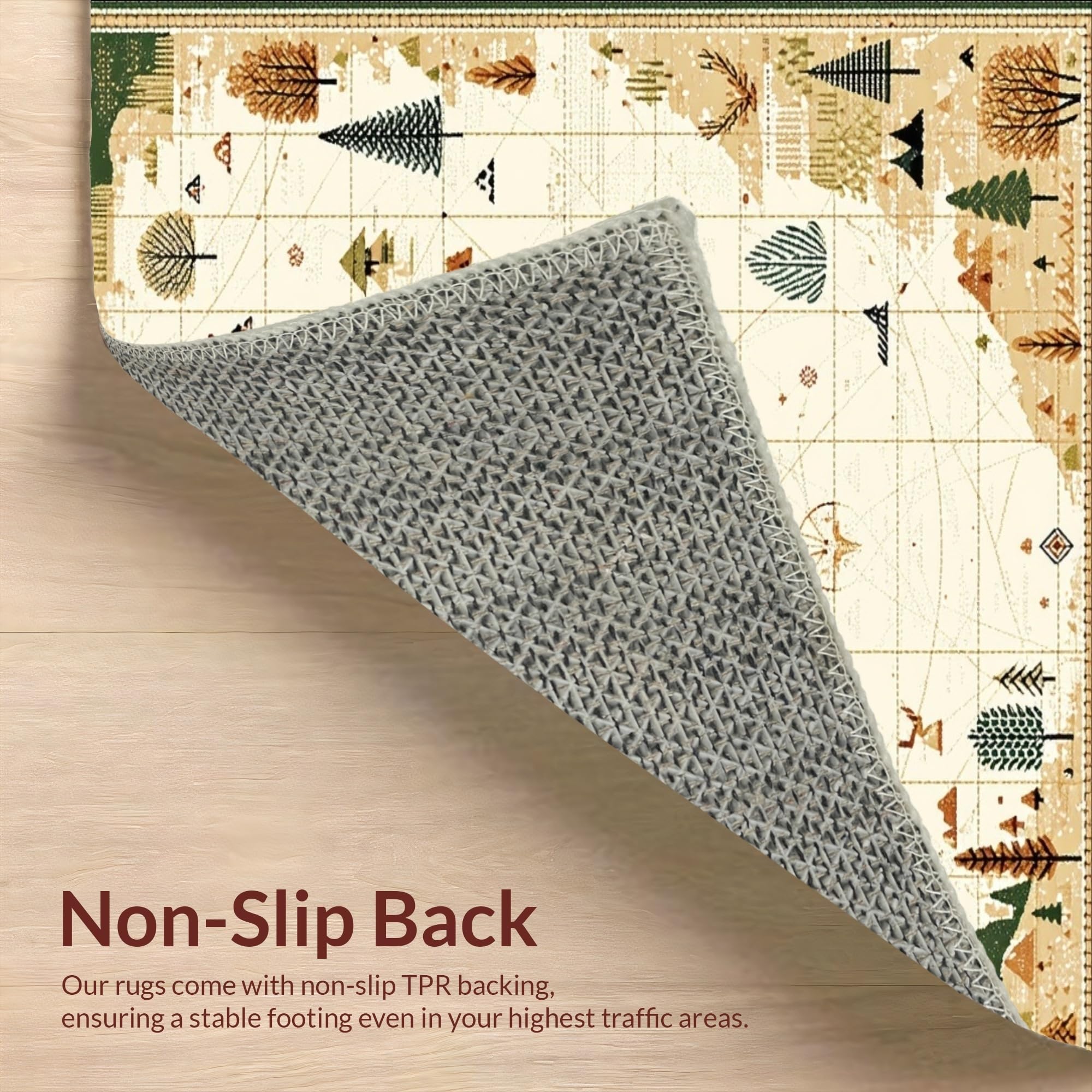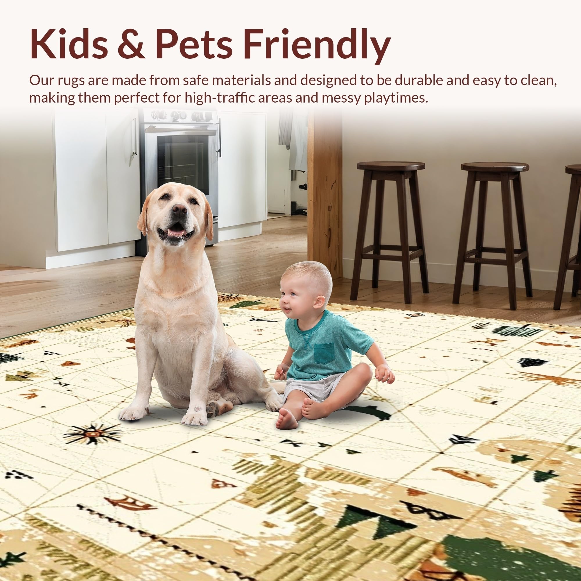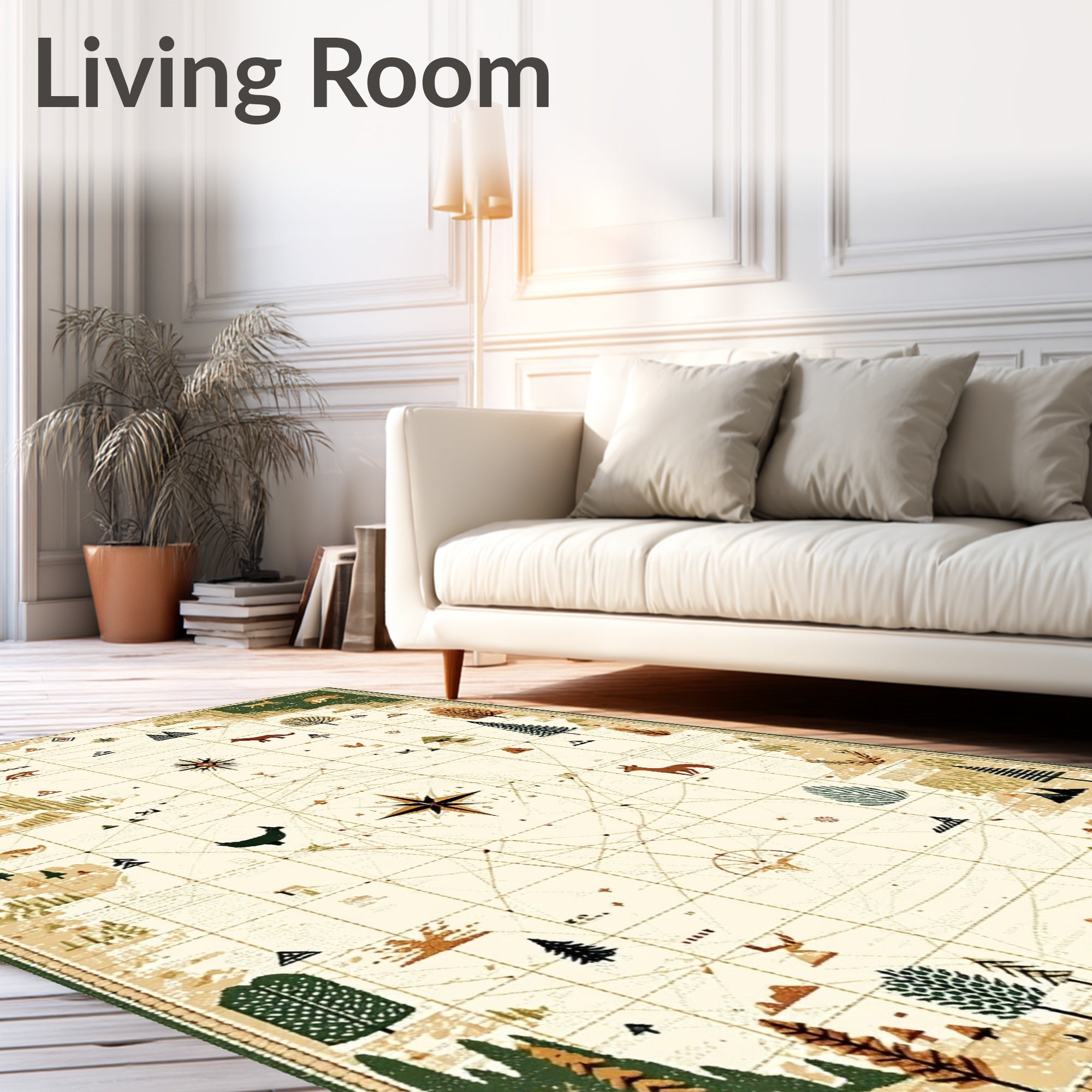 Ultra Soft Area Rug, Non Slip, Stain Resistant, Washable Area Rugs for Living Room, Bedroom, Beige Camper Journey with Vintage Map Elements and Woodland Creature Accents(Beige) Overview: