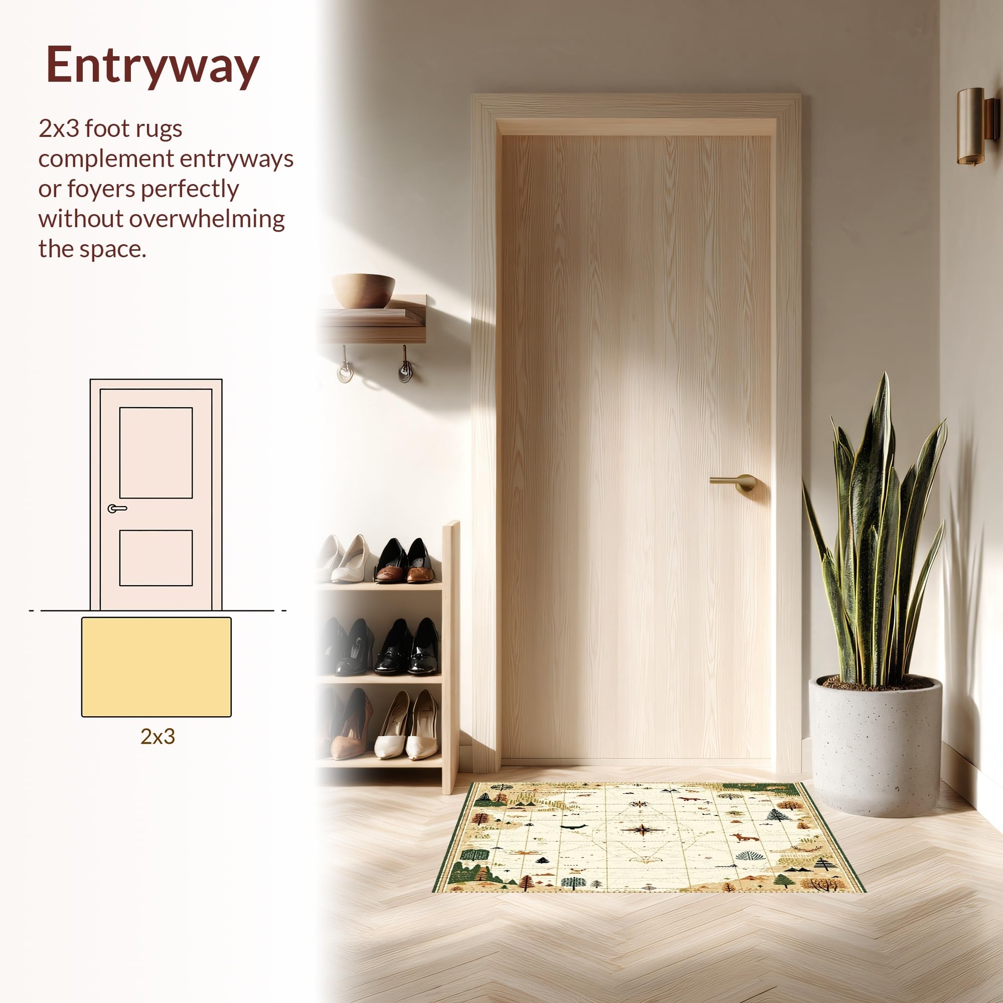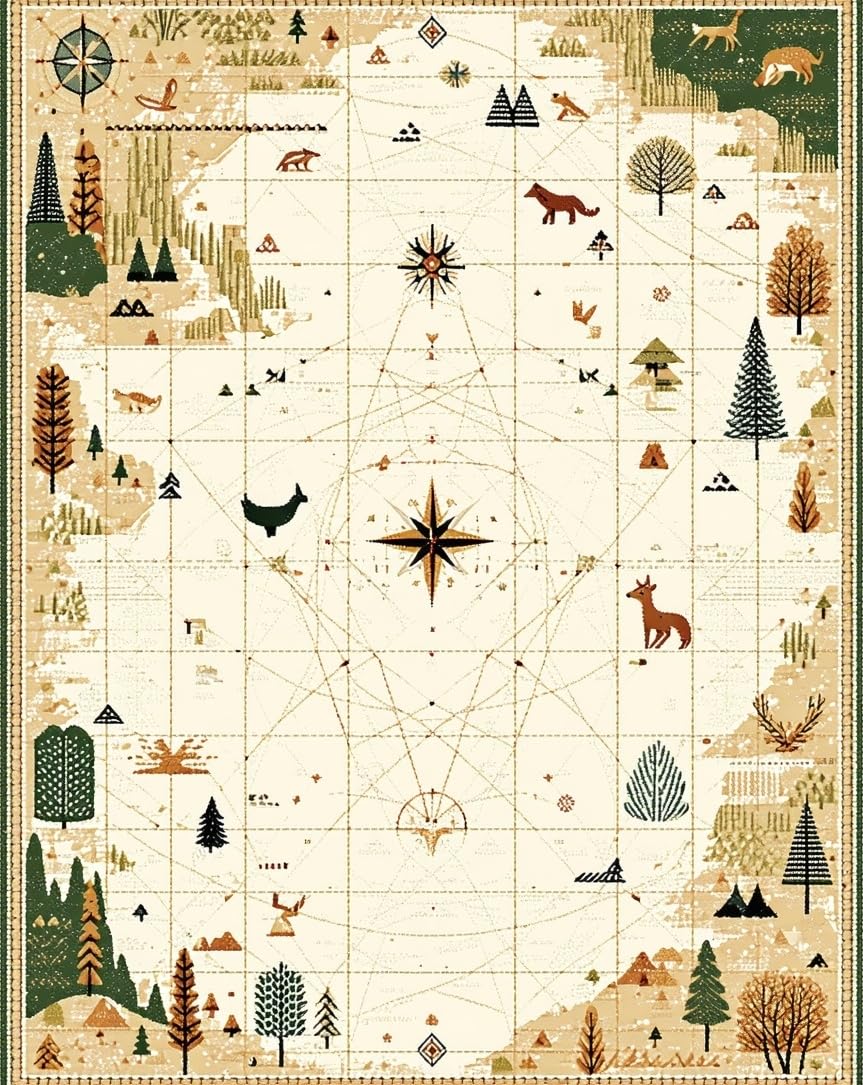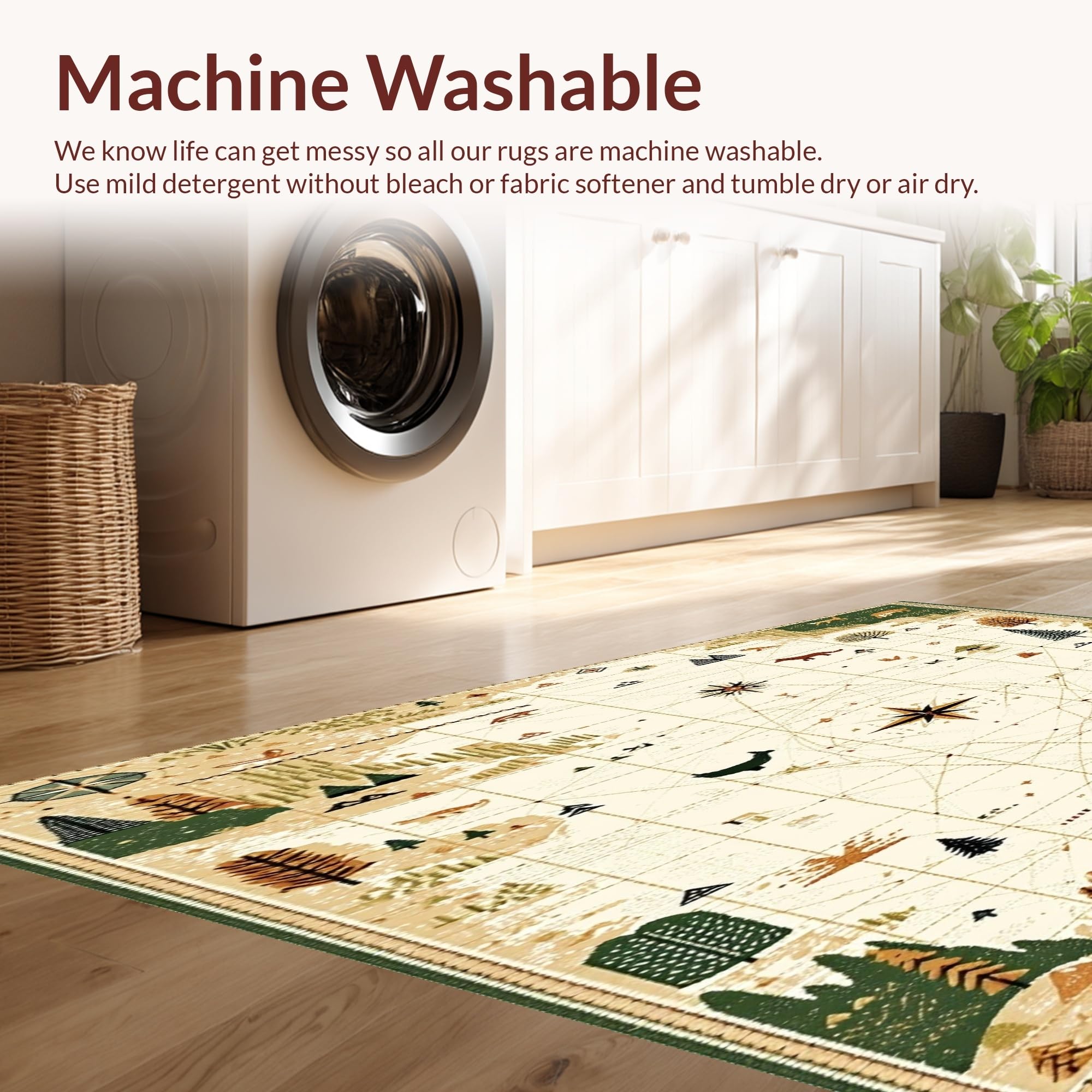 Ultra Soft Area Rug, Non Slip, Stain Resistant, Washable Area Rugs for Living Room, Bedroom, Beige Camper Journey with Vintage Map Elements and Woodland Creature Accents(Beige) Overview: