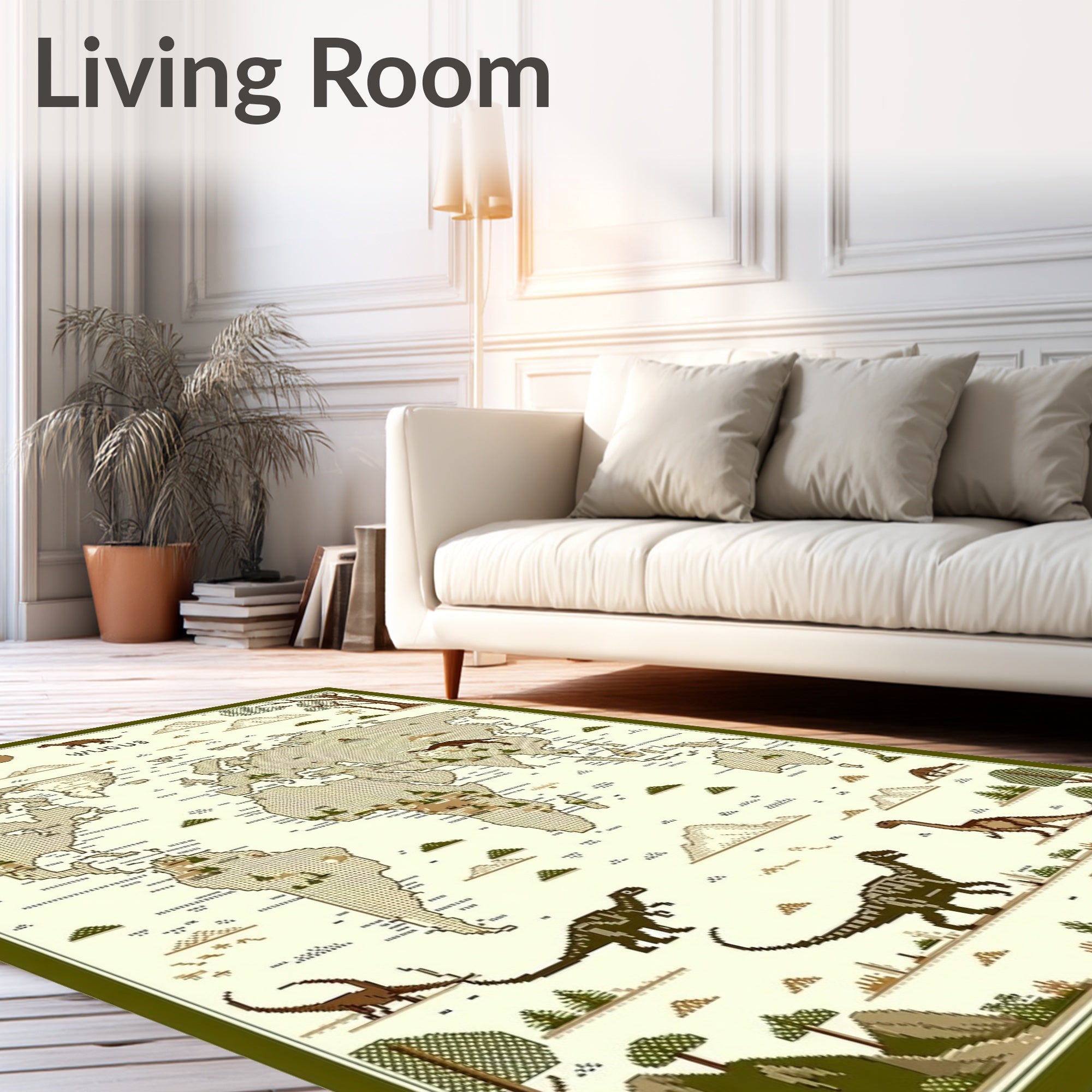 Ultra Soft Area Rug, Non Slip, Stain Resistant, Washable Area Rugs for Living Room, Bedroom, Beige Dinosaur with Classic World Map Design and Earth Tones(Brown) Overview: