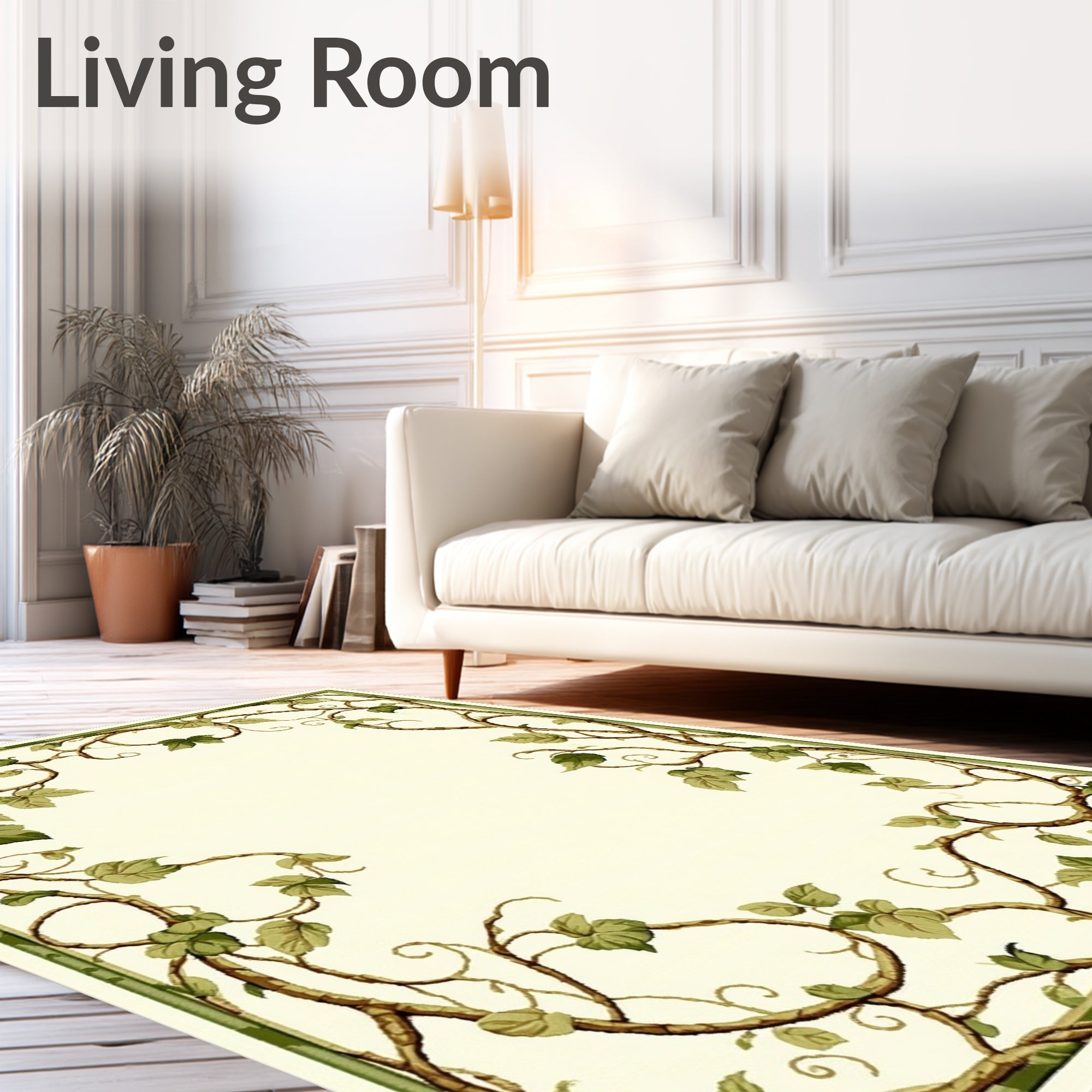 Ultra Soft Area Rug, Non Slip, Stain Resistant, Washable Area Rugs for Living Room, Bedroom, Beige Green Botanical Scrollwork Easy Clean Medium Pile(Beige) Overview:
