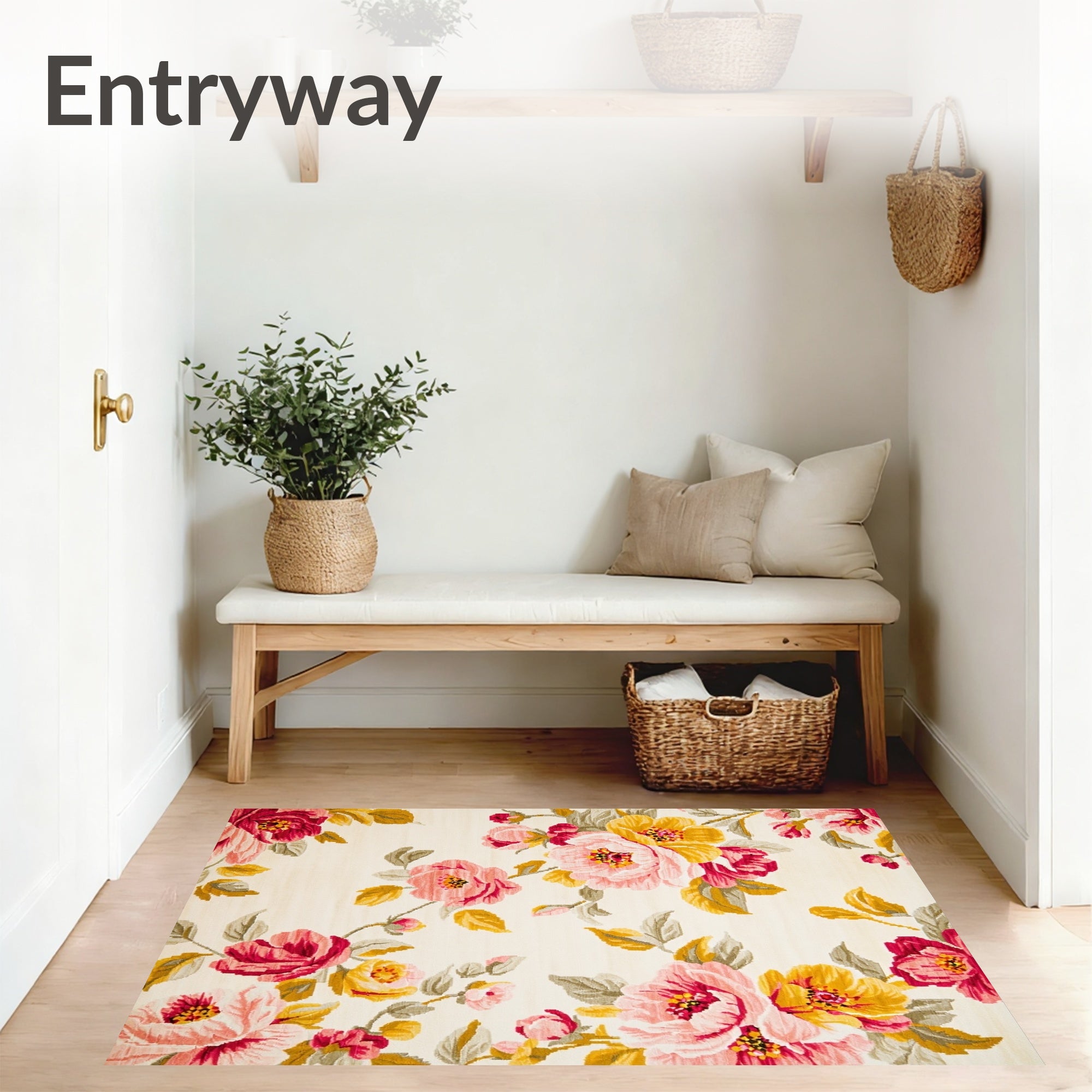 Beige Spring Bloom Entryway Area Vibrant Flower Design(Ivory)
