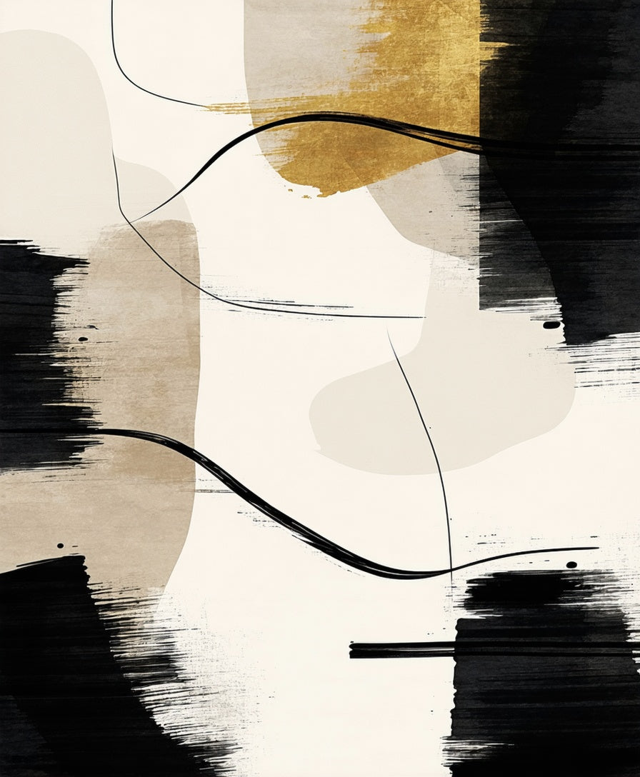 Beige with Abstract Black Brushstroke and Linear Accents(Beige)