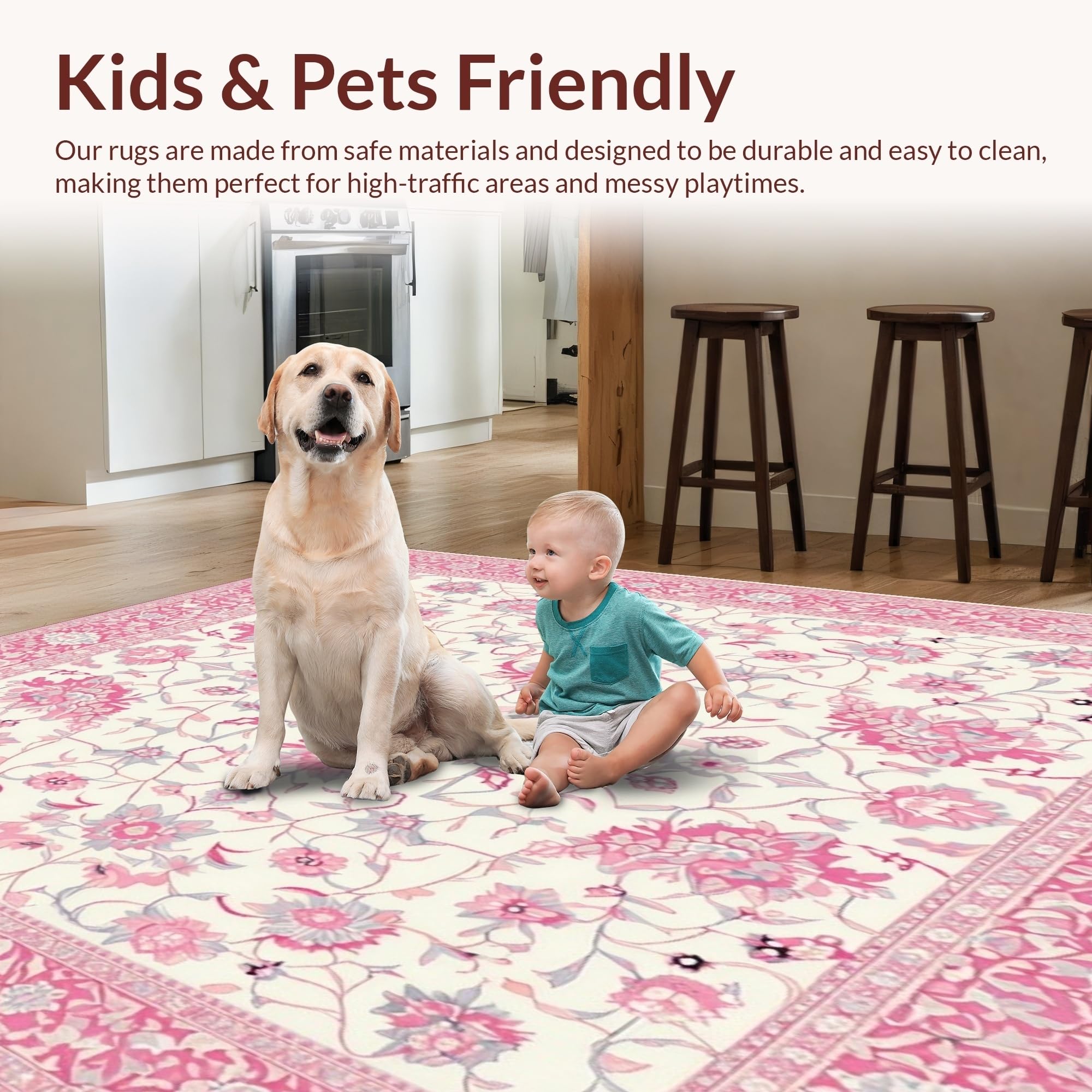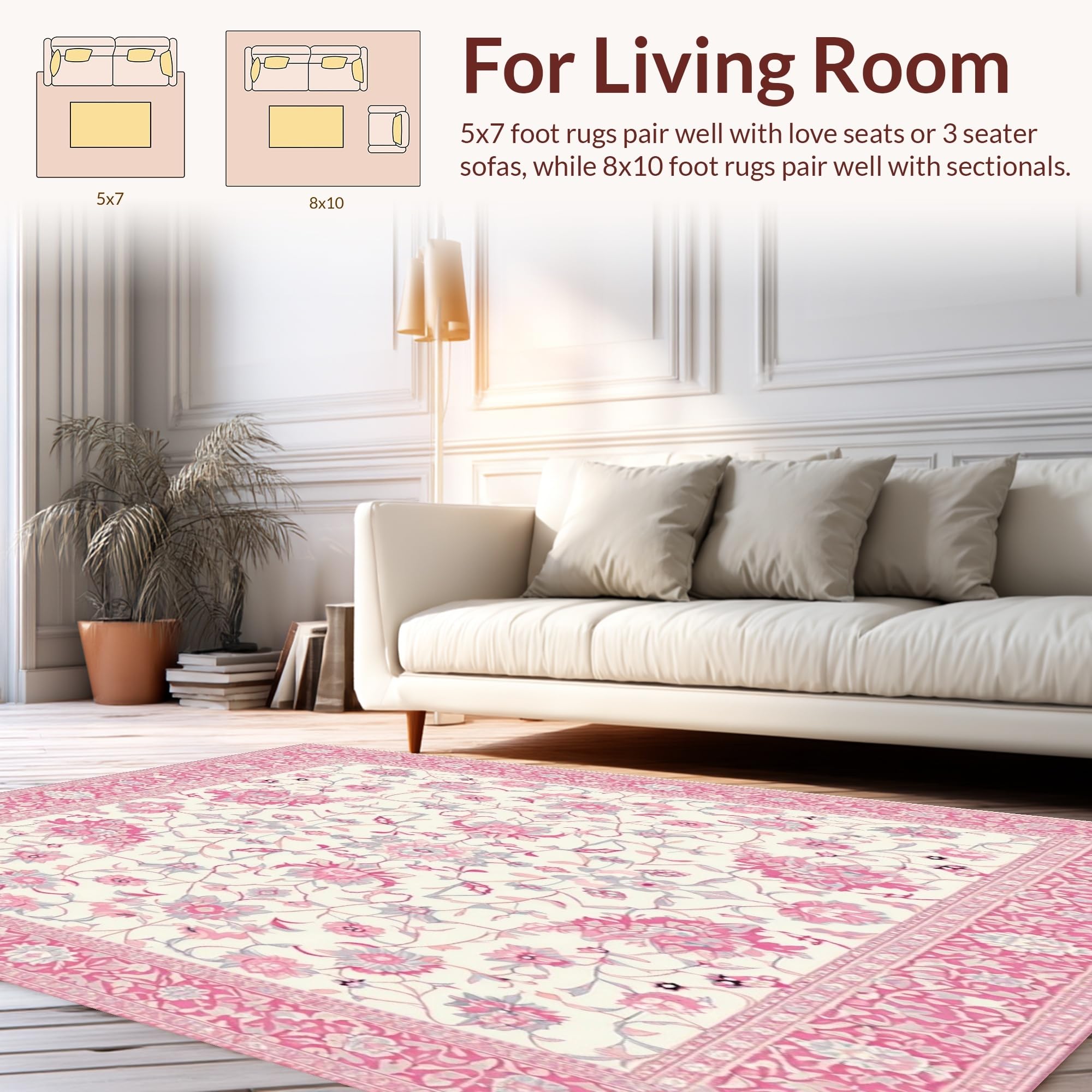Ultra Soft Area Rug, Non Slip, Stain Resistant, Washable Area Rugs for Living Room, Bedroom, Bethlehem Traditional White Area with Delicate Pink Petals Design(Ivory) Overview: