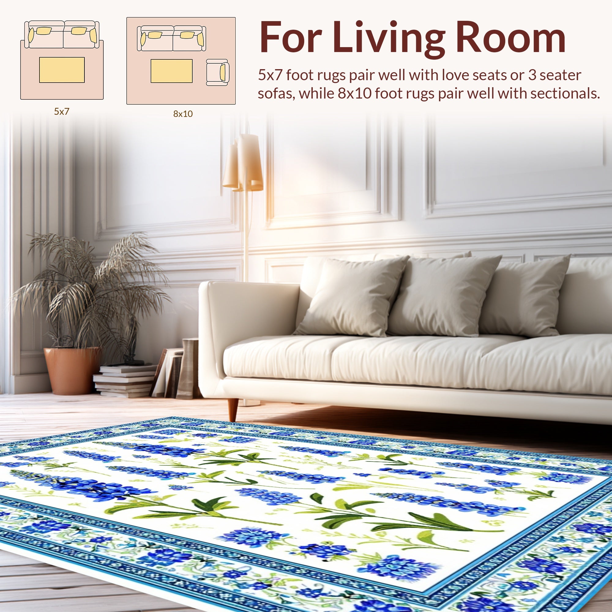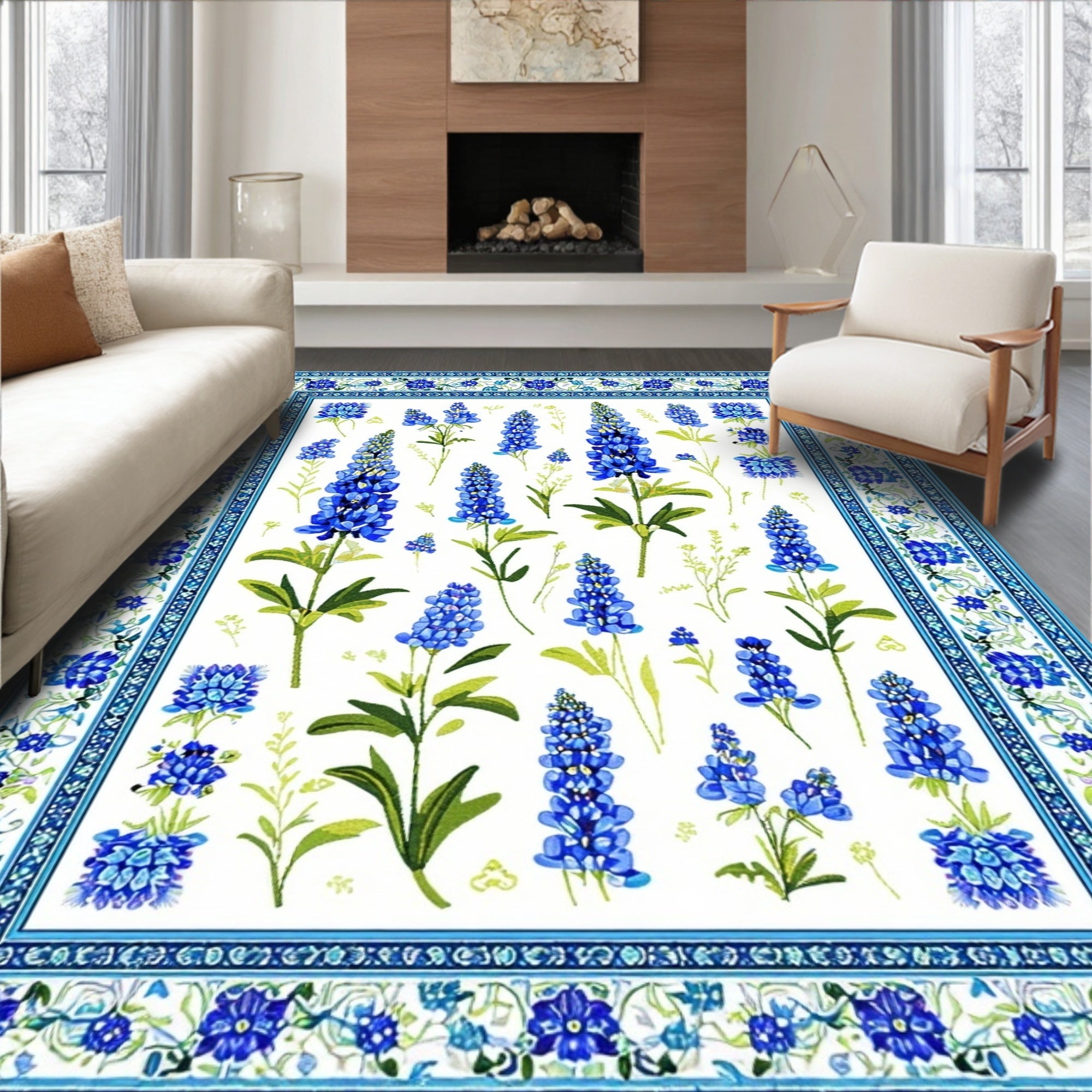 Flatwoven High Traffic Area Rug, Bluebonnet Burst Floral Design, Non Slip, Stain Resistant, Washable Area Rugs for Living Room, Bedroom (Blue) Overview: