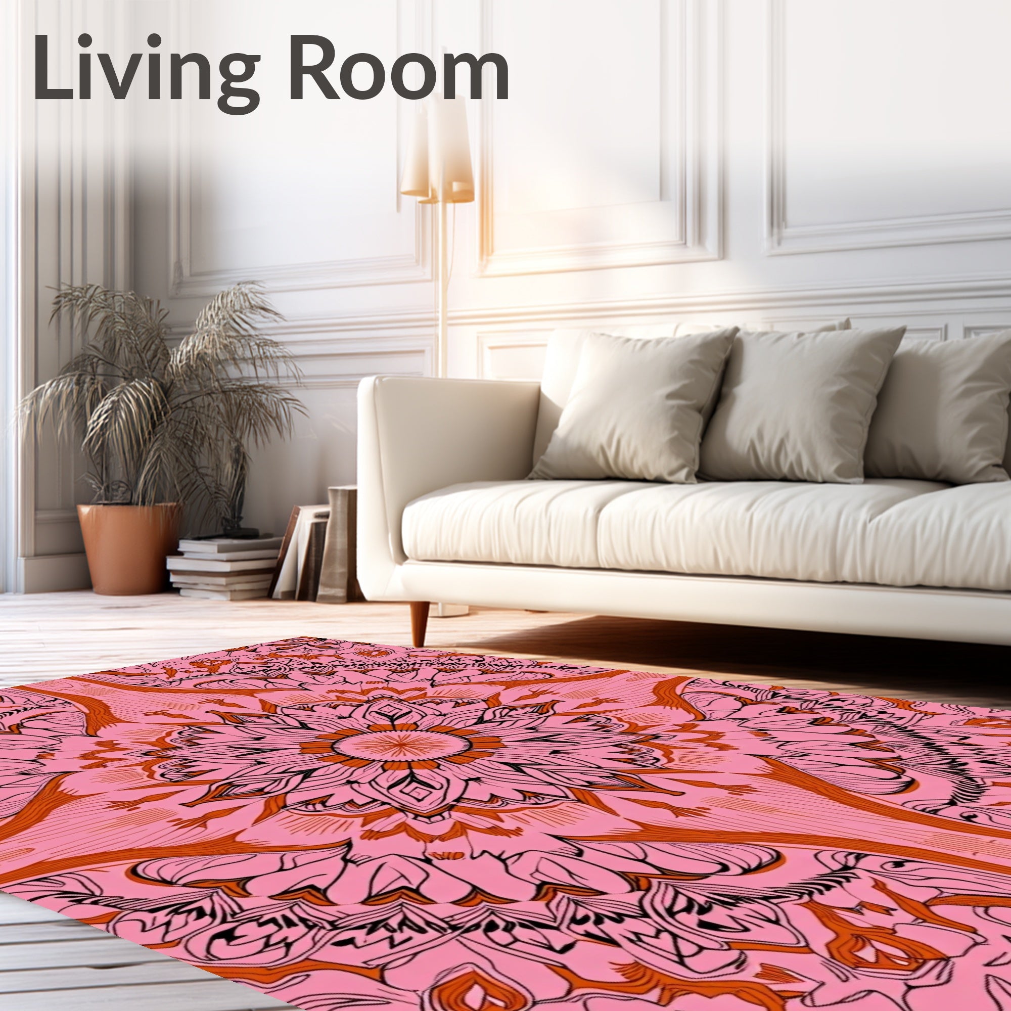 Ultra Soft Area Rug, Non Slip, Stain Resistant, Washable Area Rugs for Living Room, Bedroom, Boho Autumn Dreamscape with Interlocking Sunburst and Foliage(Pink) Overview: