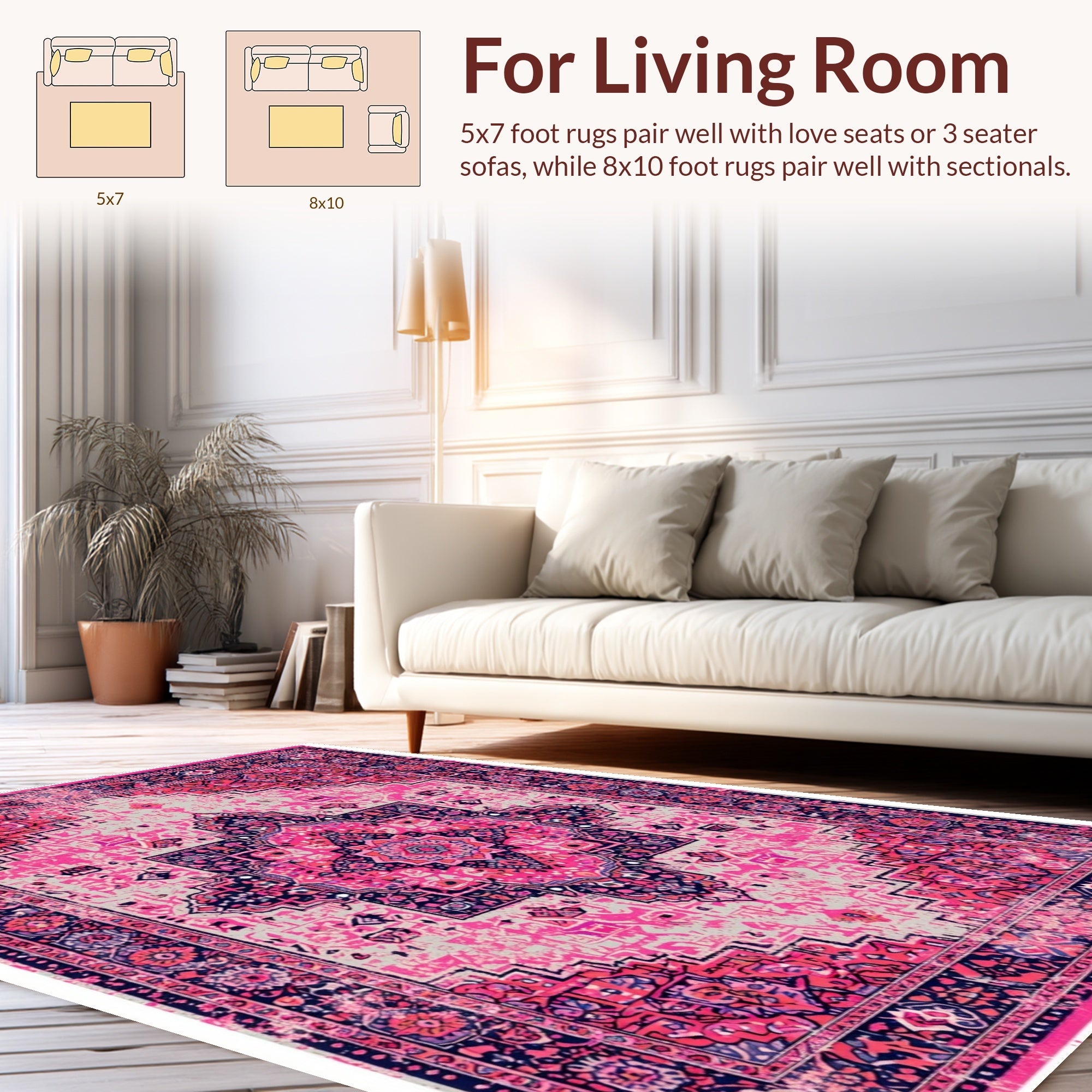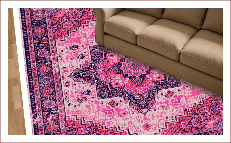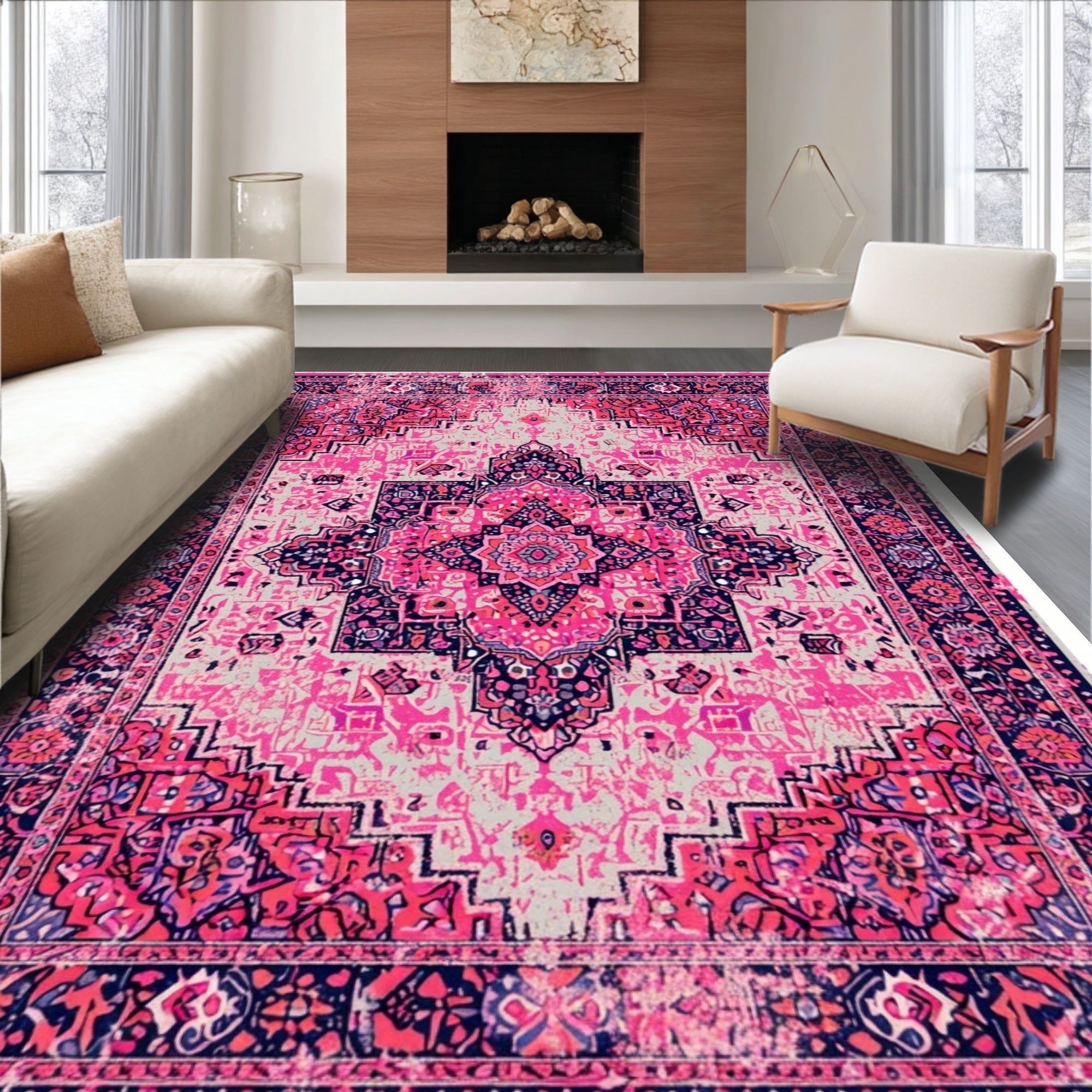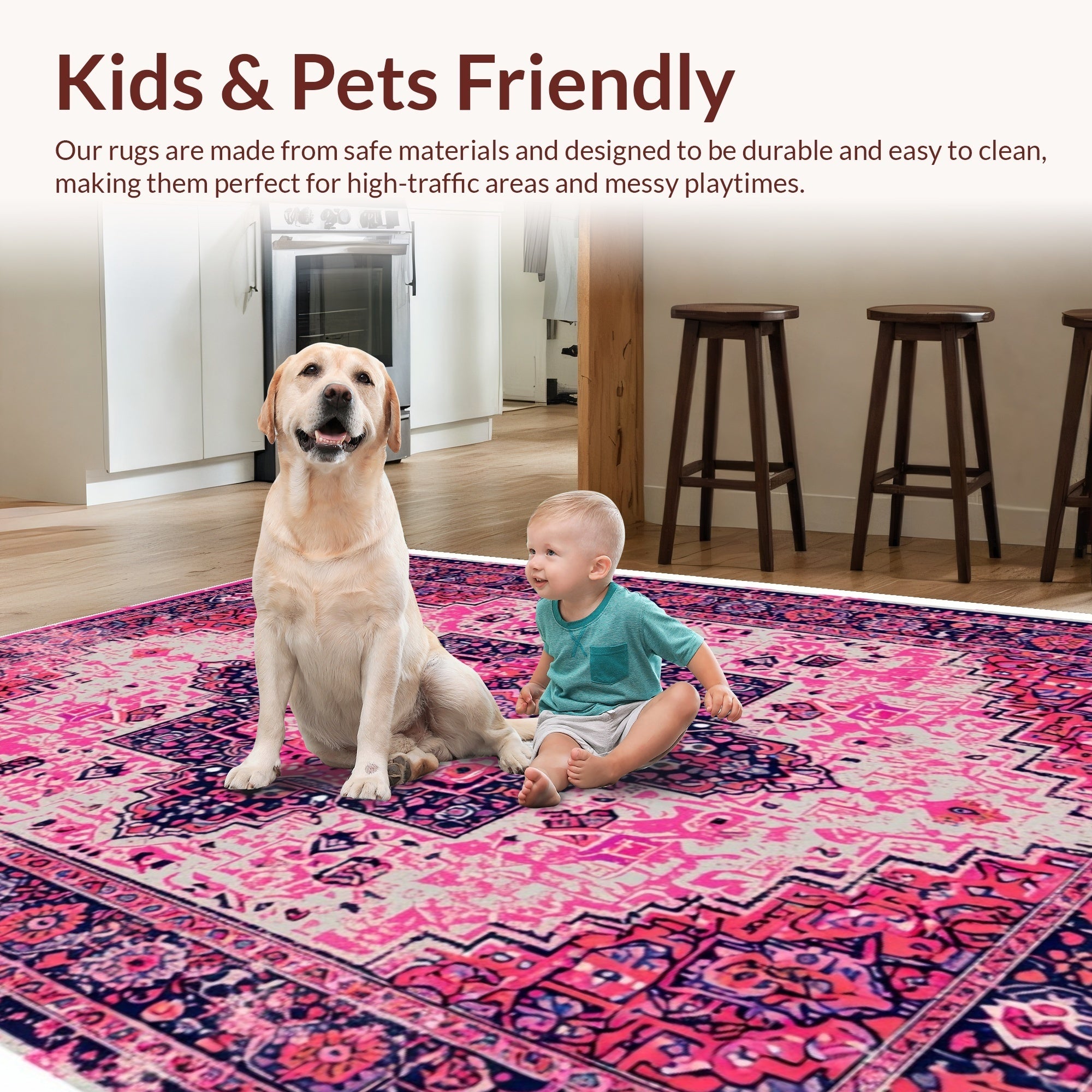 Ultra Soft Area Rug, Non Slip, Stain Resistant, Washable Area Rugs for Living Room, Bedroom, Boho Medallion Distressed(Pink) Overview: