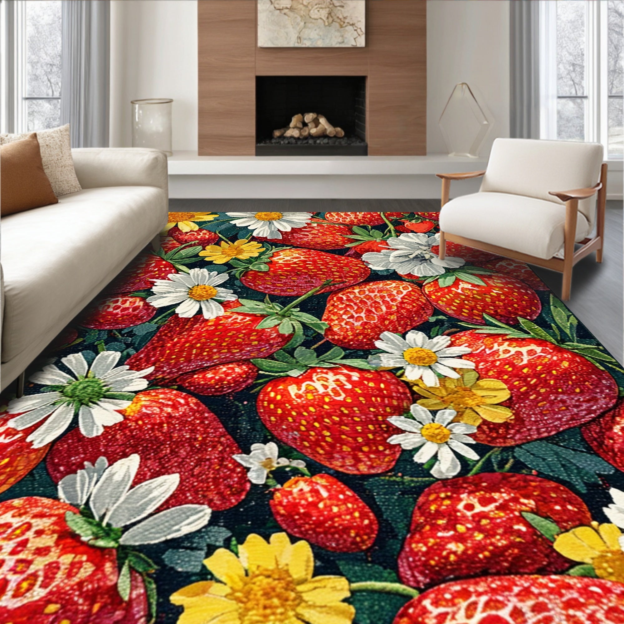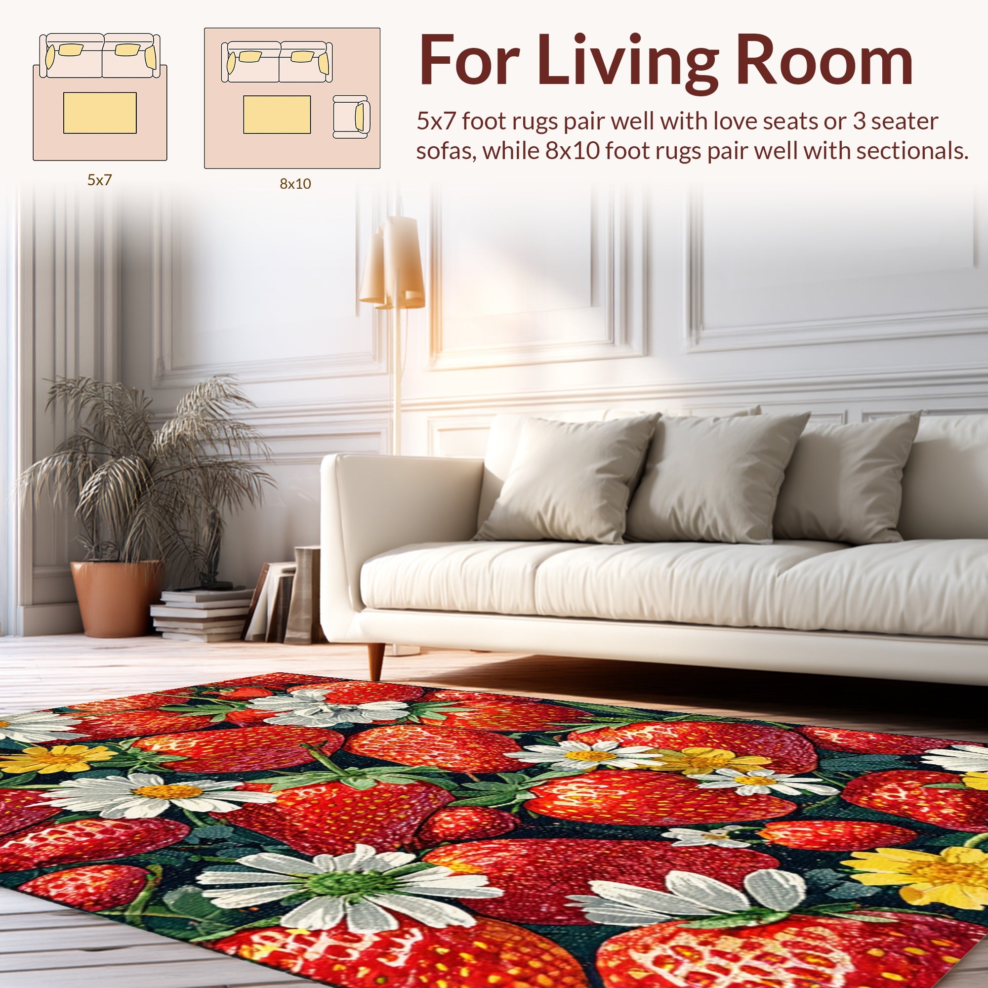 Ultra Soft Area Rug, Non Slip, Stain Resistant, Washable Area Rugs for Living Room, Bedroom, Boho Summer Fruits Mat Strawberries and Floral(Red) Overview: