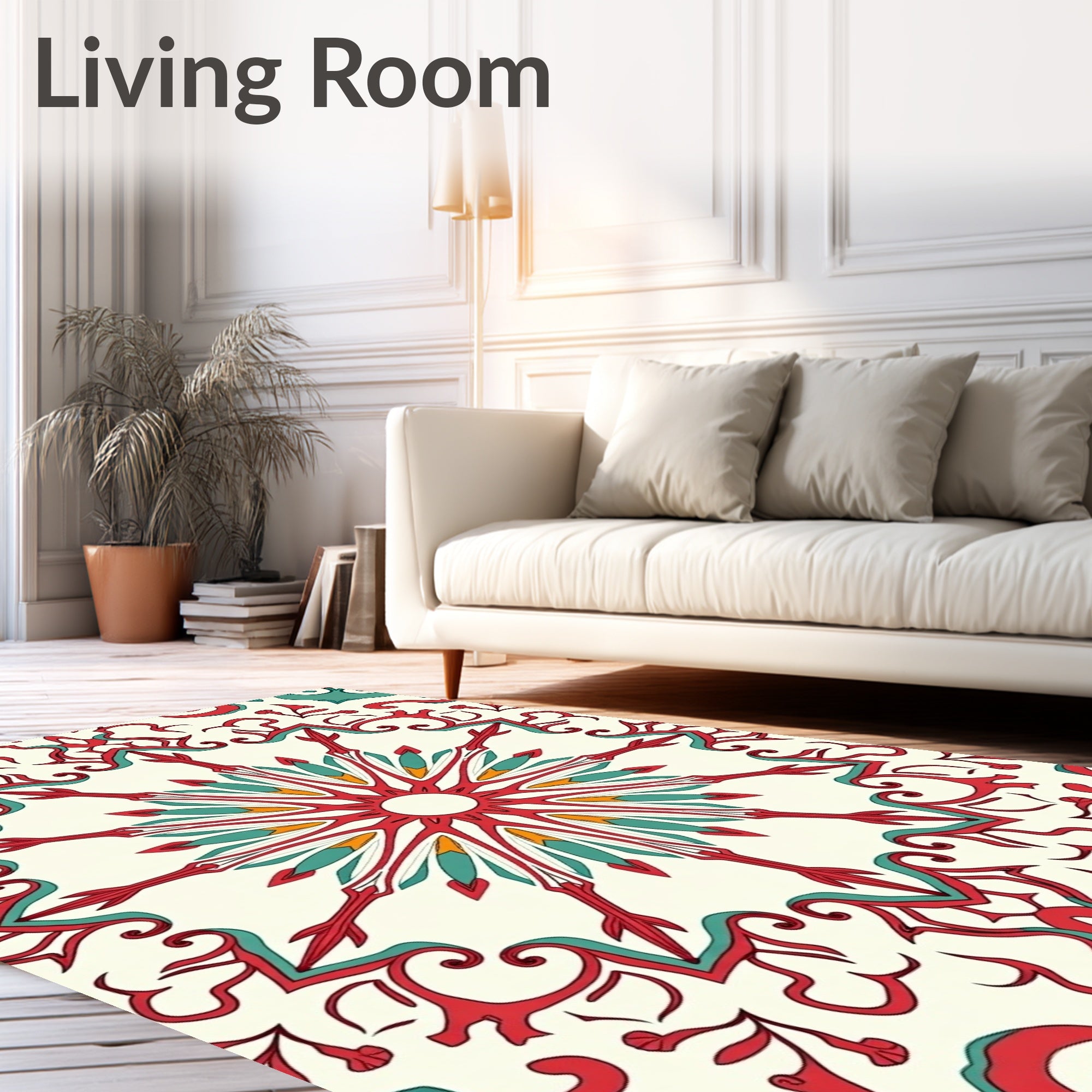 Ultra Soft Area Rug, Non Slip, Stain Resistant, Washable Area Rugs for Living Room, Bedroom, Boho Sunburst Design with Twisting Leaf Motifs(Red) Overview:
