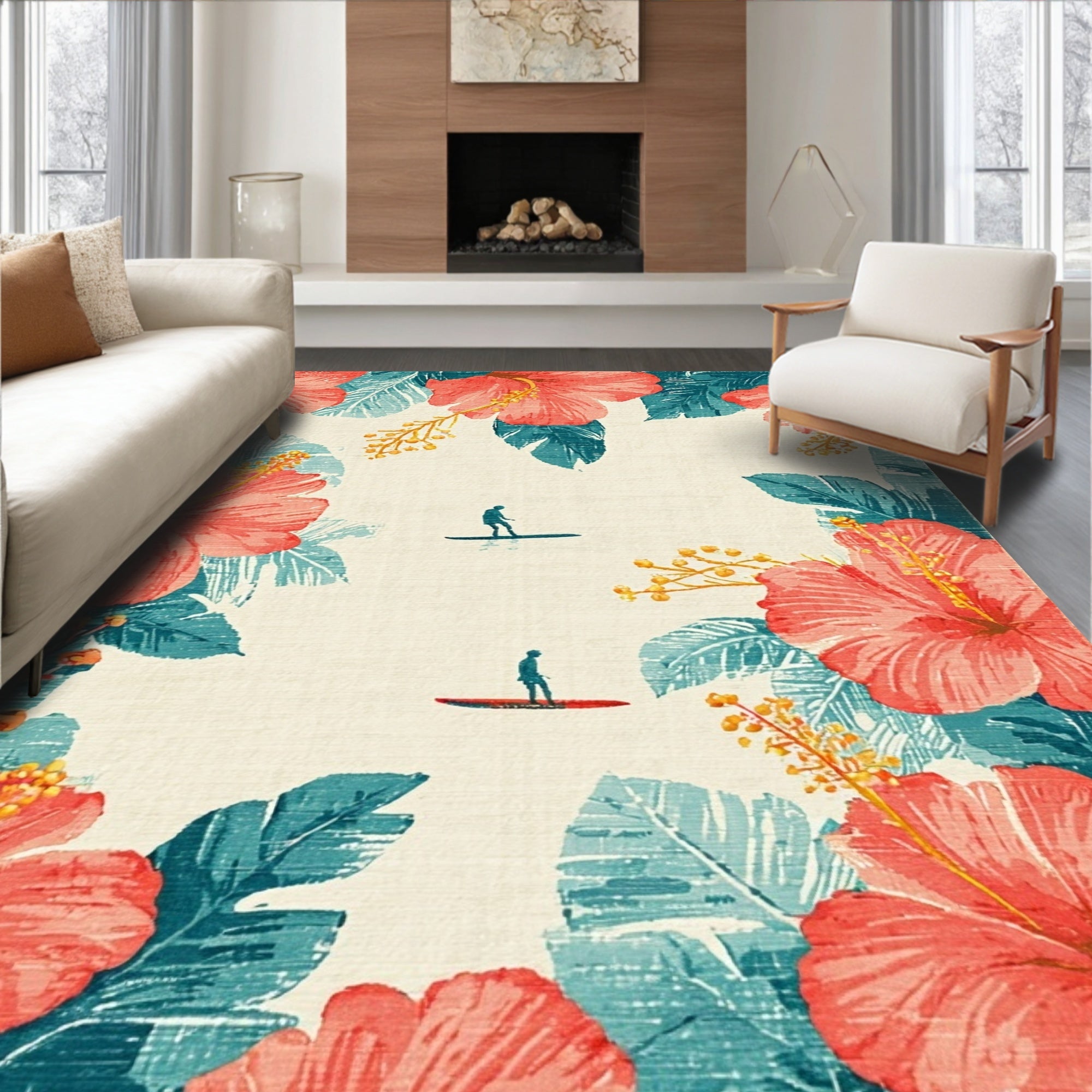 Ultra Soft Area Rug, Non Slip, Stain Resistant, Washable Area Rugs for Living Room, Bedroom, Boho Surf Beach Rug Tropical Hibiscus Print(Red) Overview:
