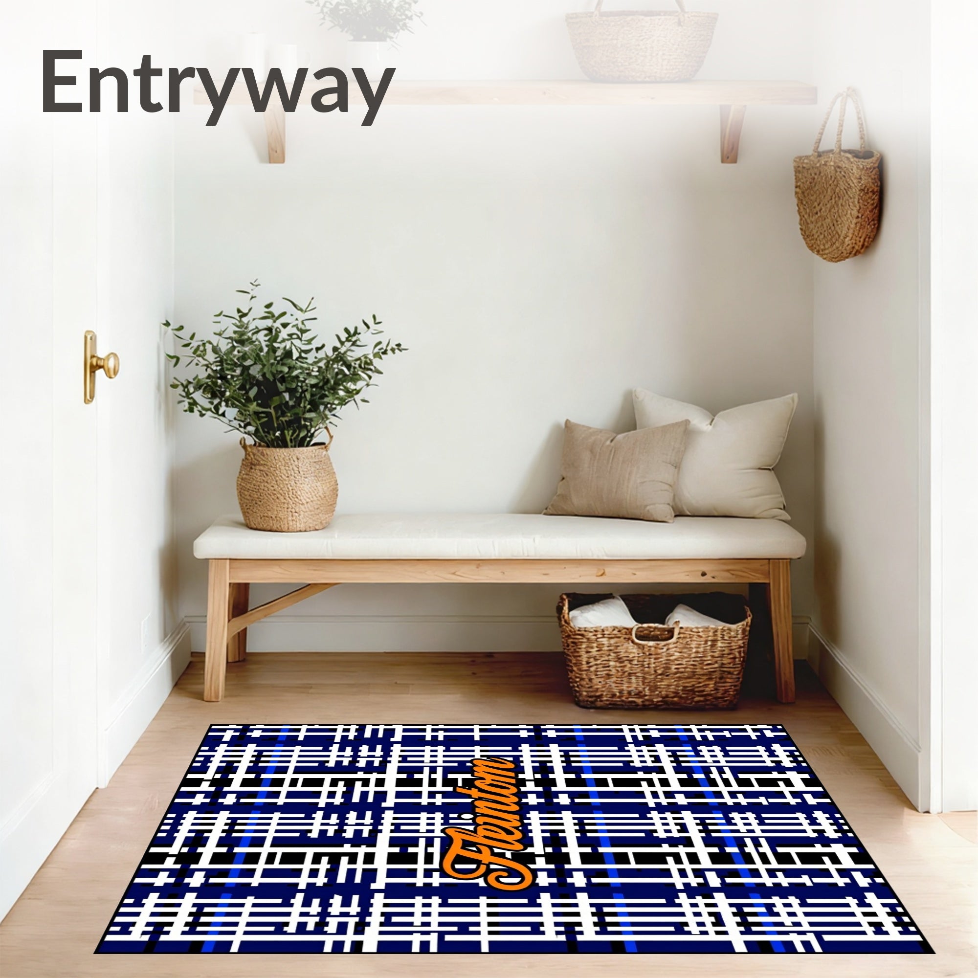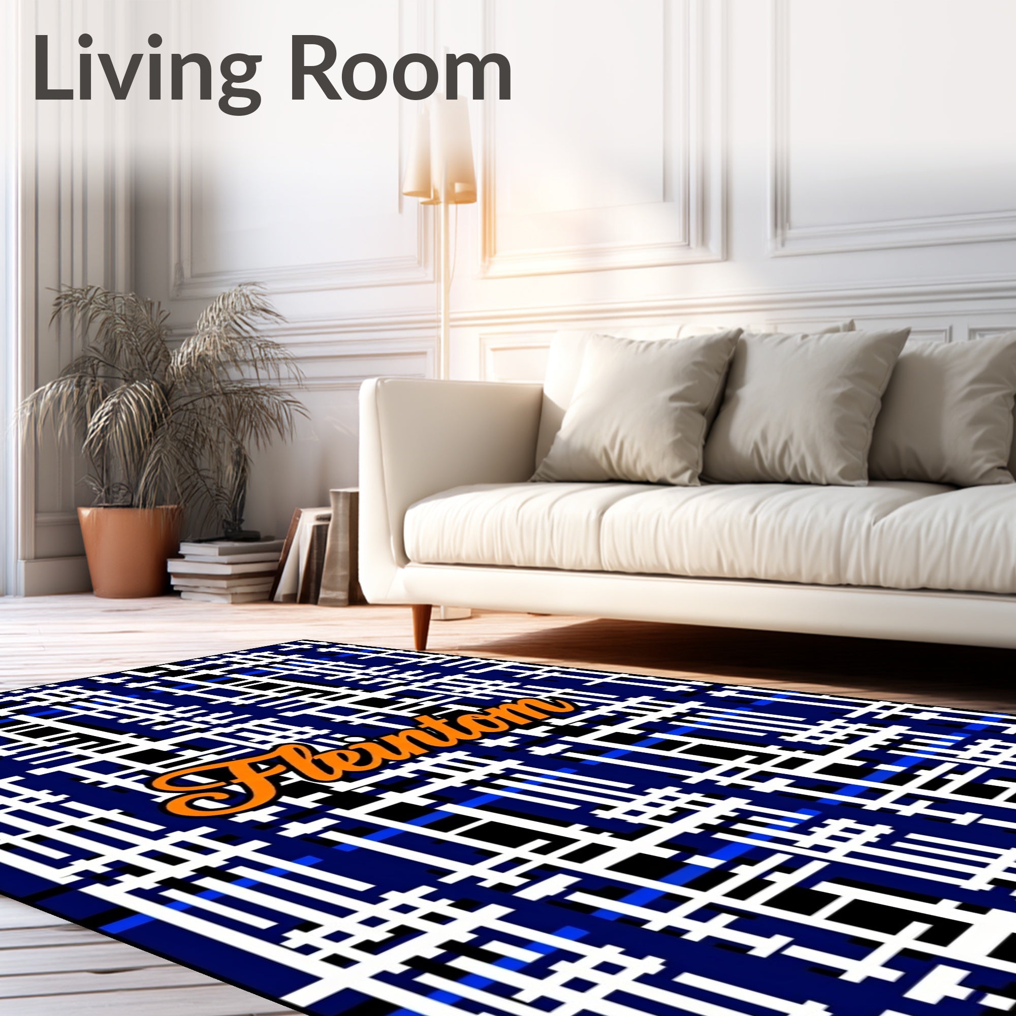 Ultra Soft Area Rug, Non Slip, Stain Resistant, Washable Area Rugs for Living Room, Bedroom, Bold Plaid Check Featuring Smiling Phantom and Cursive Lettering(Blue) Overview: