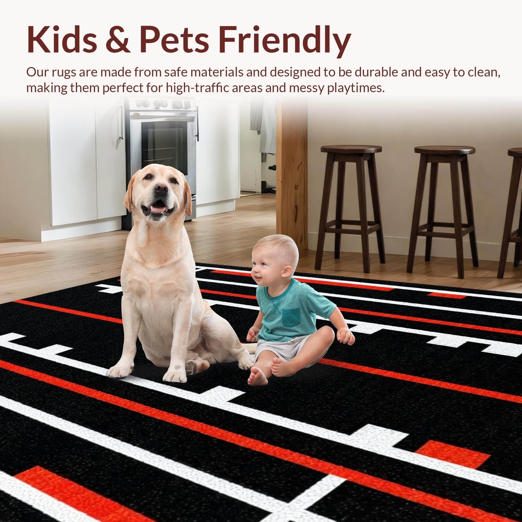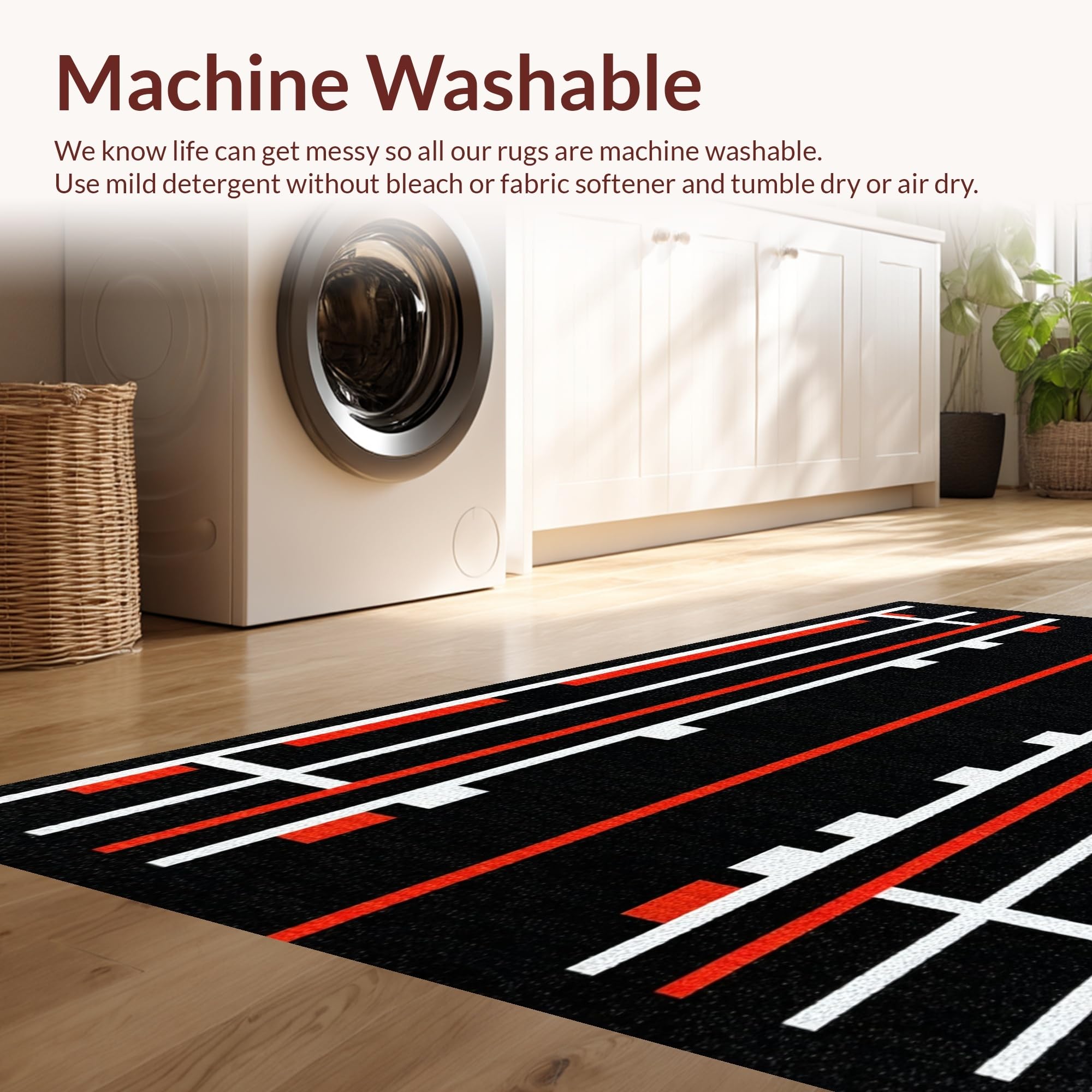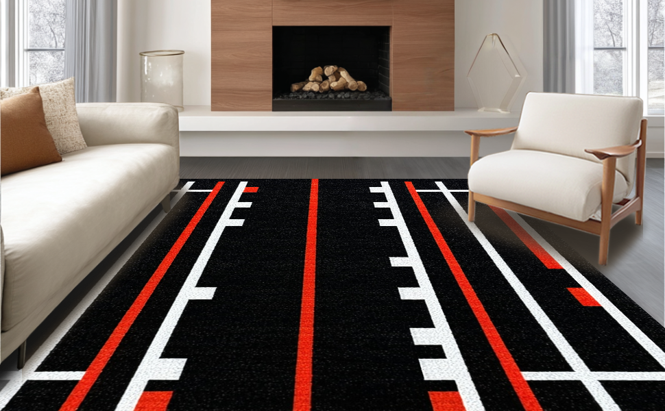 Ultra Soft Area Rug, Non Slip, Stain Resistant, Washable Area Rugs for Living Room, Bedroom, Bold Speed Route Visual Appeal(Black) Overview: