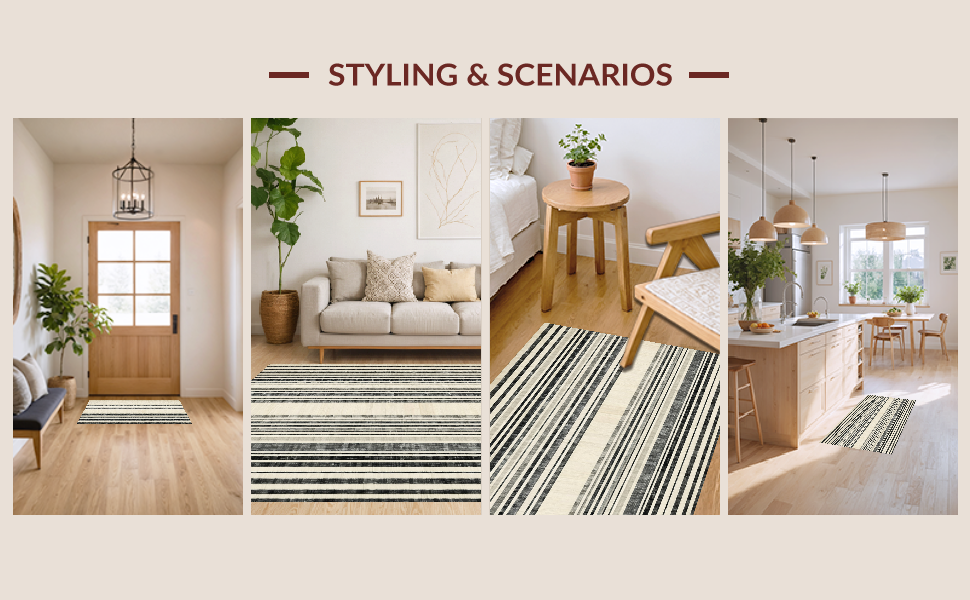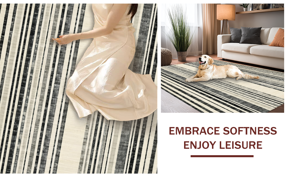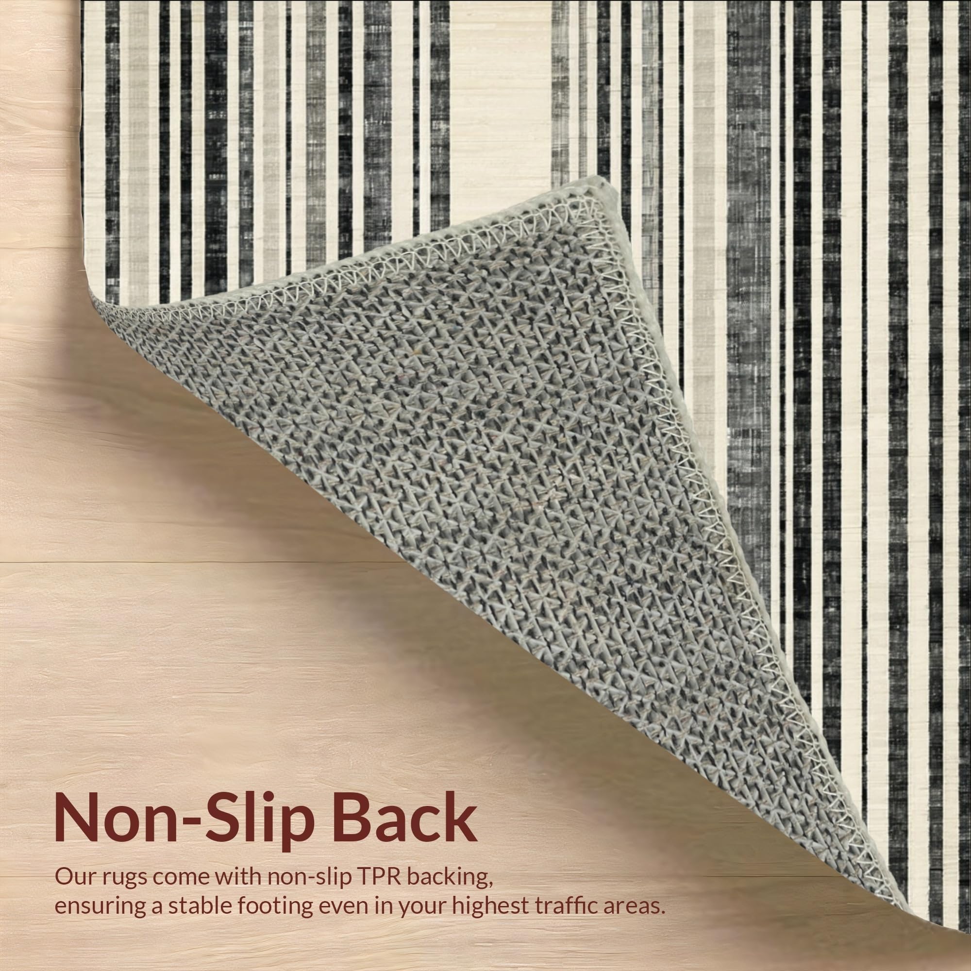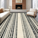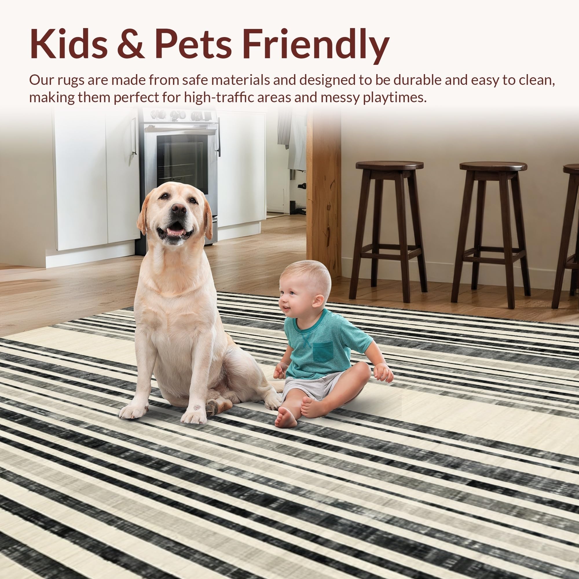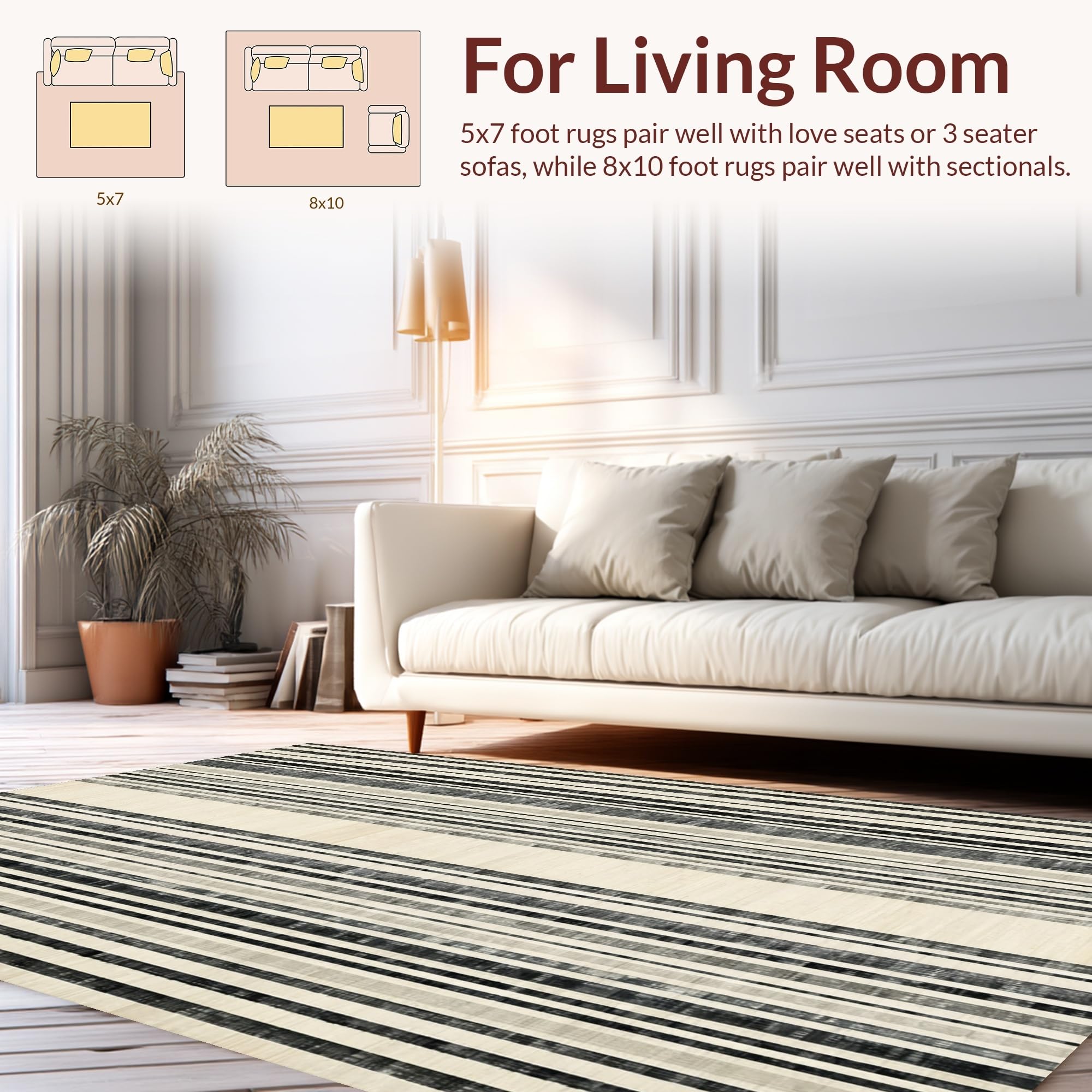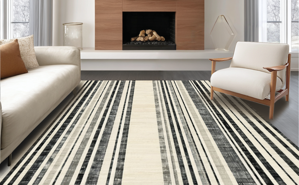 Ultra Soft Area Rug, Non Slip, Stain Resistant, Washable Area Rugs for Living Room, Bedroom, Bold Striped Contrast Rug with Overlapping Black and White Linear Bands(Beige) Overview: