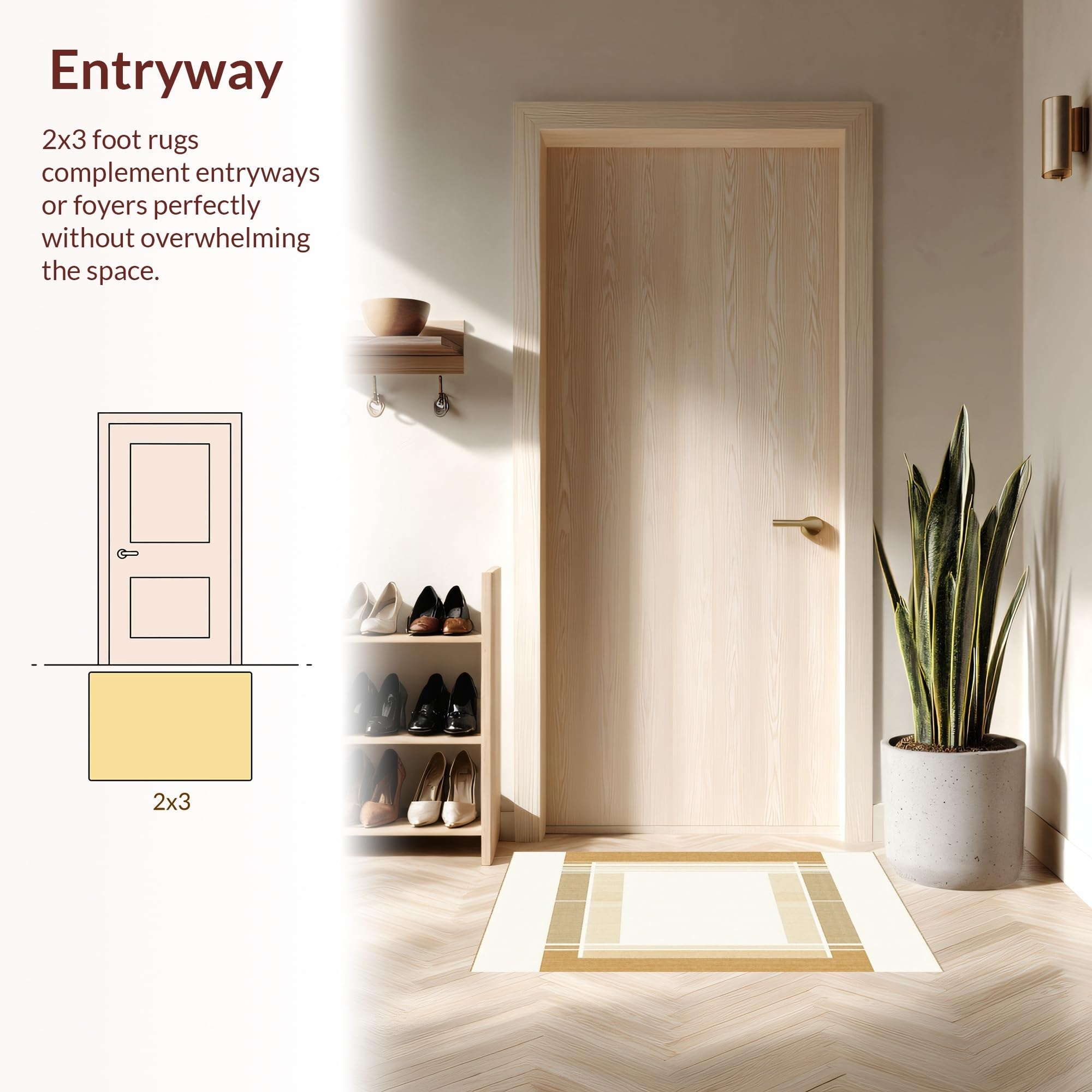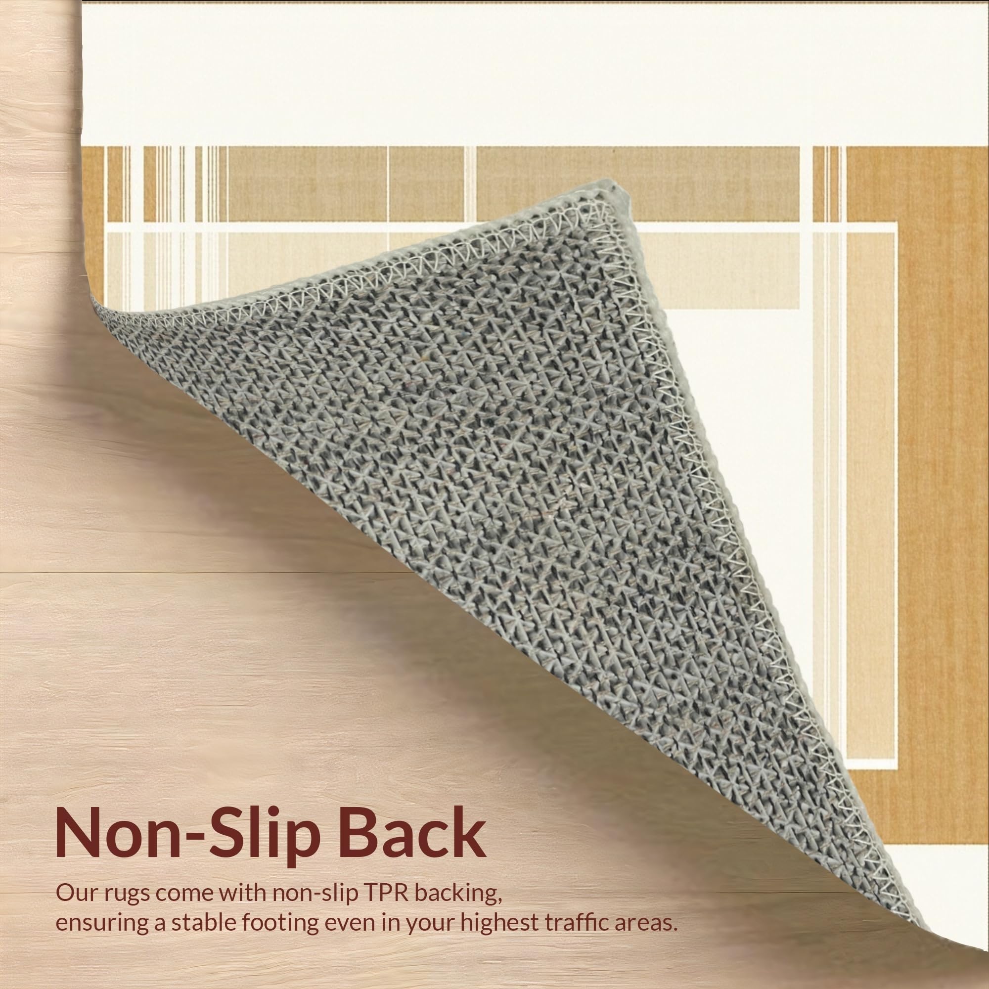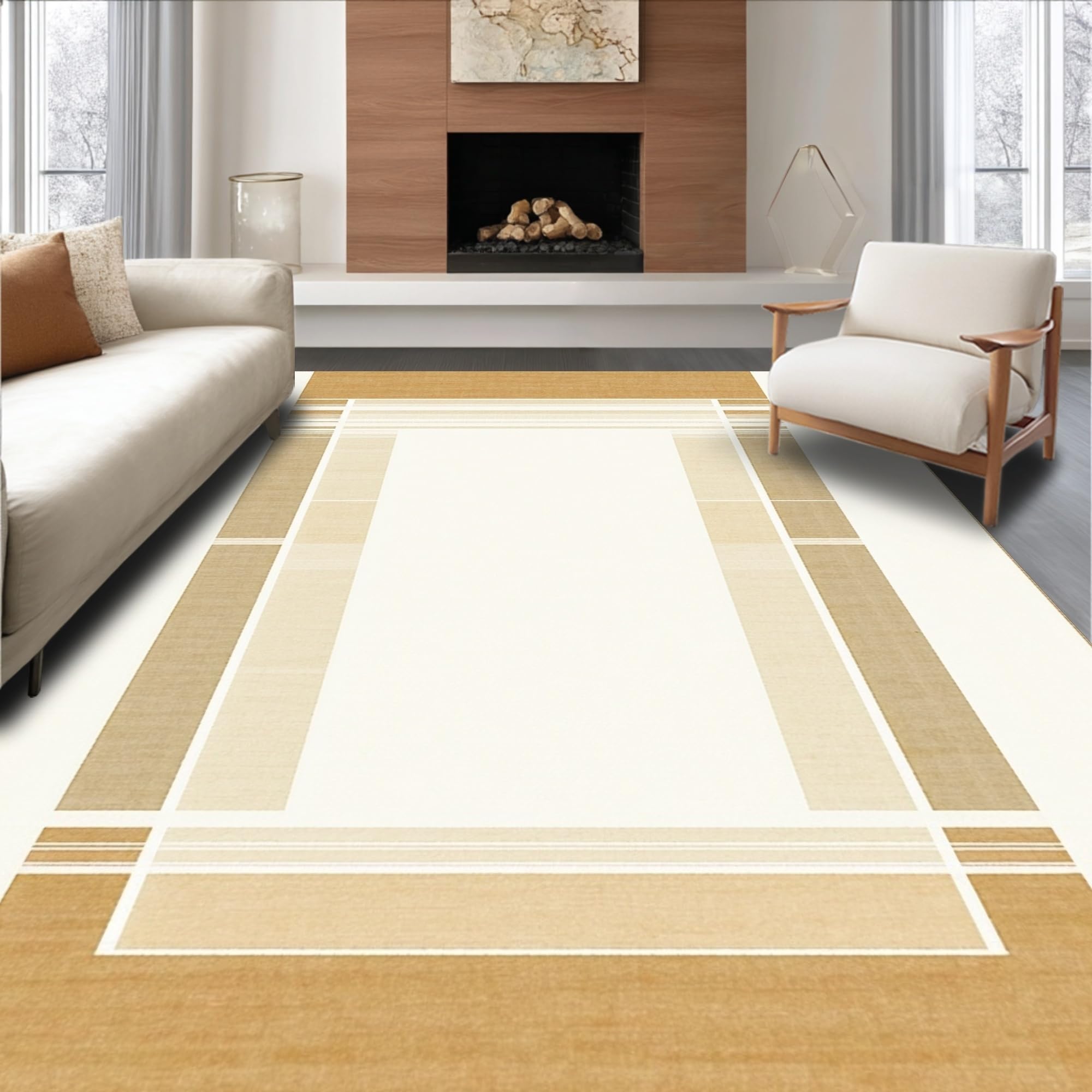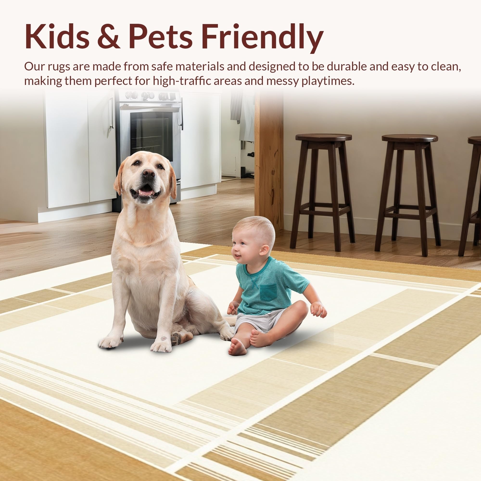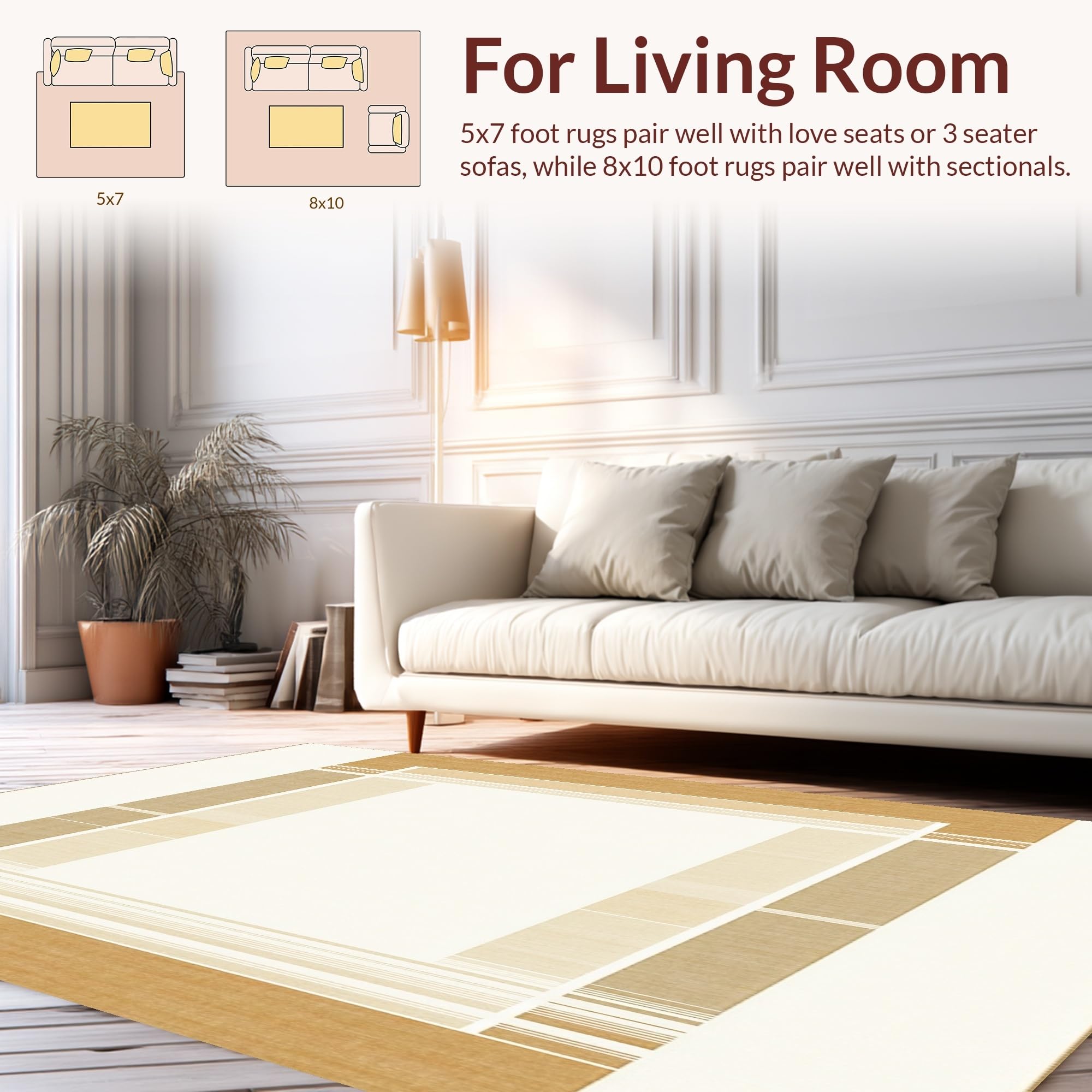Ultra Soft Area Rug, Non Slip, Stain Resistant, Washable Area Rugs for Living Room, Bedroom, Bordered Geometric Area Showcasing Subtle Striated Lines and Beige Hues(Beige) Overview: