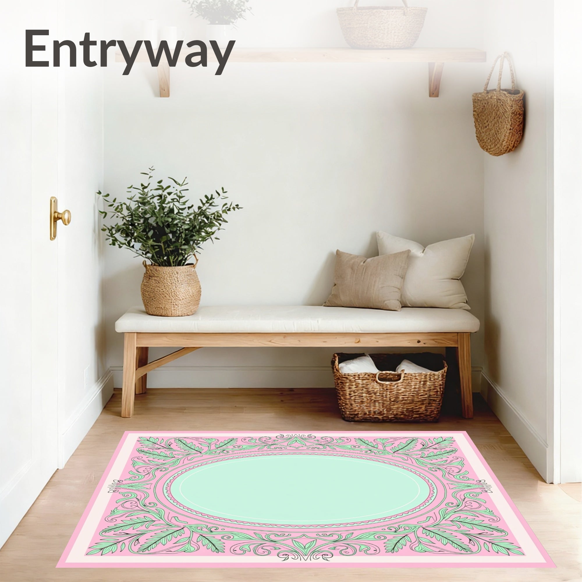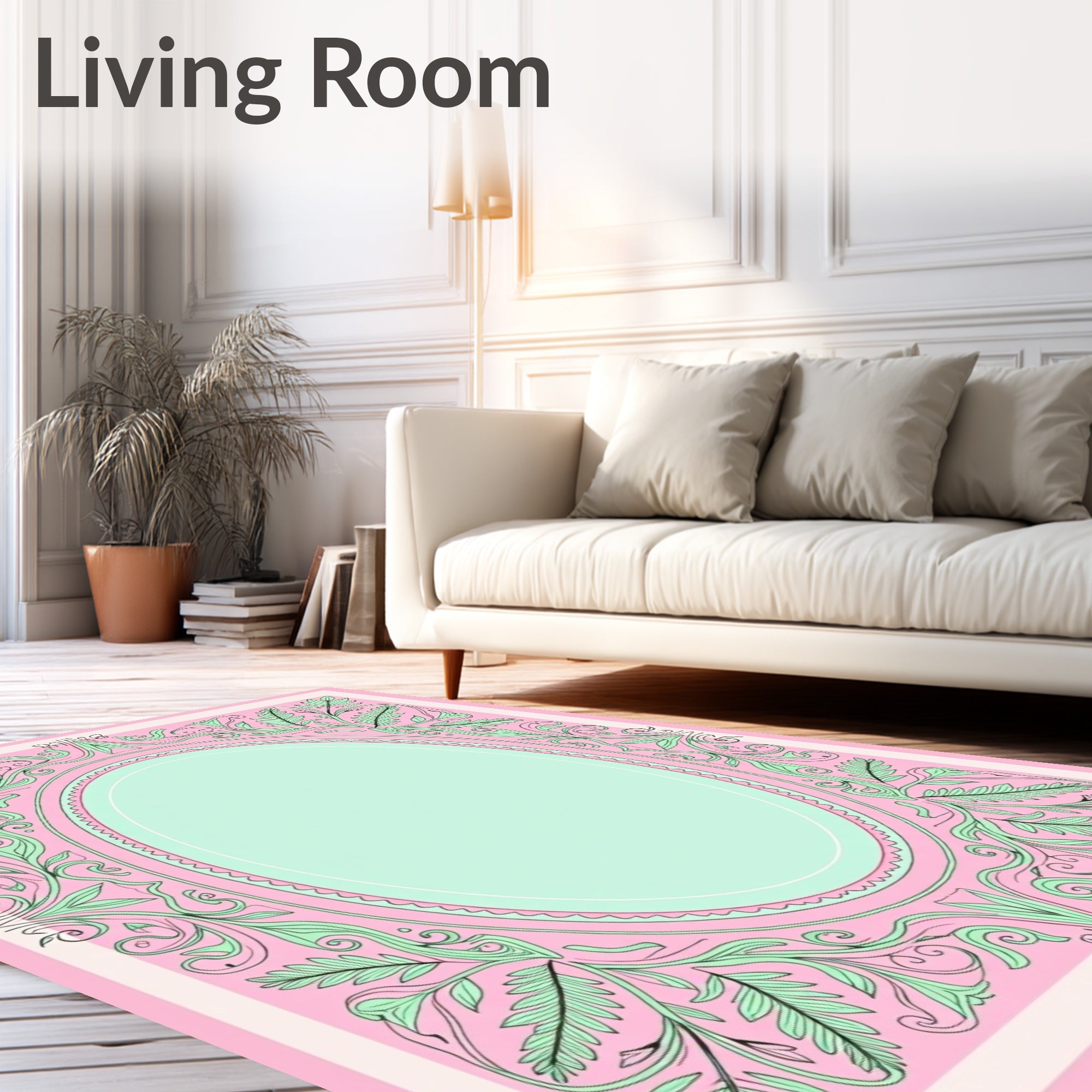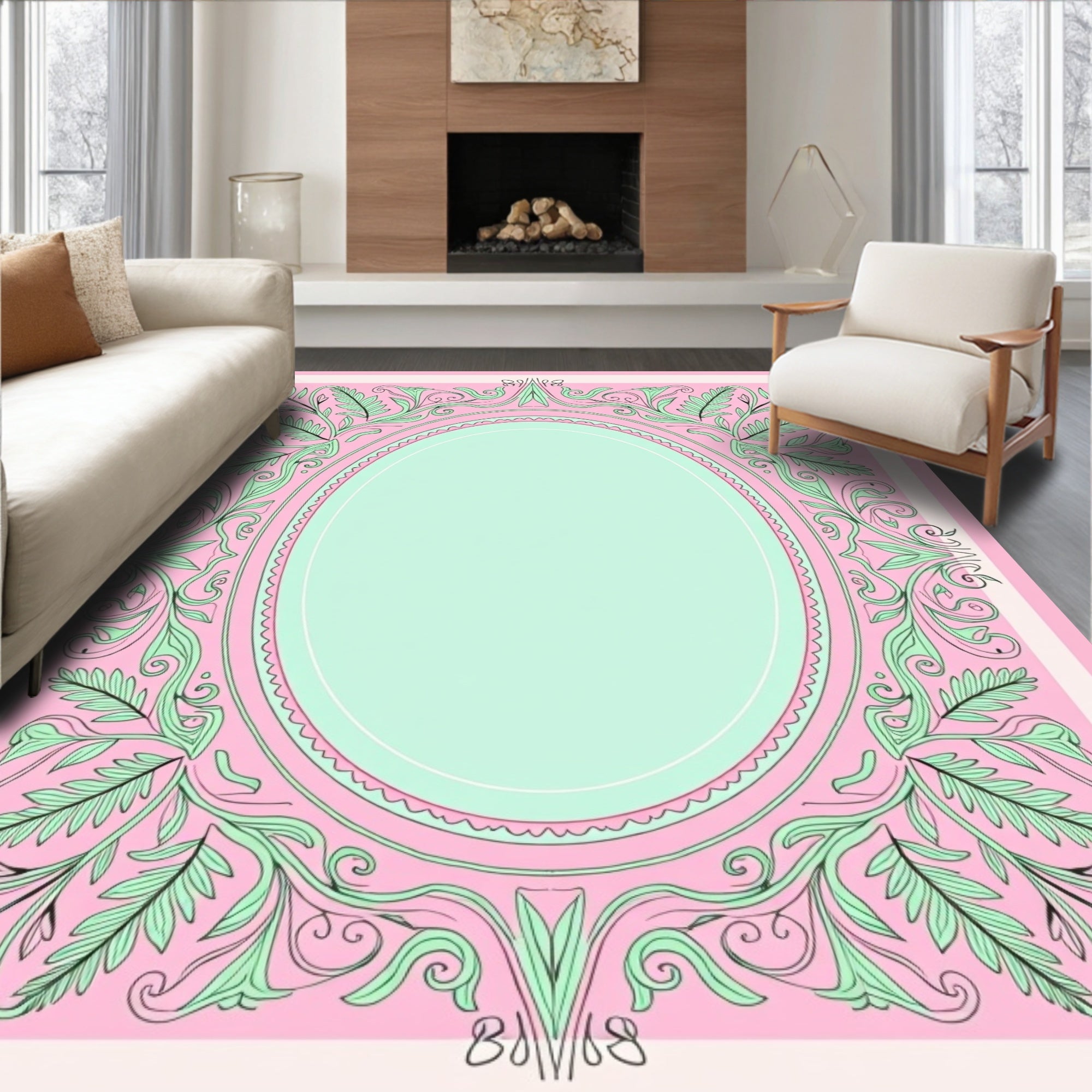 Ultra Soft Area Rug, Non Slip, Stain Resistant, Washable Area Rugs for Living Room, Bedroom, Botanical Fern Medallion with Flowing Vines and Leaf Motifs(Pink) Overview: