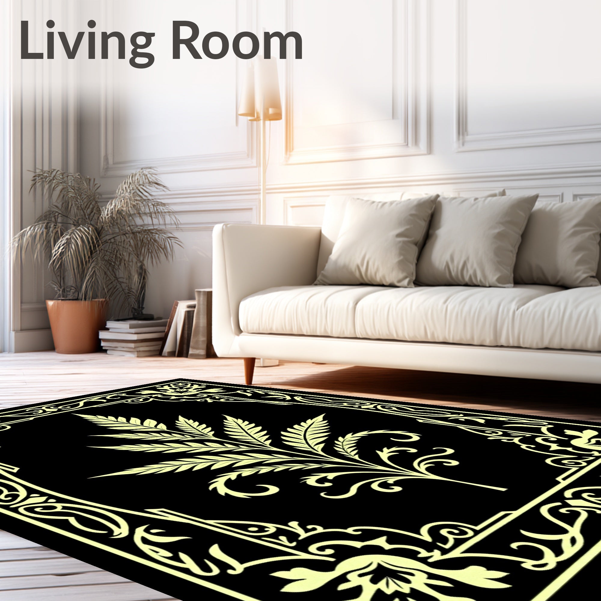 Ultra Soft Area Rug, Non Slip, Stain Resistant, Washable Area Rugs for Living Room, Bedroom, Botanical Fern Medallion with Intricate Scrollwork Motifs(Black) Overview: