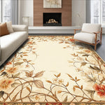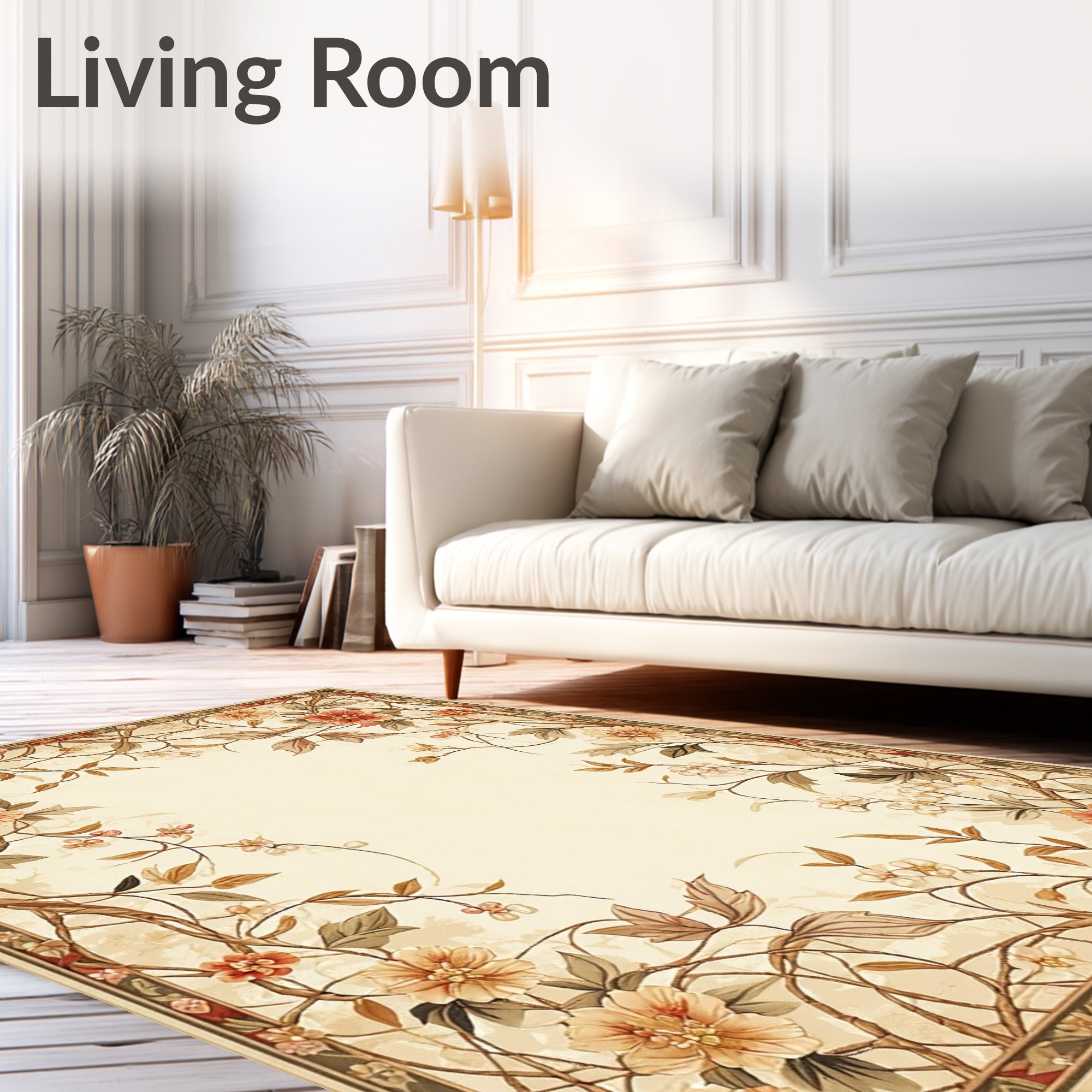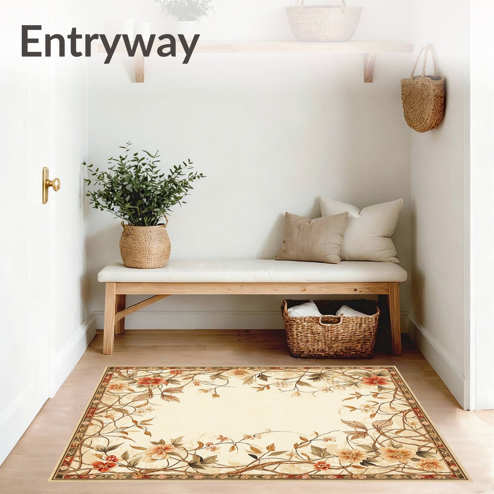 Ultra Soft Area Rug, Non Slip, Stain Resistant, Washable Area Rugs for Living Room, Bedroom, Botanical Scrollwork Transitional Floor Cover with Floral Accents(Beige) Overview: