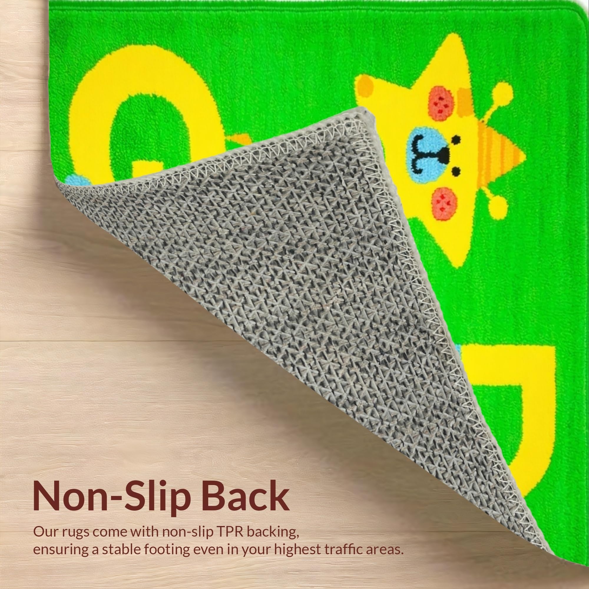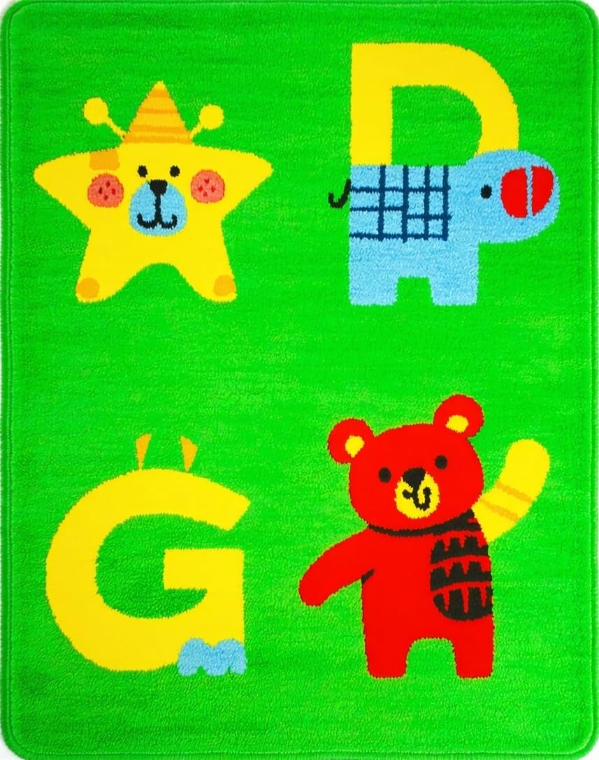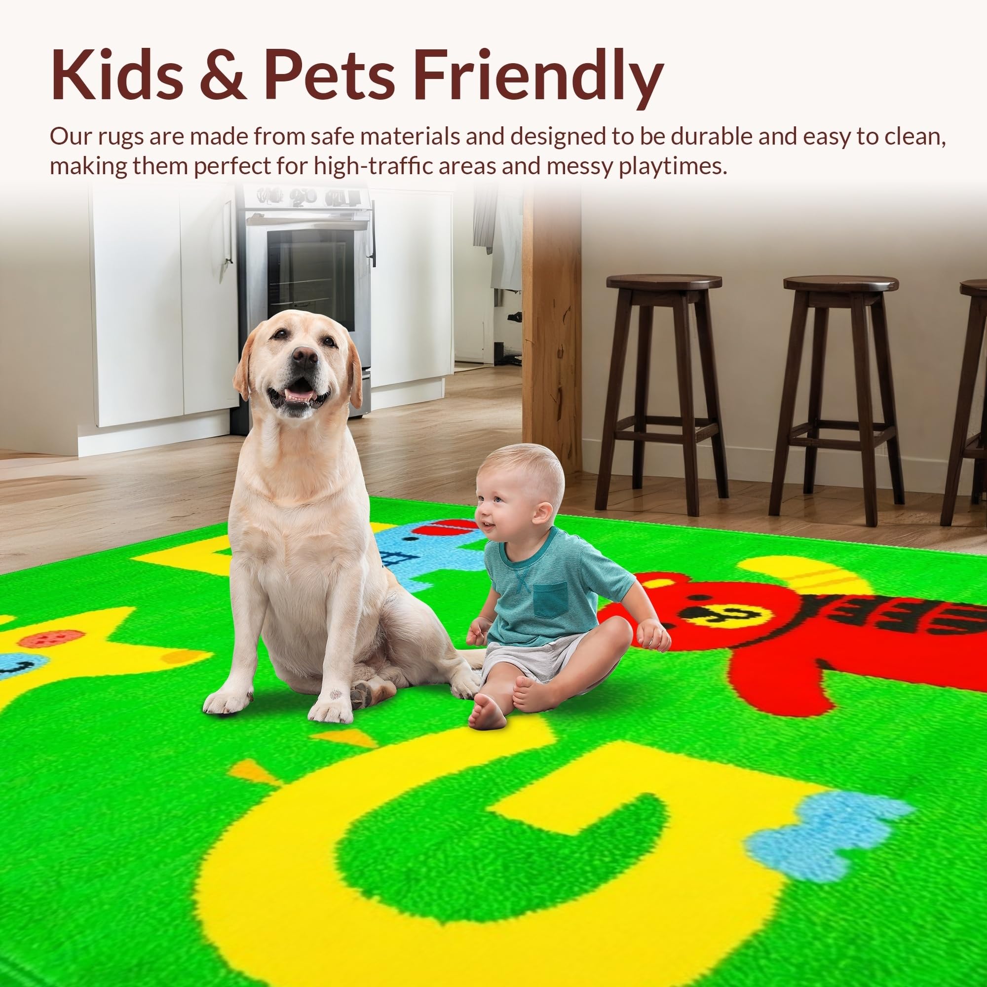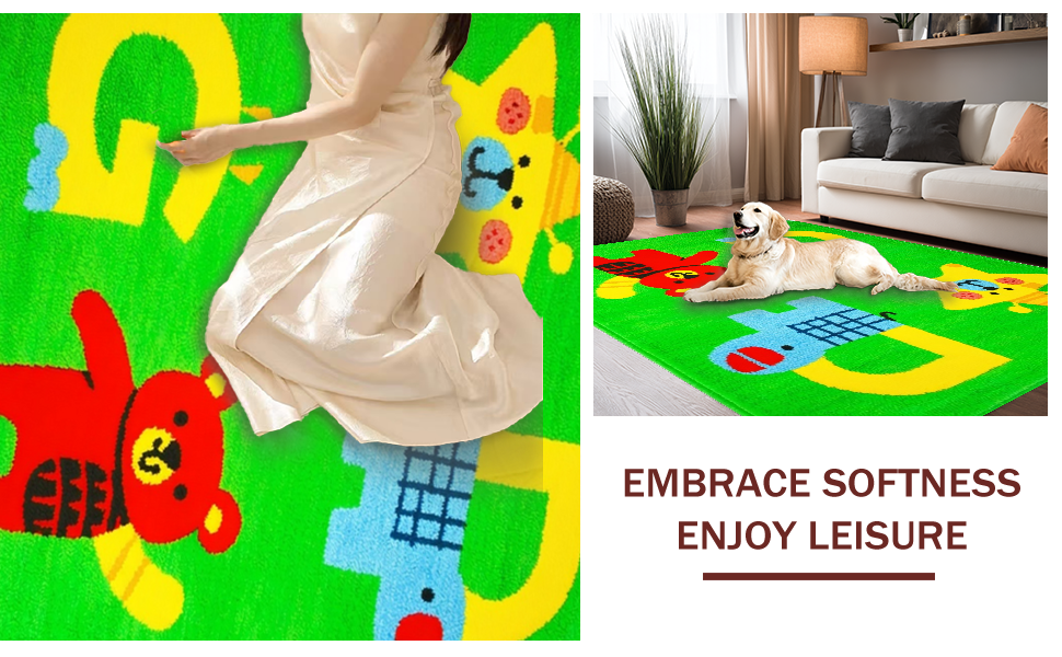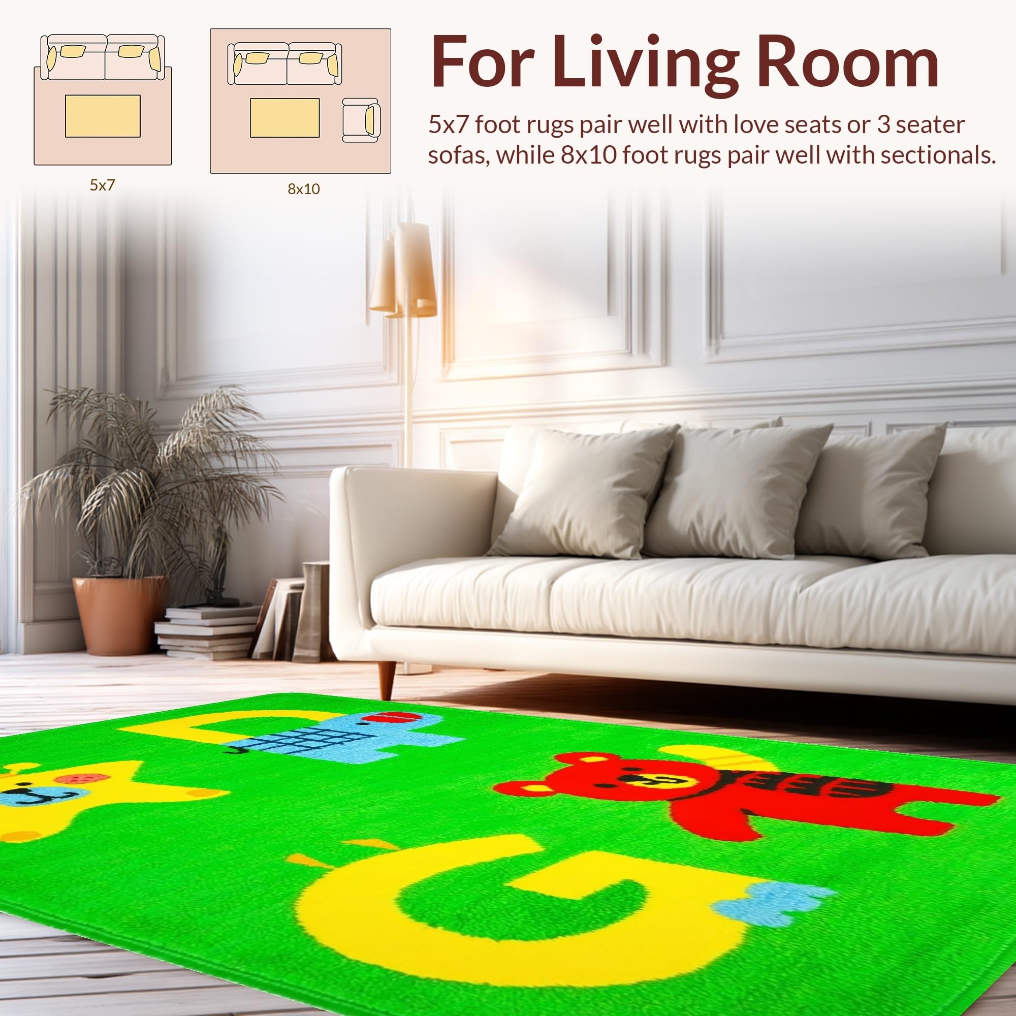 Ultra Soft Area Rug, Non Slip, Stain Resistant, Washable Area Rugs for Living Room, Bedroom, Bright Cheerful Animal Alphabet(Green) Overview: