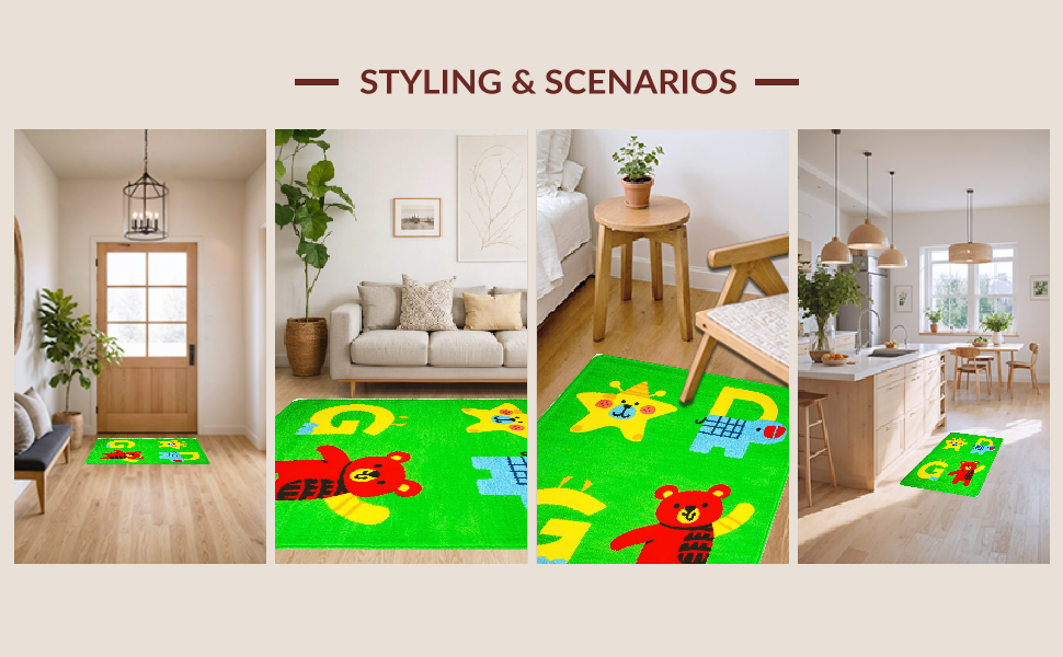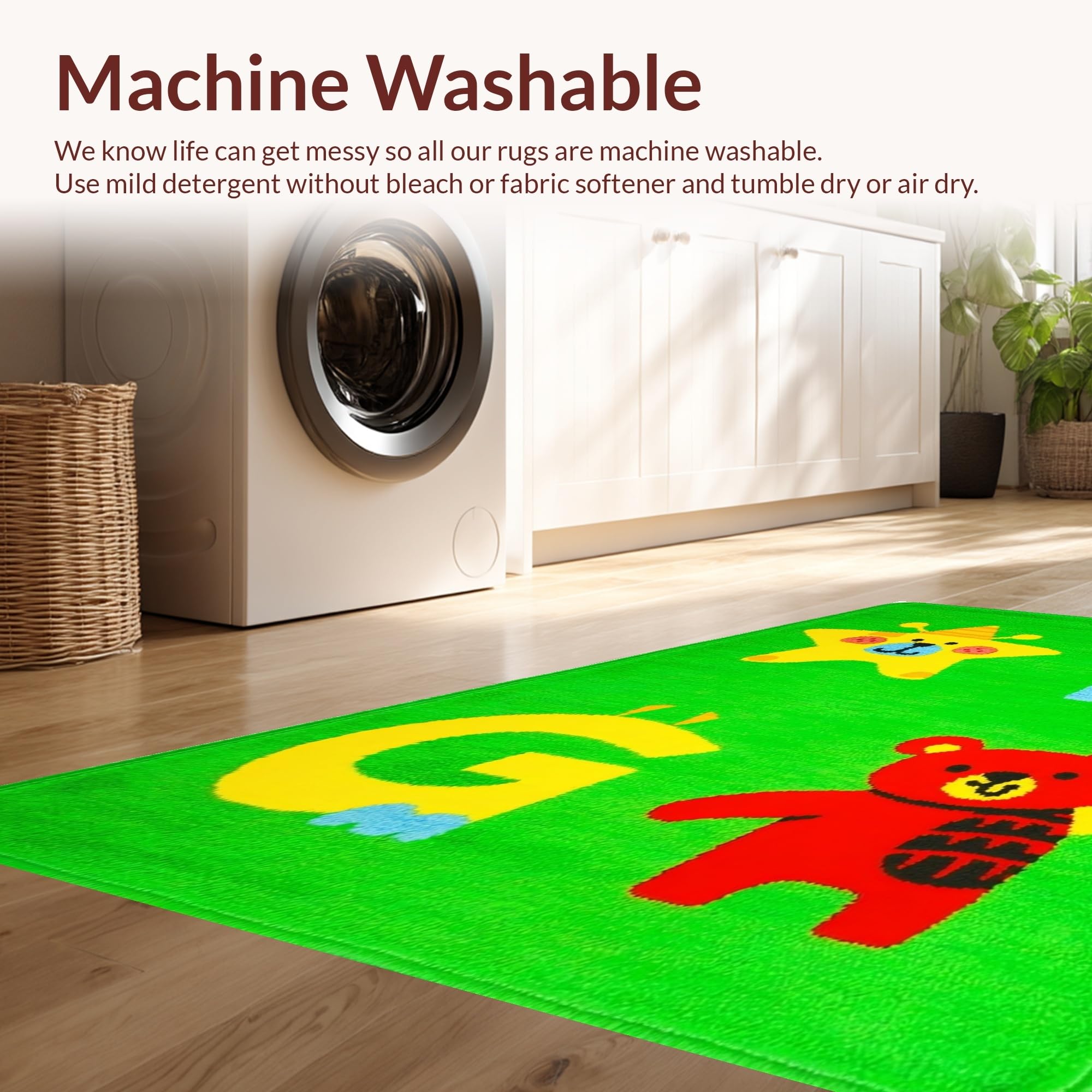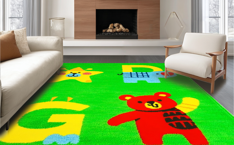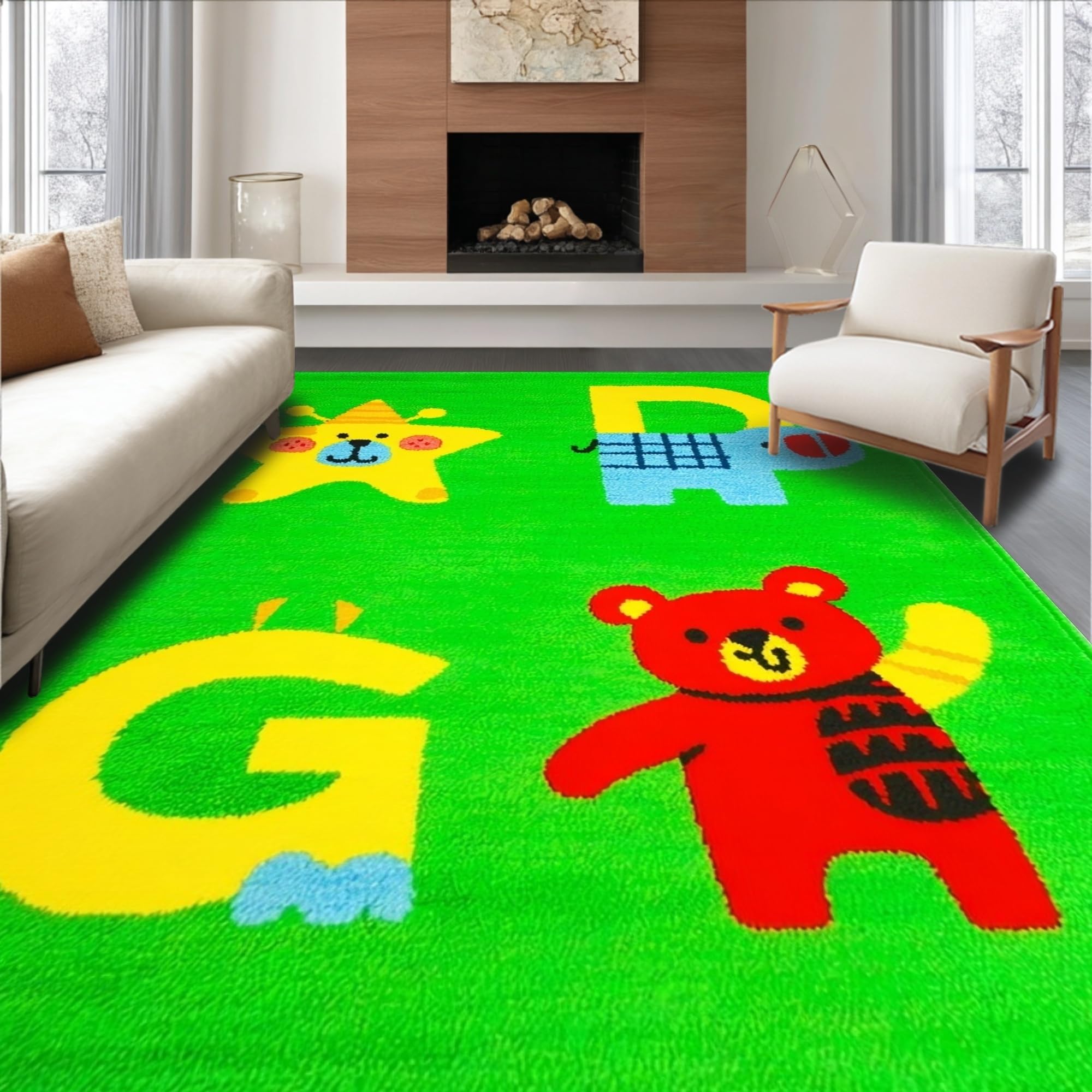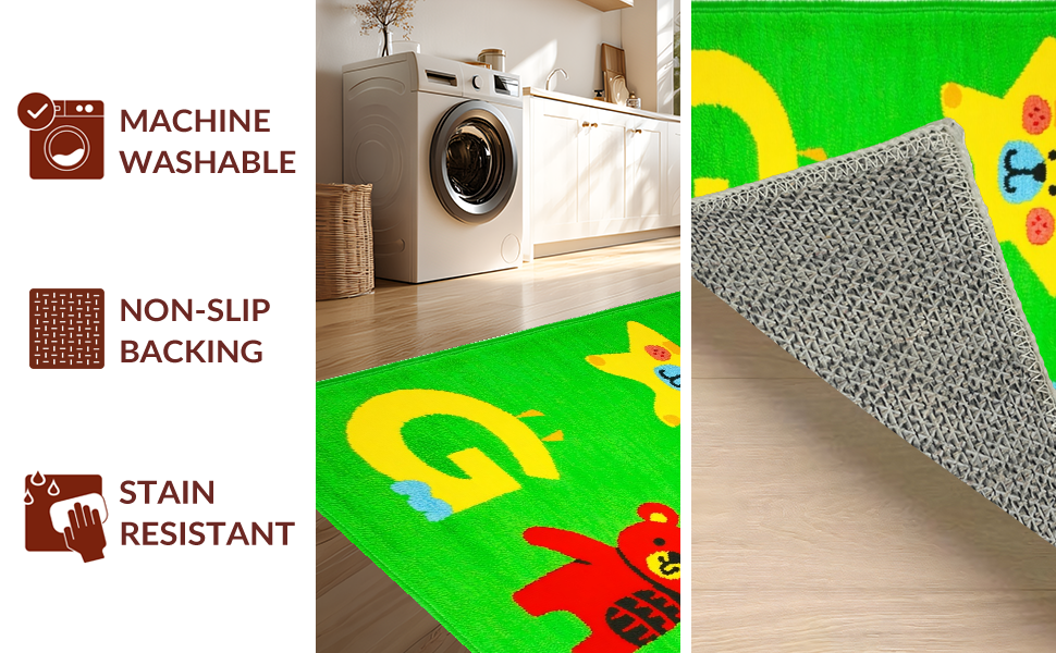 Ultra Soft Area Rug, Non Slip, Stain Resistant, Washable Area Rugs for Living Room, Bedroom, Bright Cheerful Animal Alphabet(Green) Overview: