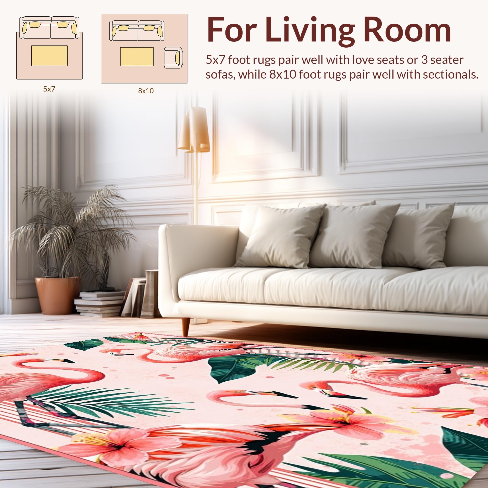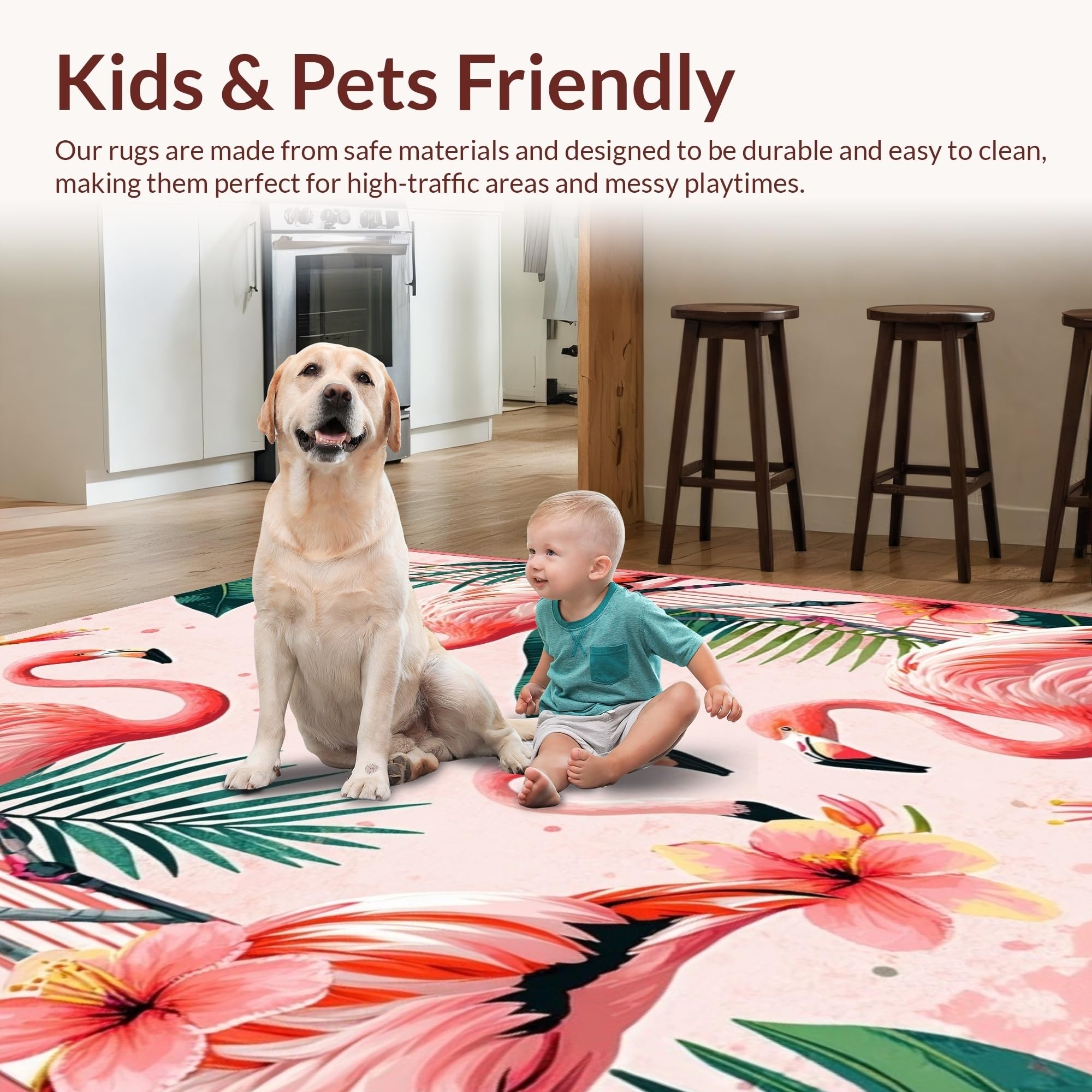 Ultra Soft Area Rug, Non Slip, Stain Resistant, Washable Area Rugs for Living Room, Bedroom, Bright Playful Flamingo Illustration(Pink) Overview: