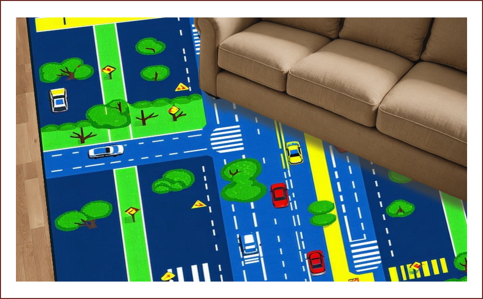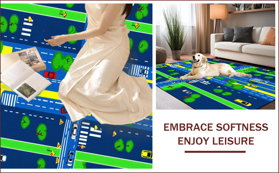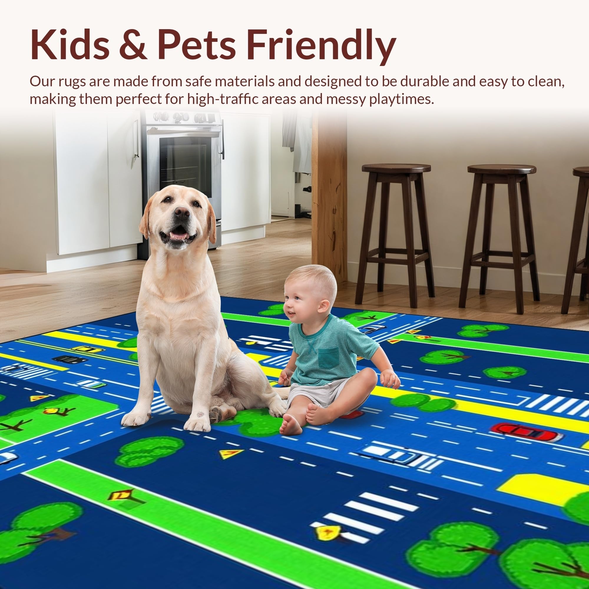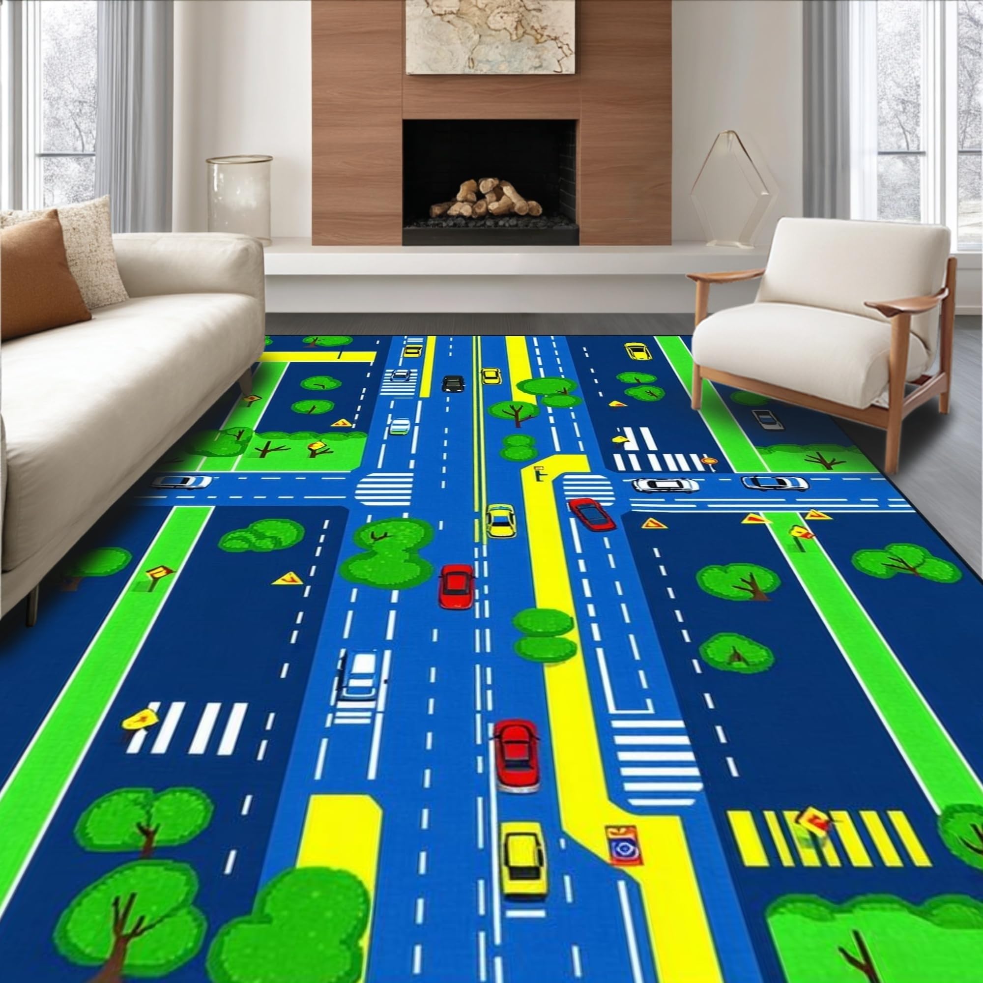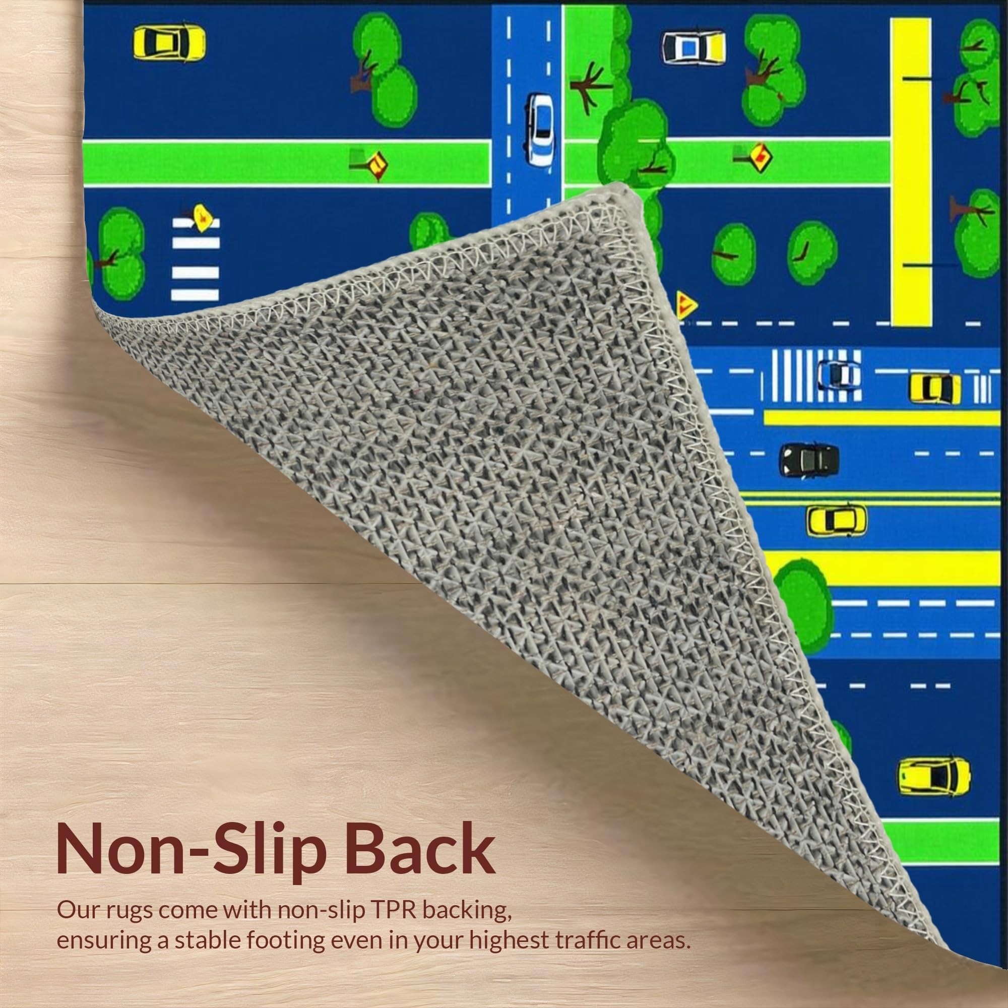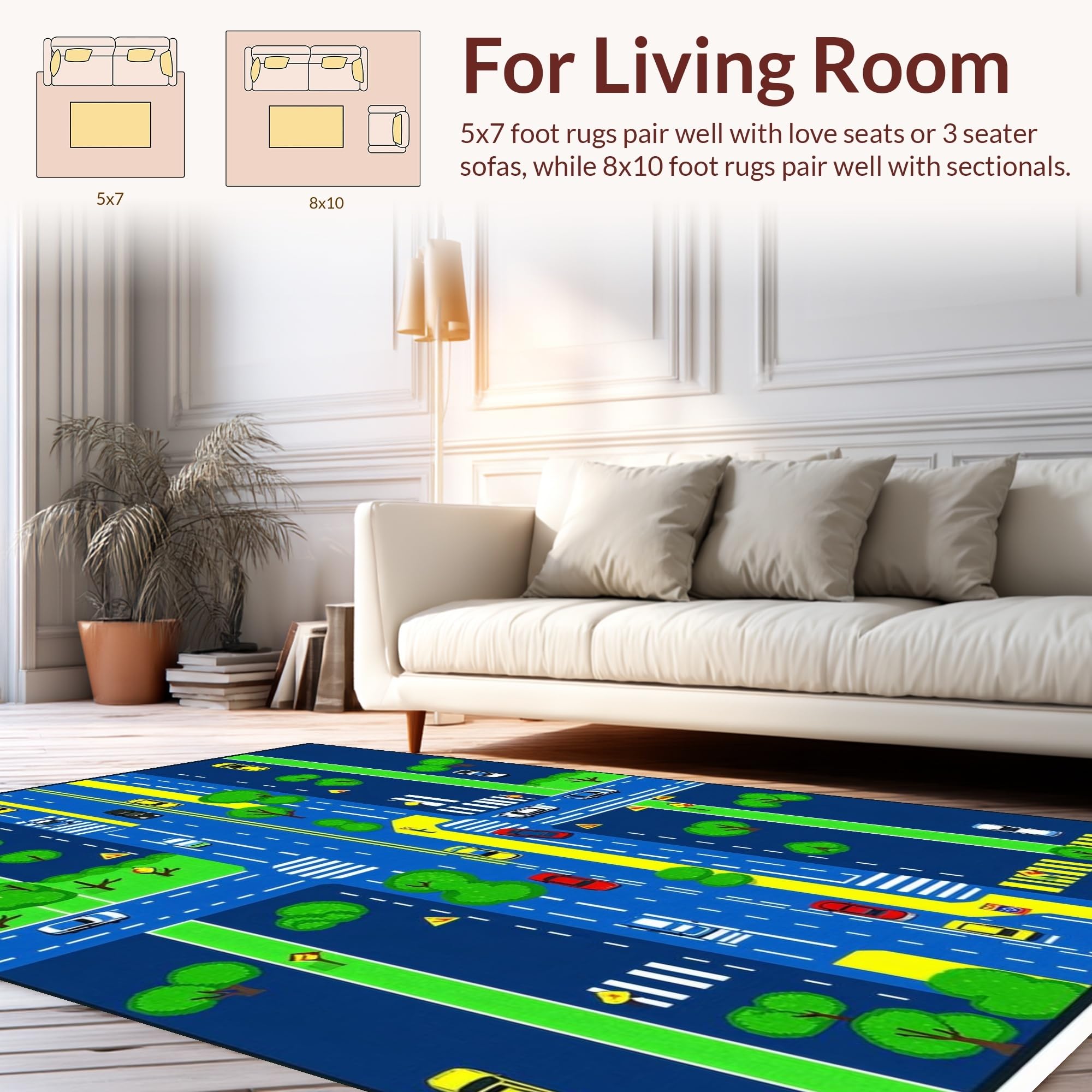 Ultra Soft Area Rug, Non Slip, Stain Resistant, Washable Area Rugs for Living Room, Bedroom, Brightly Illustrated Metropolitan Adventure(Blue) Overview: